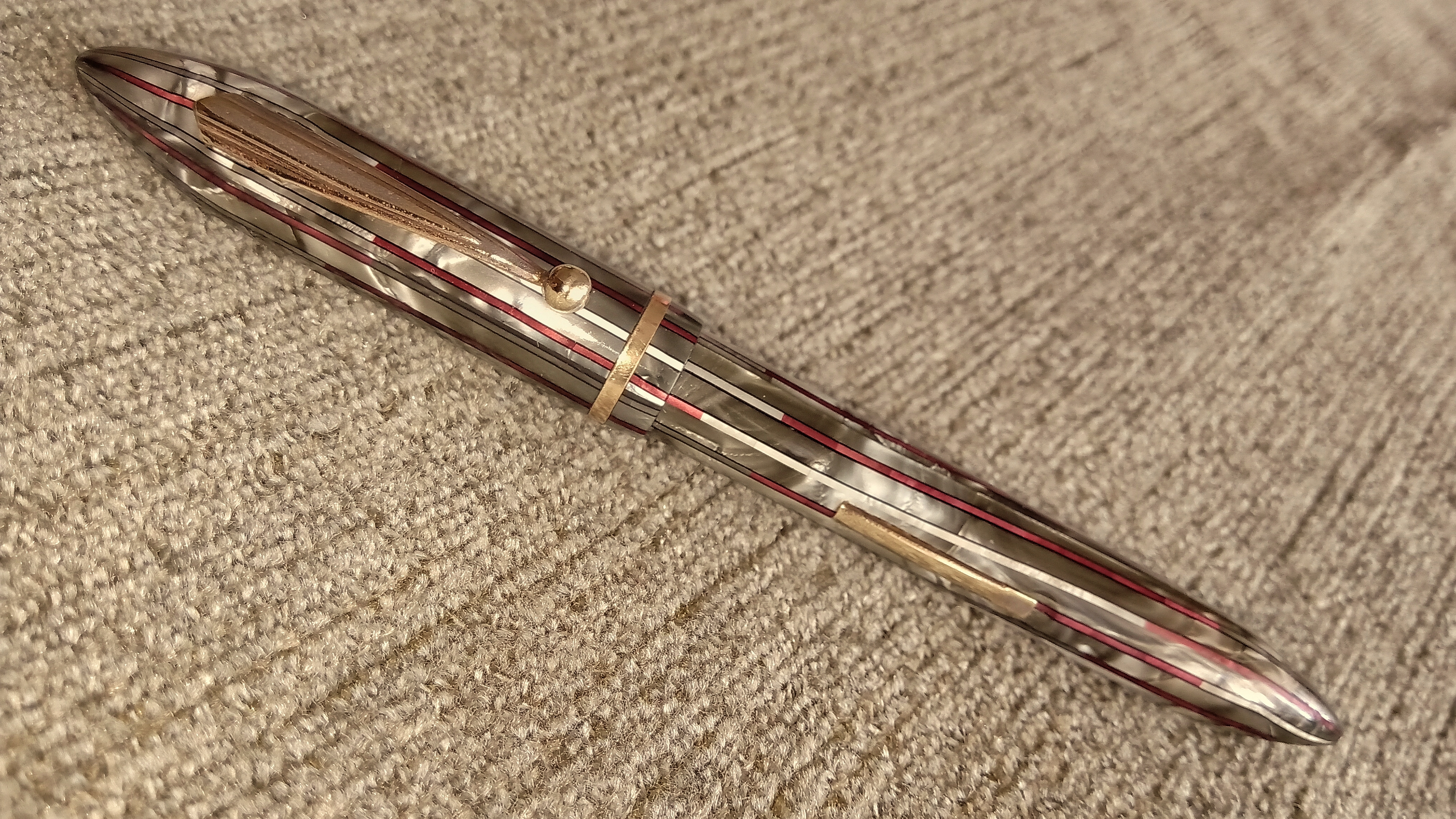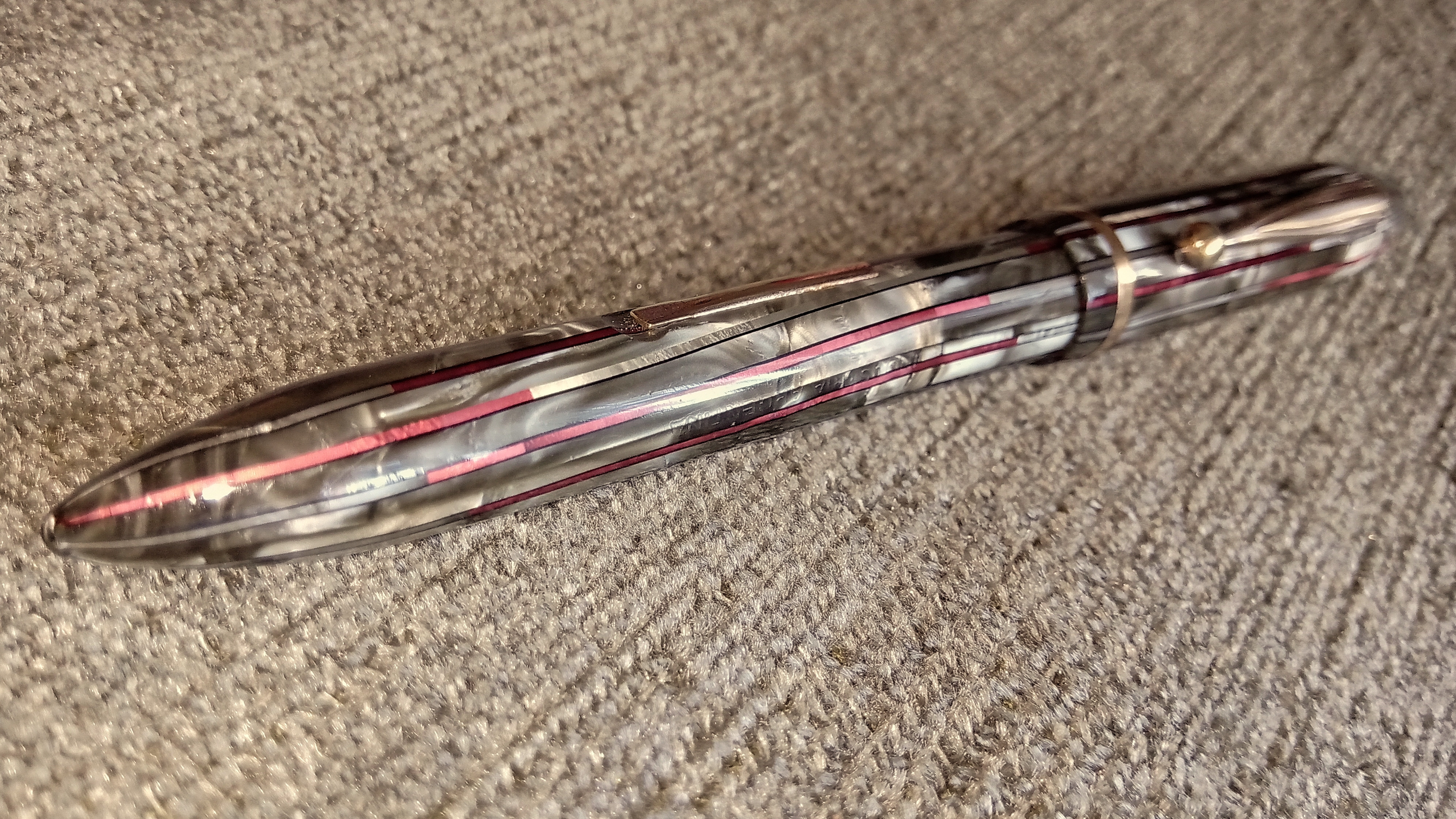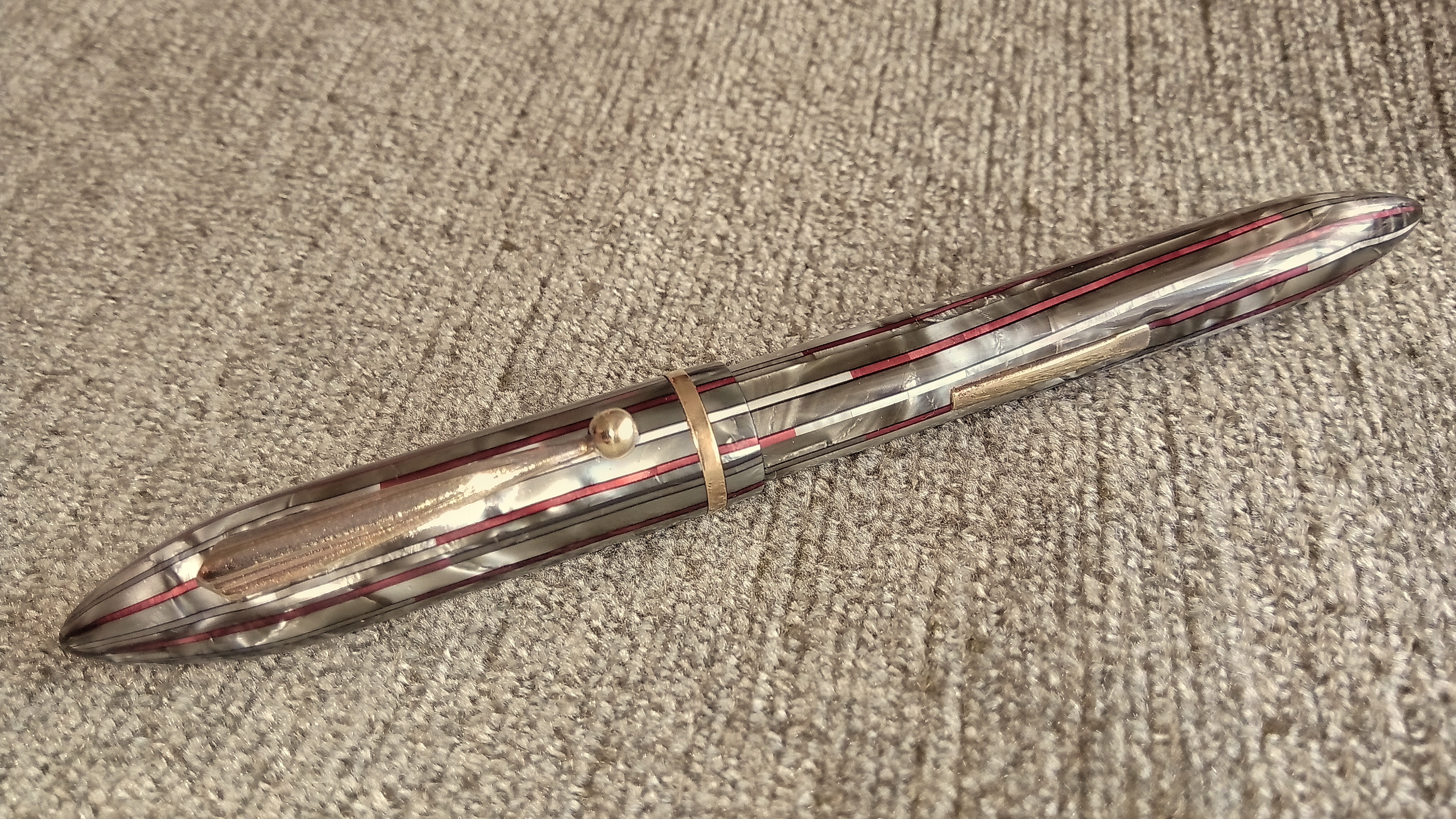 Bellissima imitazione del design della Sheaffer's Balance, degli anni 30/40 circa, dove anche in questo caso appare solo l'impronta dell'origine, con sistema di caricamento a leva, pennino aperto non originale Osmiroid placcato oro 18k, impugnatura in ebanite, corpo e capuccio in celluloide laminato marmorizzato in argento perlato e scanalature longitudinali in argento e bordeaux, clip levetta e fascia del cappuccio che all'epoca erano cromati ma non ressero al tempo...