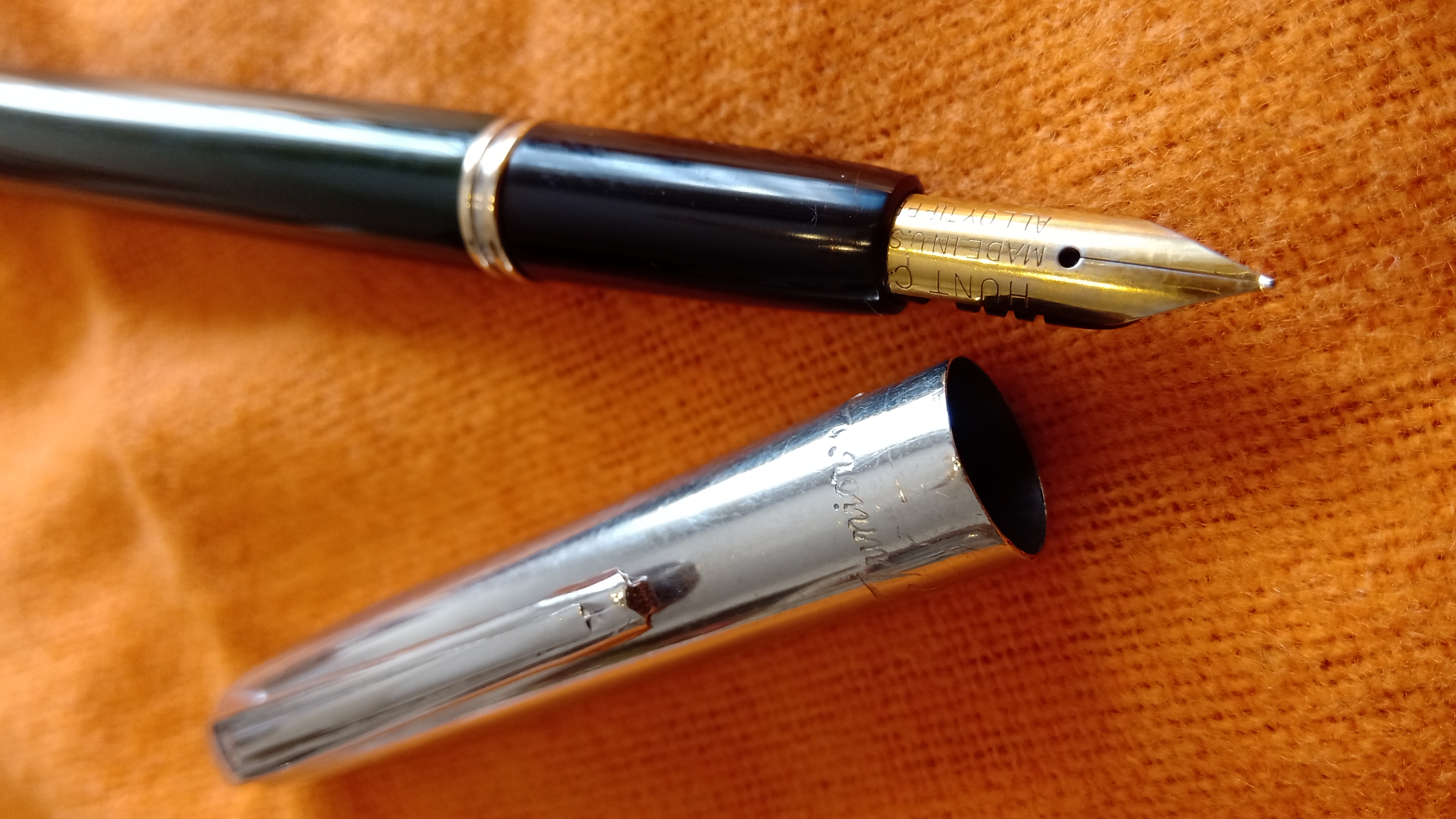 Più un caso dove non si conosce la marca ma appare l'impronta d'origine... Una penna stilografica degli anni 50/60 circa, con impugnatura in ebanite nera e corpo in galatite grigia, sistema di caricamento aerometrico, clip e cappuccio cromati, ed un non originale pennino ricoperto in oro con marchio Hunt Co. prodotto negli U.S.A....