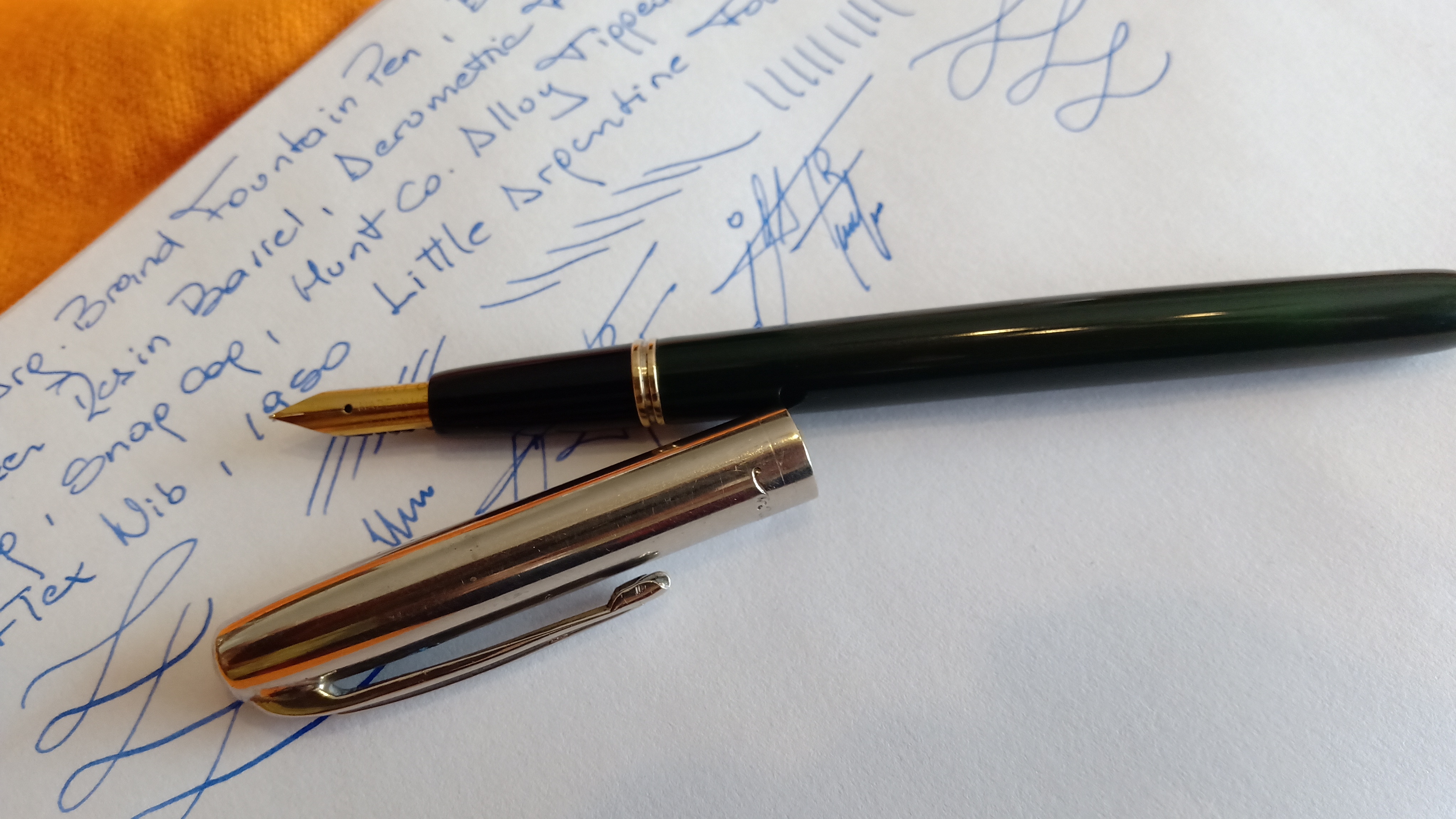 Quest'altra marca Junior's degli anni 50 con impugnatura in ebanite nera e corpo in galatite verde, sistema di caricamento aerometrico, clip e cappuccio cromati e pennino a vista non originale marca Hunt Co. dorato prodotto negli U.S.A., una bella piccola penna stilografica...