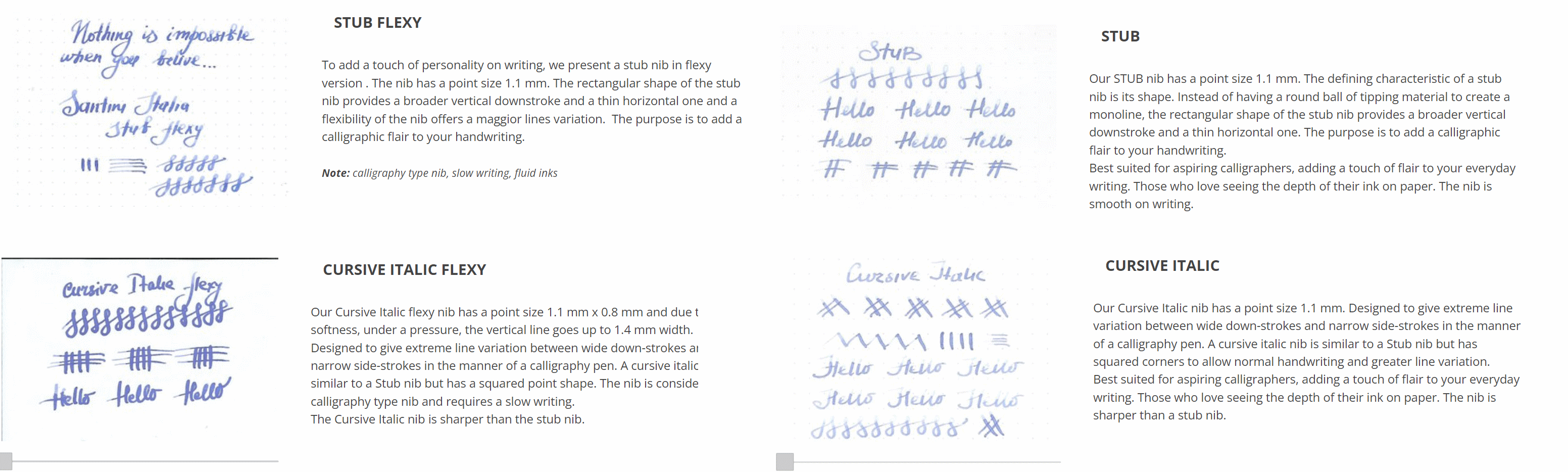 In questa pagina nella parte superiore viene descritto un pennino flessible per italico https://www.santini-italia.com/nib-size-guide.html ma poi nelle caretteristiche il pennino italico non viene più definito flessibile. Quello che cerco io è il "Cursive Italic" oppure no? Grazie per l'aiuto.