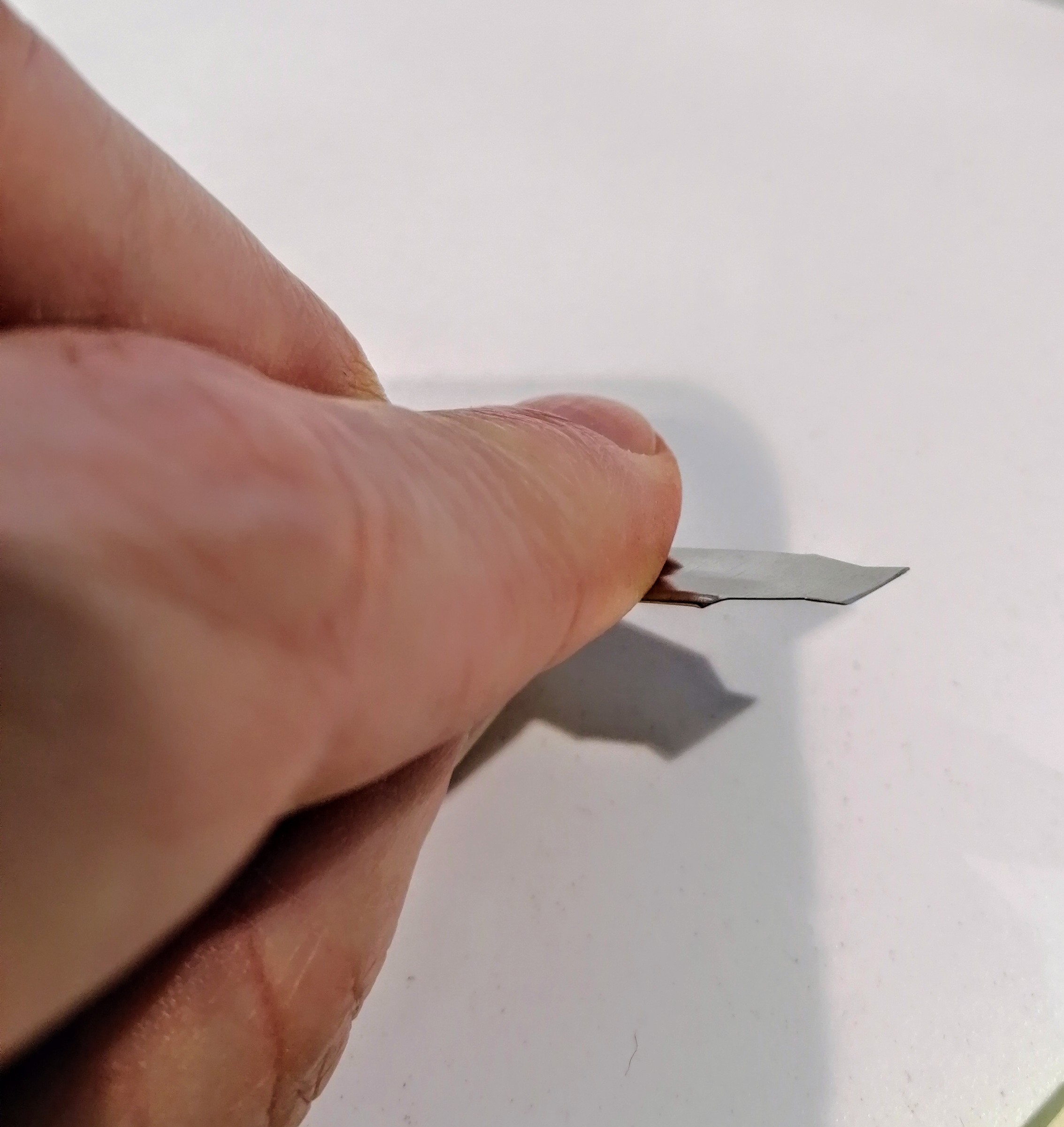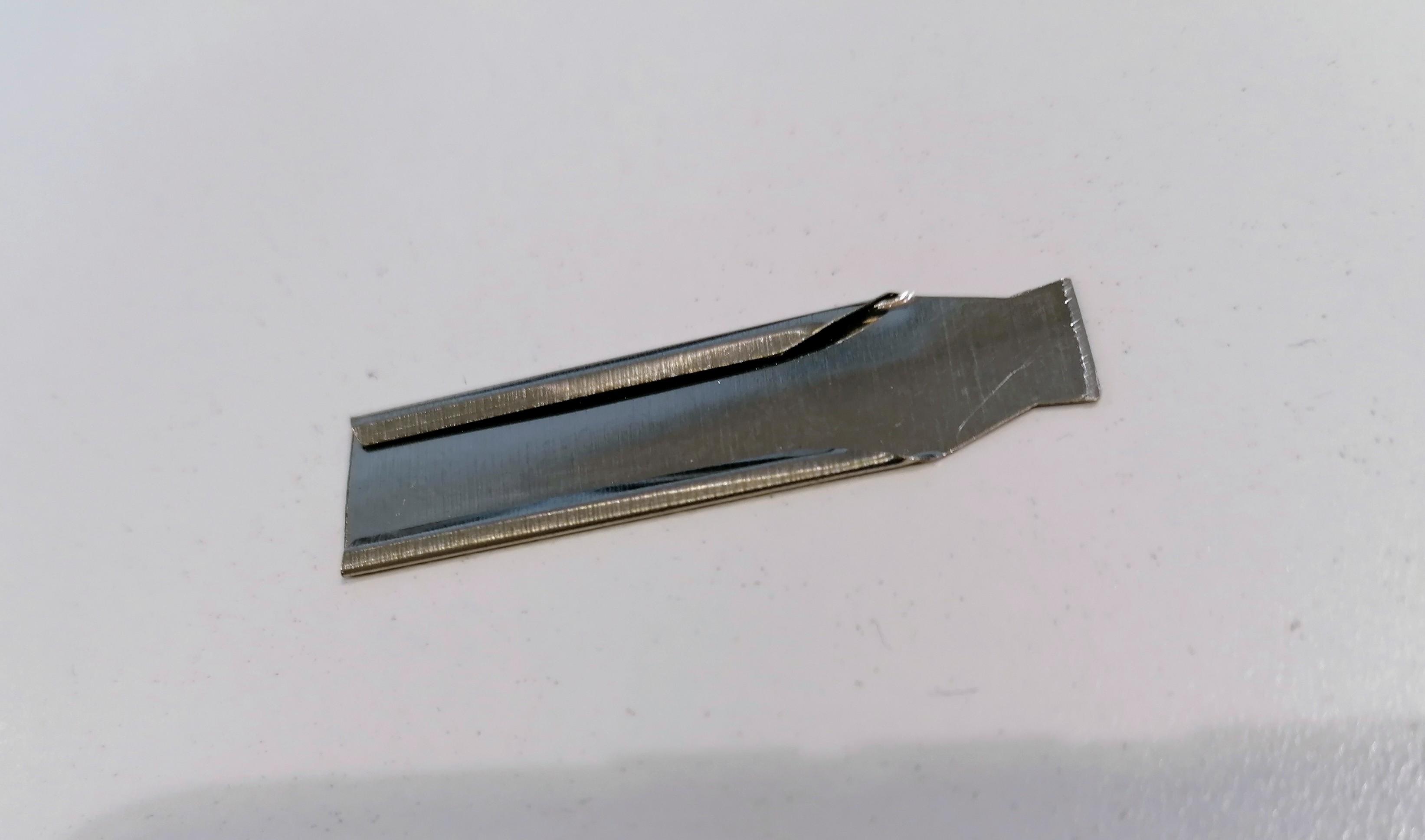 E' un lamierino da circa 5/10 di millimetro (mezzo millimetro) a occhio, con la parte finale affilata come una lametta, quindi penso che andrebbe infilato per circa mezzo centimetro al massimo, o comunque usarlo in modo che solo la parte affilata finisca fra i rebbi.