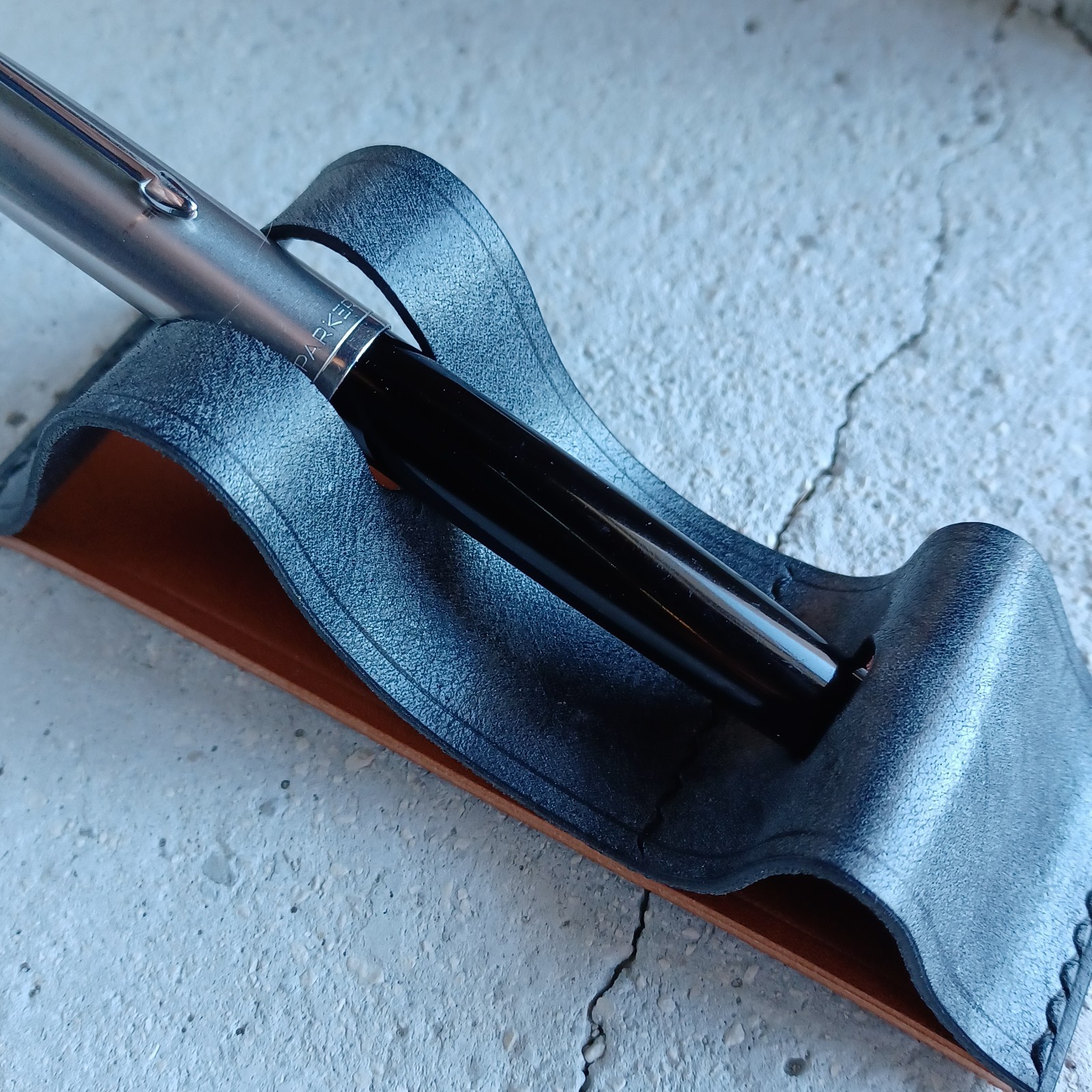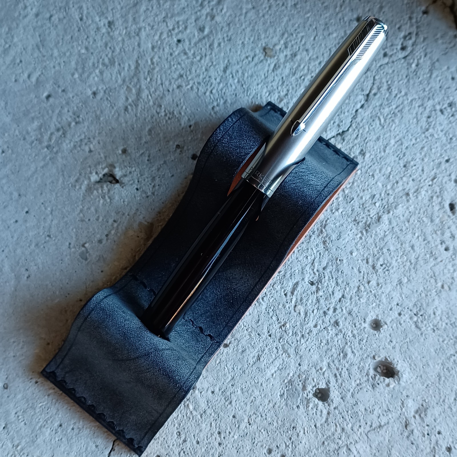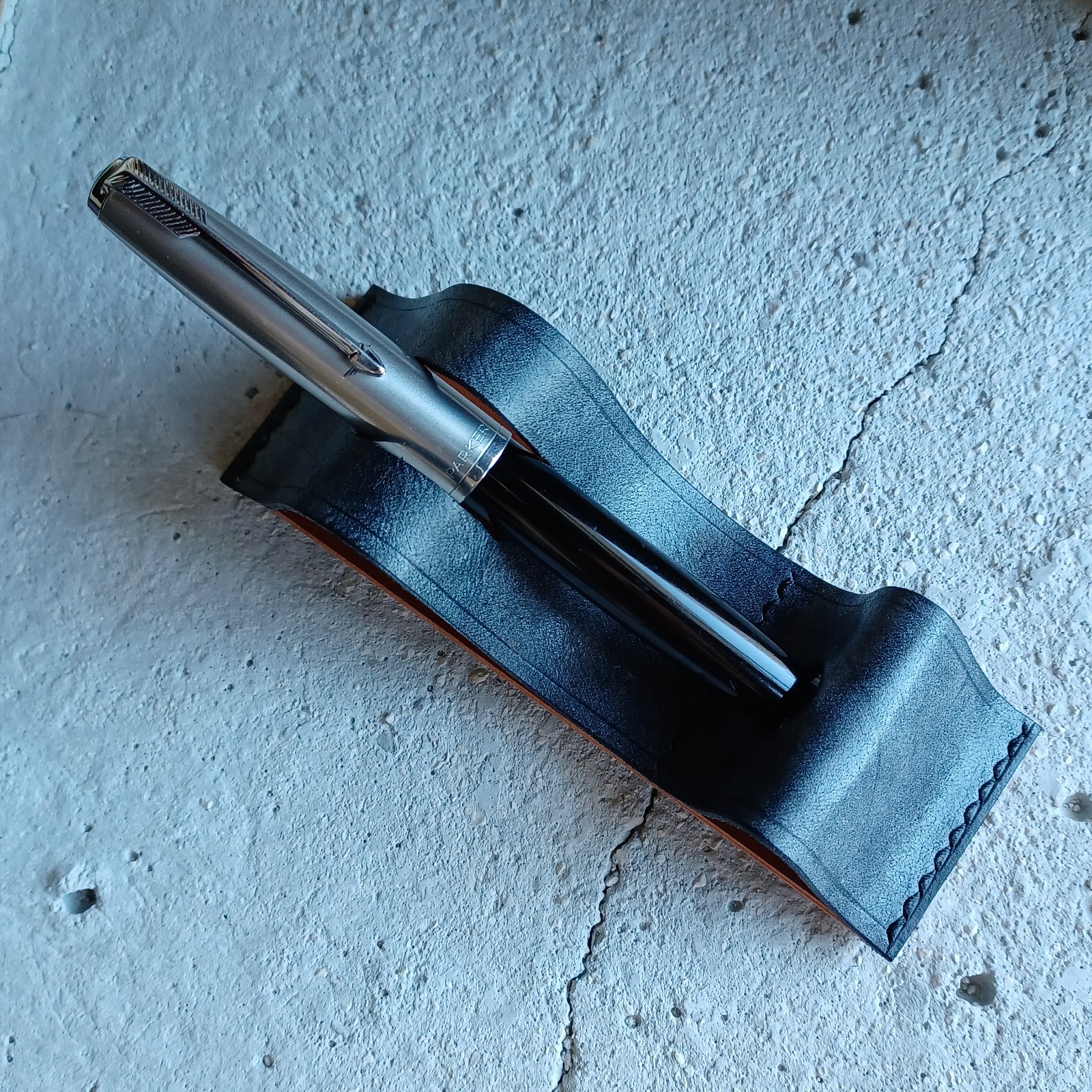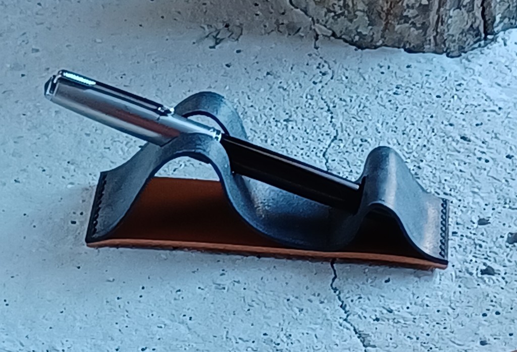 Da questa foto si vede meglio che come da te osservato è un po' corto e basso. Nella versione finale pensavo di usare pelle molto rigida così da poter alzare la parte lato cappuccio e, mantenendo le stesse dimensioni della base, far stare la penna in posizione più verticale, appoggiandola vicino alla sommità del cappuccio.
