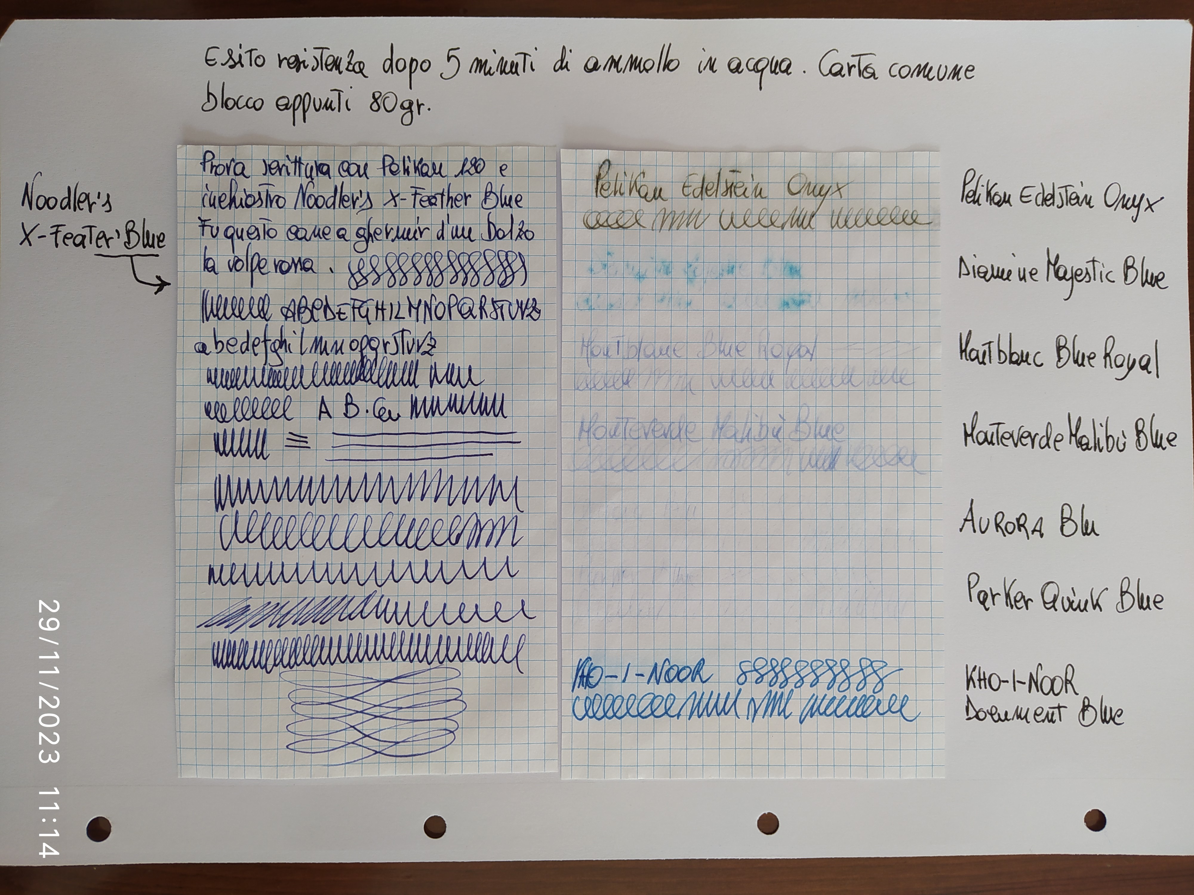 Vuoi perchè la giornata era uggiosa e non avevo voglia di fare alchunchè, vuoi perchè un amico (convertitosi all'uso della stilografica) mi ha chiesto di indicargli qualche inchiostro per uso su documenti, mi sono messo a fare un piccolo test "casalingo" su alcuni inchiostri in mio possesso per vedere la loro resistenza all'acqua. Ho avuto delle conferme sulla bontà di buona parte dei Noodler's (eccezionale l'X-Feather Blu che è rimasto pressochè immutato dopo la prova). Ma ci sono state anche delle sorprese: in parte sul KHO-I-NOOR Document Blue (il migliore secondo me nel rapporto qualità/prezzo) ed assoluta nel Pelikan Edelstein Onyx, un inchiostro da me sempre bistrattato perchè grigio molto scuro, che invece la sua inaspettata buona resistenza all'acqua lo ha reso, insieme alla sua ottima fruibilità, di nuovo ben accetto.