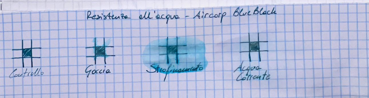 La resistenza all’acqua dell’AirCorp Blue Black è molto simile a quella del KOH-I-NOOR, forse un po’ meglio. La parte resistente all’acqua è quella nera, mentre il blu si spande. Il colore non è molto diverso dal Baltimore Canyon, forse solo un poco più scuro. Non ti perdi niente a non averlo. Sarebbe un doppione