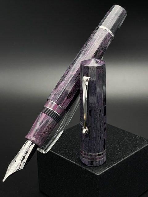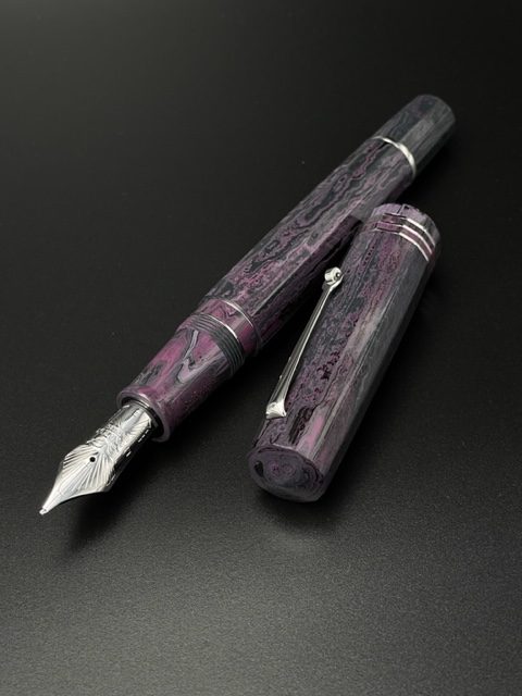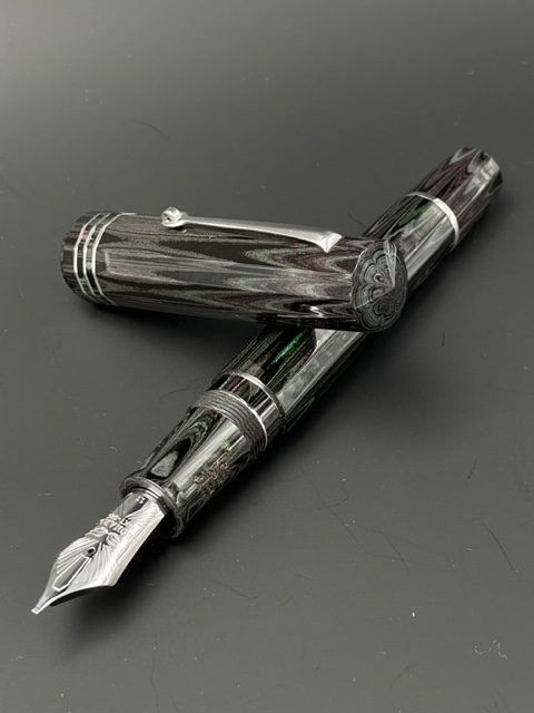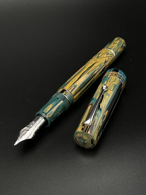 Il pennino è misura #8 14kt con alimentatore in ebanite e la penna è a carica a stantuffo realizzato da Leonardo.
