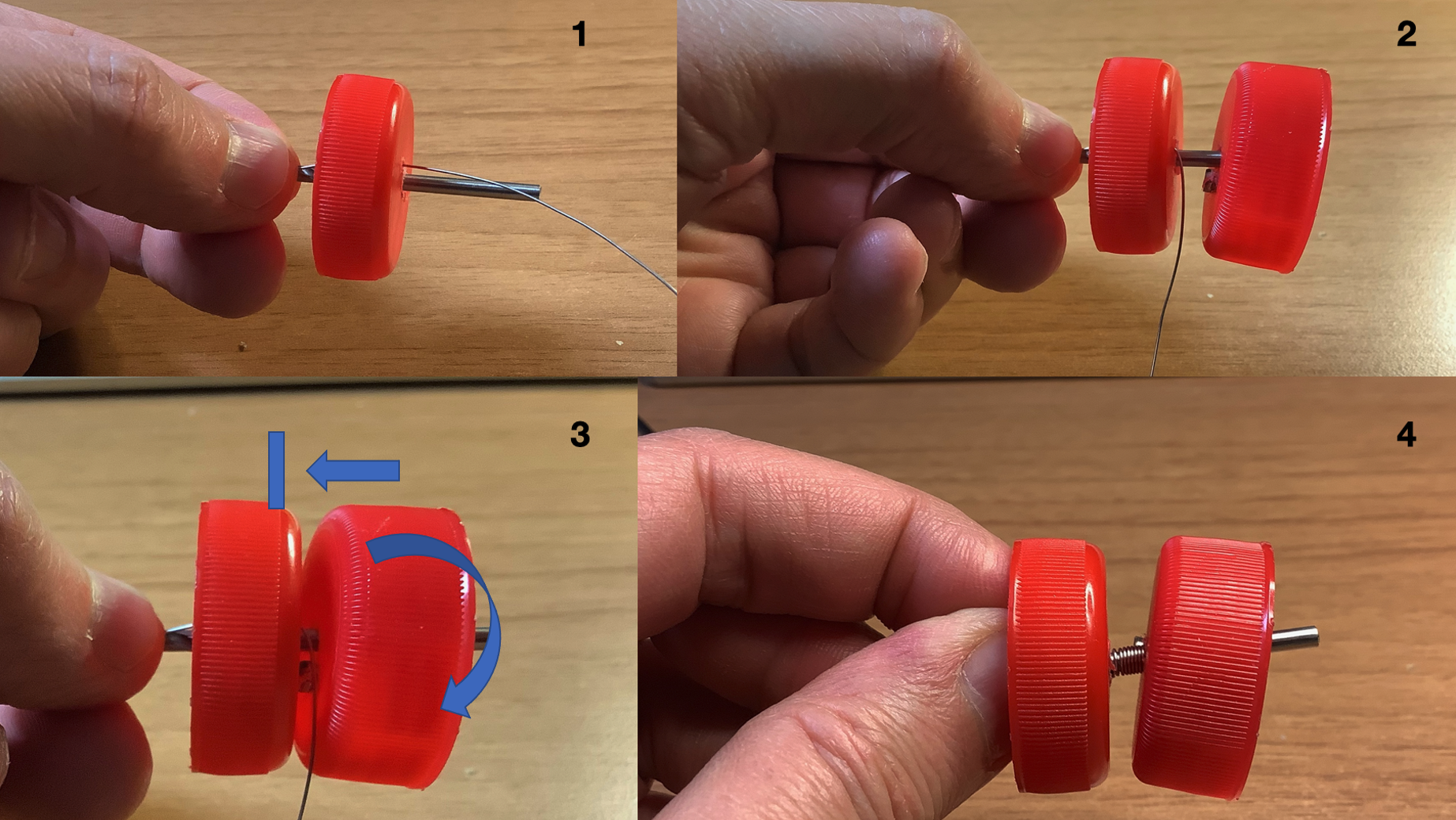 Poi prendo una punta da trapano o qualcosa di simile con il diametro della molla , la infilo nel foro centrale del tappo, infilo il filo di acciaio nel piccolo foro accanto e con il pollice e l'indice tengo fermo il filo all'asta della punta da trapano (1). Faccio a mano due o tre giri del filo di acciaio (2) e poi inserisco il secondo tappo (quello con la vite) sulla punta da trapano e inizio a girare il tappo con fissata la vite , tenero leggermente premuto verso l'altro tappo (3). In questo modo la vite forza il filo di acciaio ad arrotolarsi sulla punta del trapano con spire belle serrate ed uniformi (bisogna comunque prenderci un poco la mano le prime volte) e poi fine del filo e fine del gioco (4).