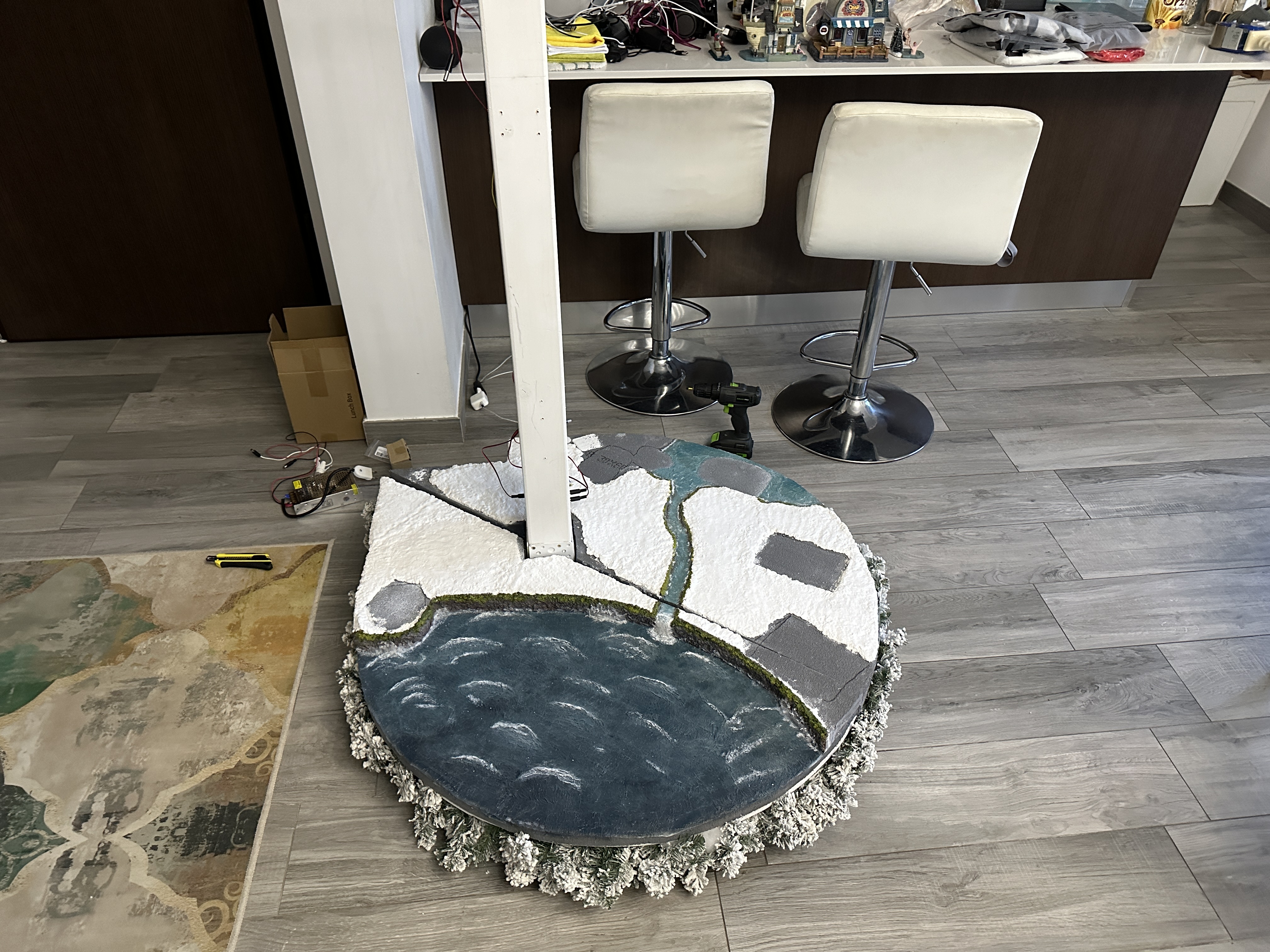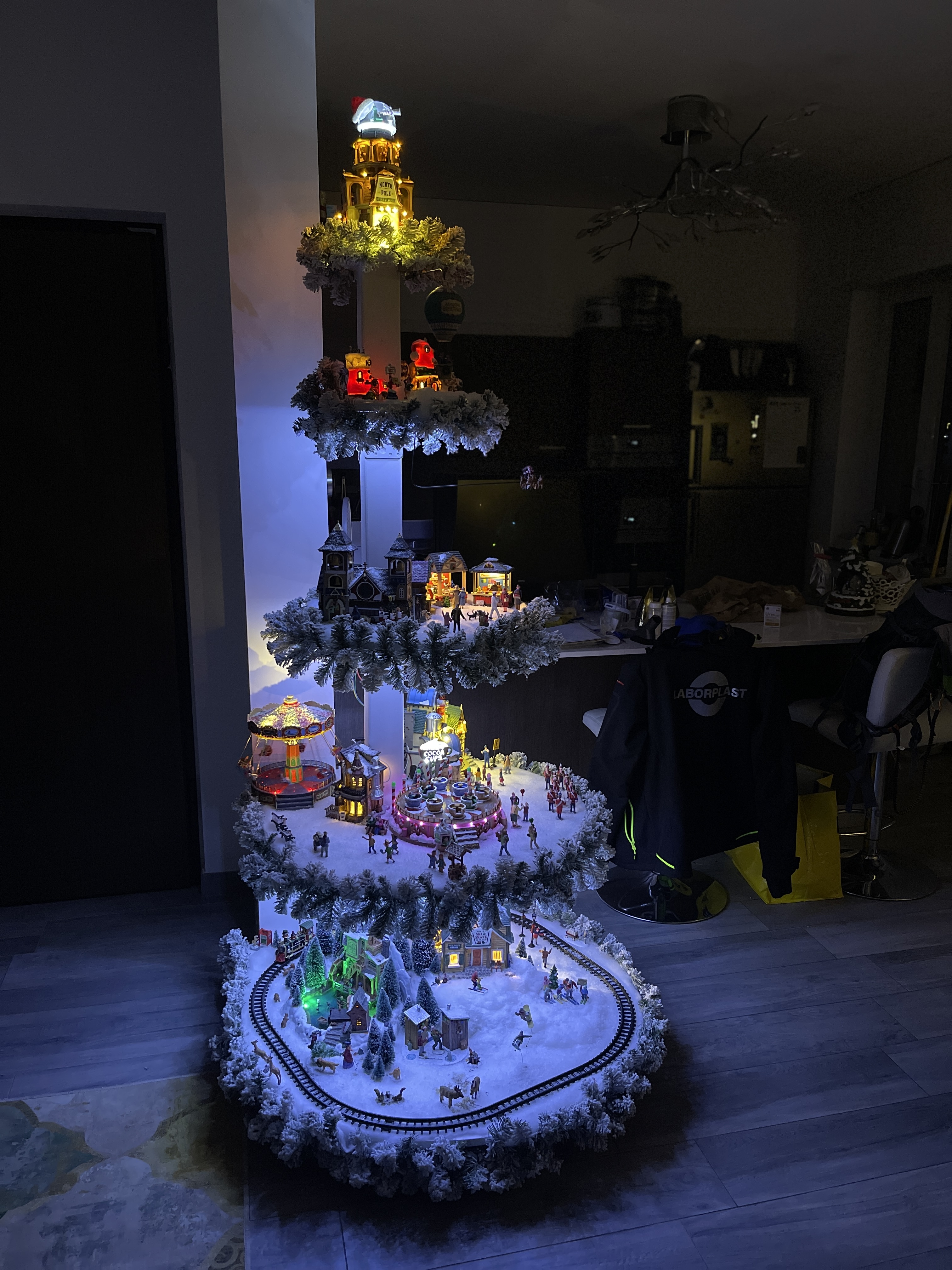 L’anno scorso ci siamo limitati allo stand coperto da un “tappeto” di ovatta bianca a simulare la neve. Da quest’anno siamo entrati un po’ più nel mondo del “dioramismo” per riprodurre un ambientazione più realistica. Il programma per il futuro è quello di produrre l’ambientazione per tutti i piani e, nel frattempo, prepararne anche per gli altri periodi dell’anno (vacanze estive, Halloween, Primavera/Pasqua/Carnevale…). Il meglio che si potrebbe fare è trasformare l’albero in Yggdrasil, l’albero del mondo della mitologia norrena, rappresentando sui vari piani gli altri mondi (Jotunheim, Niflheim, Asgard…)