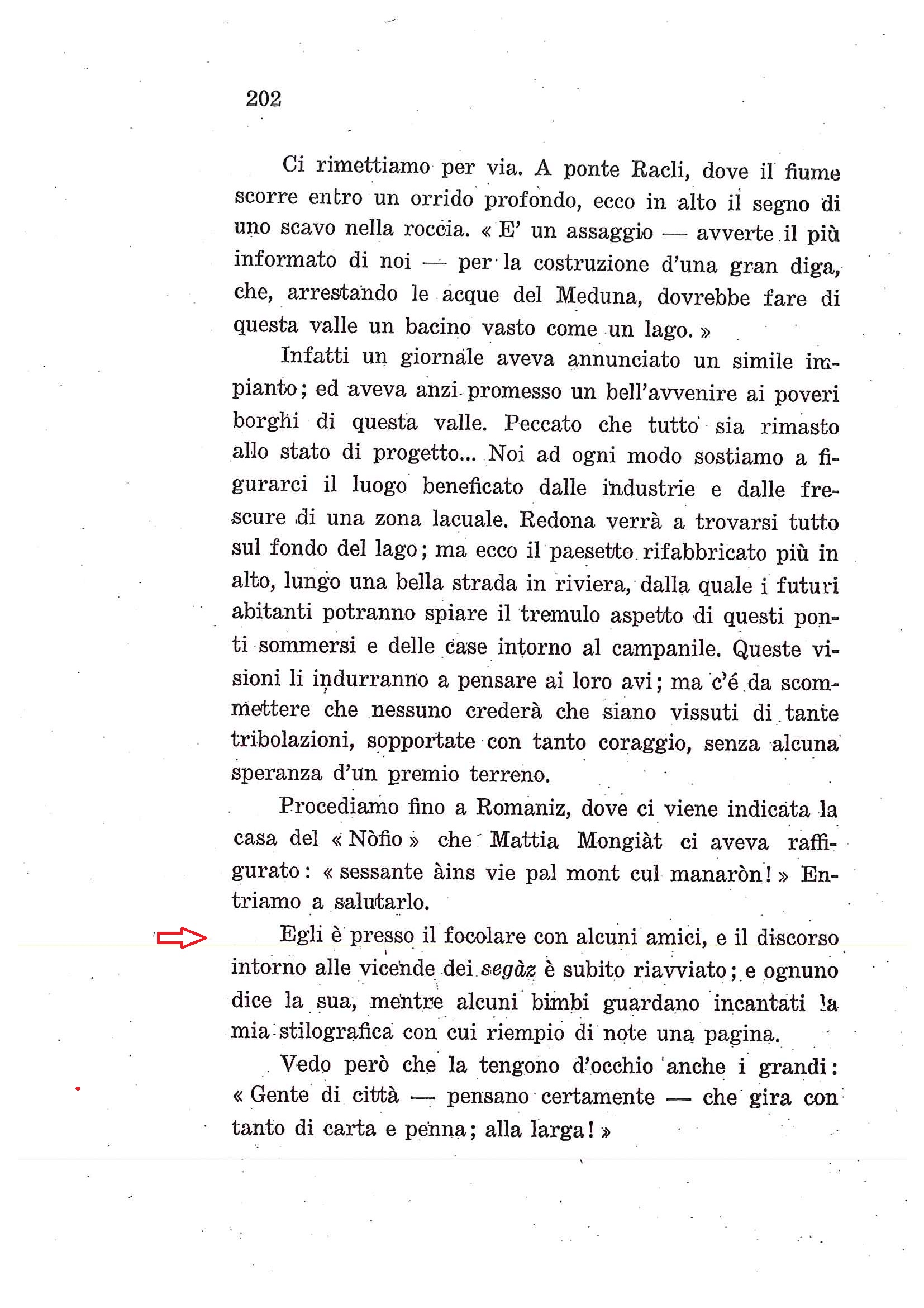 Qui si parla di gente che lavorava nei boschi, gente dura, ruvida e sospettosa, due righe sopra la freccia "sessante àins vie pal mont cul manaròn" ( sessanta anni in giro per il mondo, (Austria/Germanie - al plurale), con la mannaia, più sotto "segâz" (mutilati delle dita e/o mani, infortuni sul lavoro).