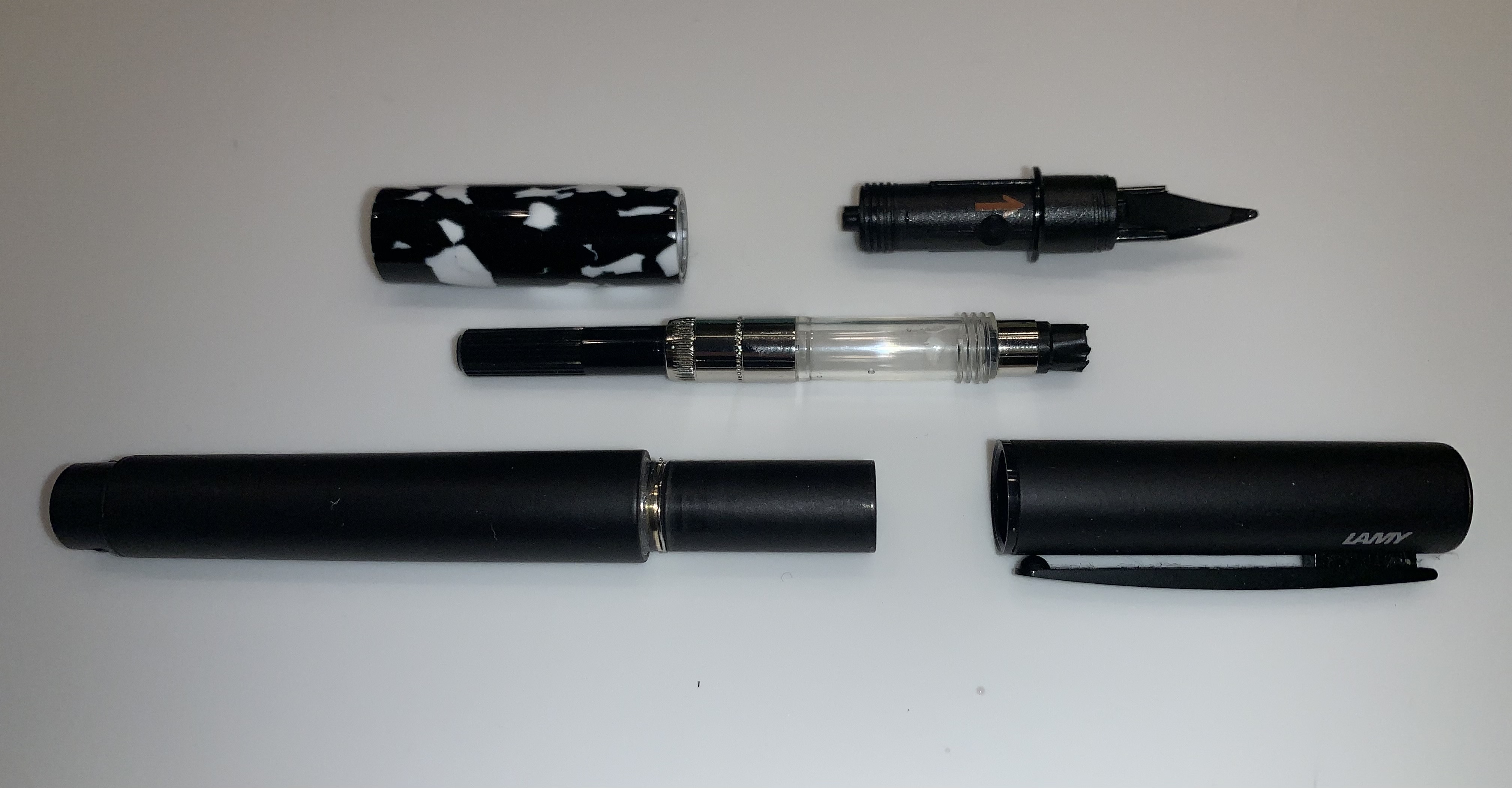 Ho acquistato usata questa Lamy che proprio non riesco ad identificare. È dotata del classico pennino intercambiabile ed utilizzava un converter che era incastrato nel corpo della penna e che ho rovinato per toglierlo.