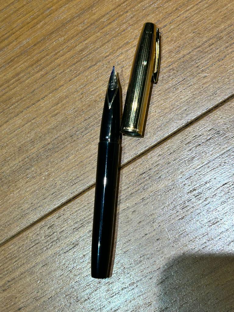 black plastic barrel and trimmed in gold plate .Fitted with a 14K solid gold inlaid nib.