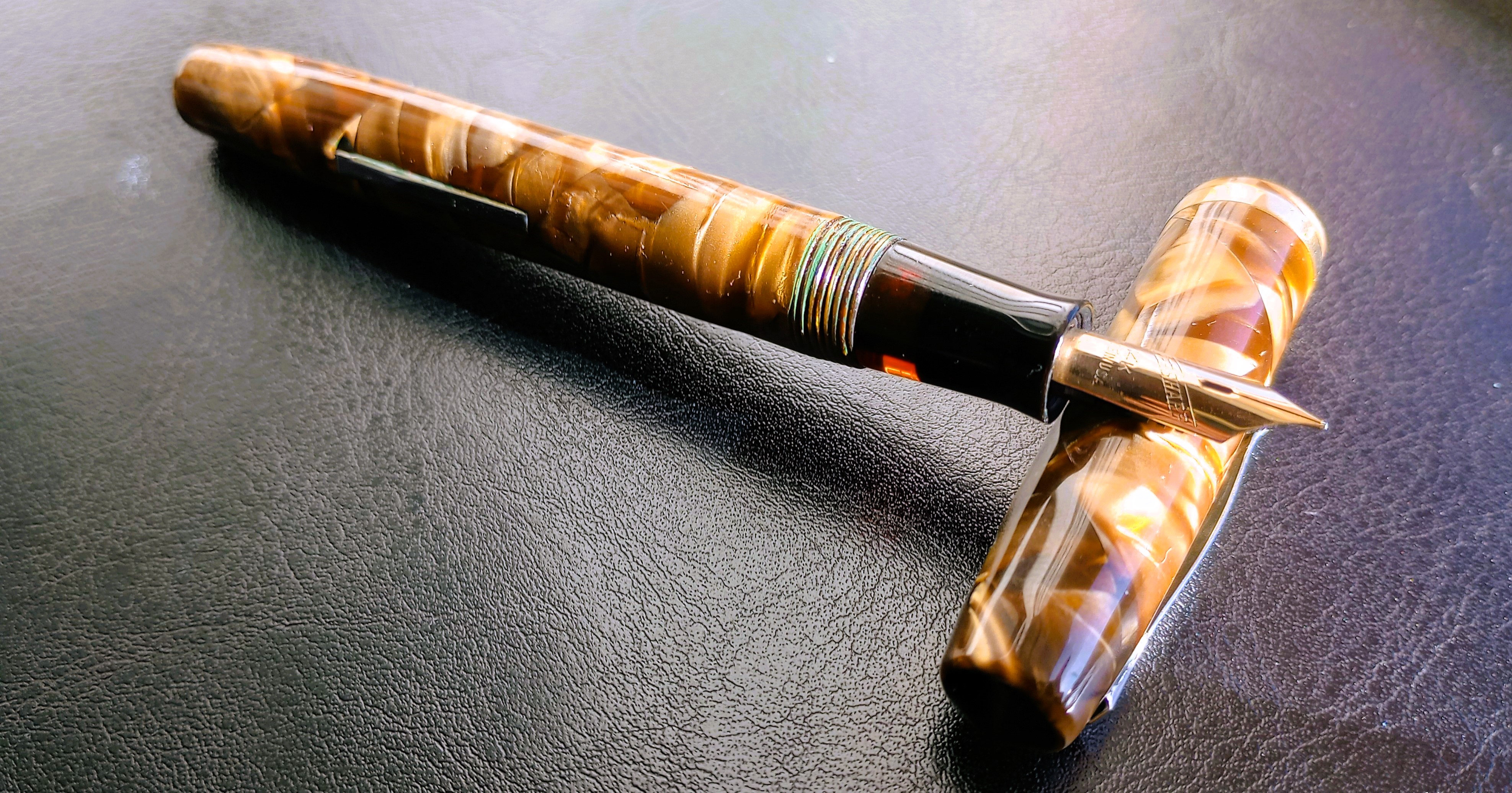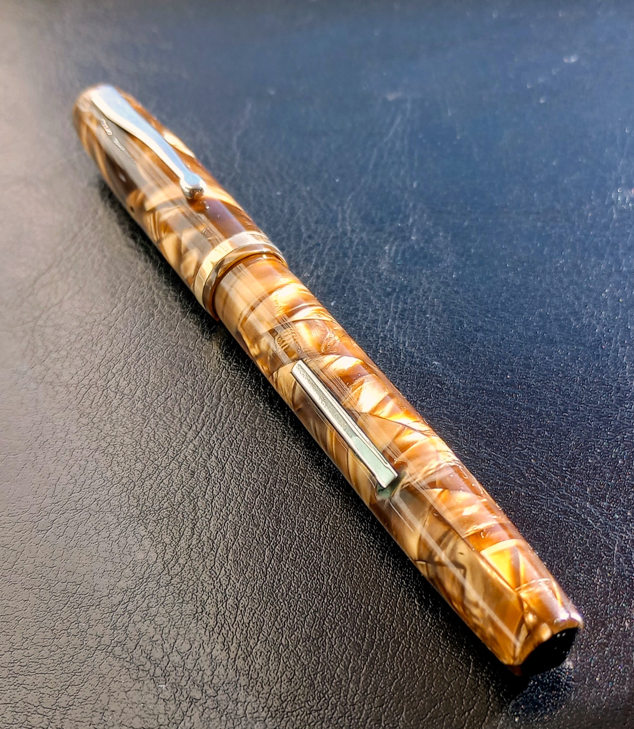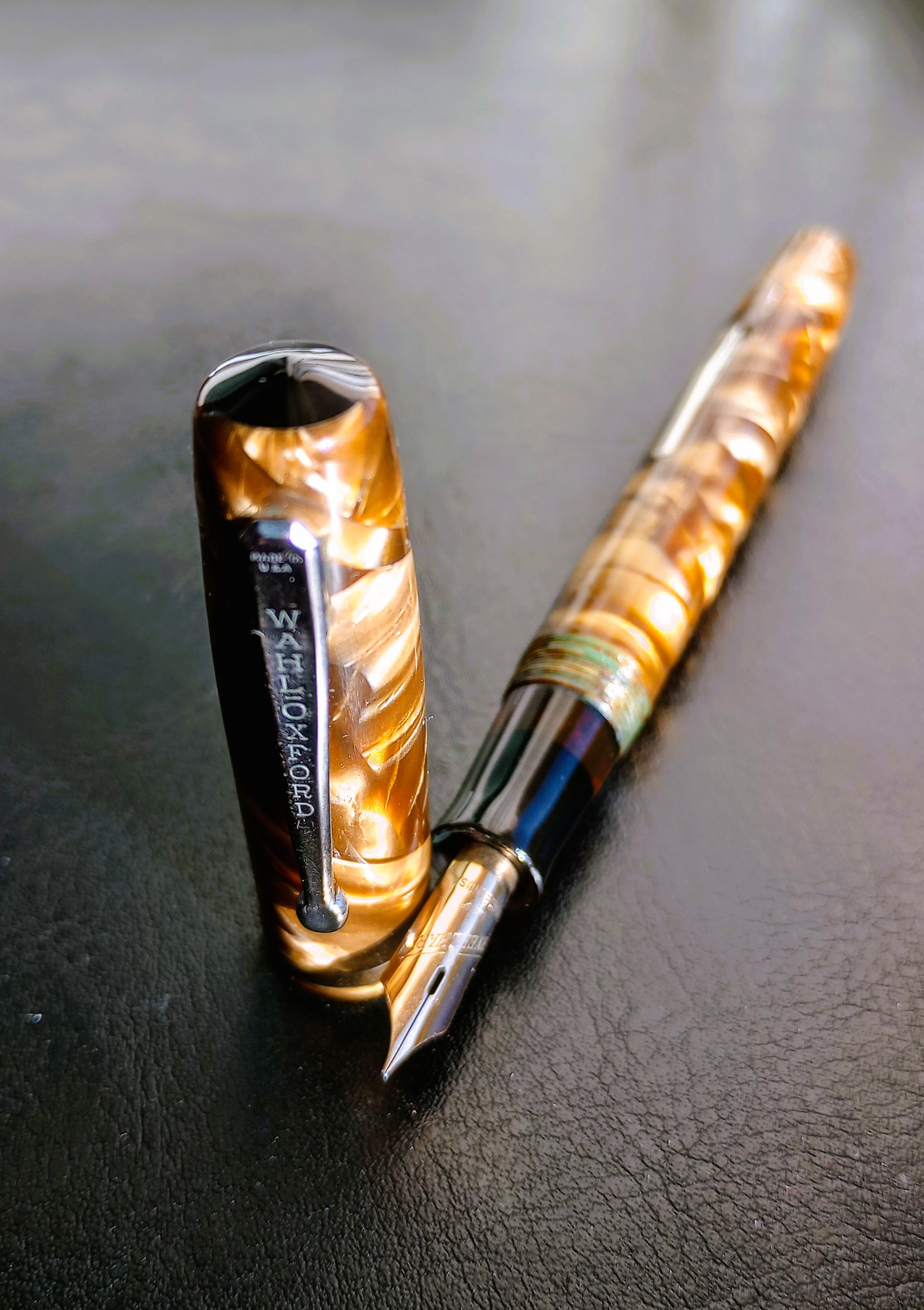 La Oxford che vi sto presentando è evidentemente il modello marbled brown a levetta: la celluloide si esalta bellissima, profonda, calda, con toni che vanno dal miele, all’oro, fino al bronzo; vi confesso che appena caduta la penna nelle mie mani non mi ero accorto di cotanta bellezza, poi, una volta diffusasi la luce naturale, i colori sono semplicemente esplosi, con grande gioia del sottoscritto. La clip, molto semplice, a cravatta e rodiata come la levetta, porta la scritta “MADE IN USA - WHAL OXFORD”, il cappuccio invece è impreziosito da una vera dorata, mentre sul fusto si intravede la stampigliatura “WAHL OXFORD - MADE IN USA - MAKE OF EVERSHARP”. L’alternanza di dettagli rodiati e dorati (a questi ultimi si aggiunge il pennino 14K) è singolare, ma ben si sposa con la colorazione variegata della penna. Rimarcabile la finestrella rossiccia per il controllo dell’inchiostro.