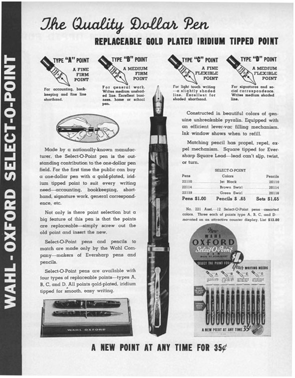 Come dici tu le prime Oxford avevano un pennino dedicato in oro, poi si passò al pennino in acciaio dorato Select-O-Point, che, stando a sentire altri forum stranieri, doveva essere un pessimo scrittore.