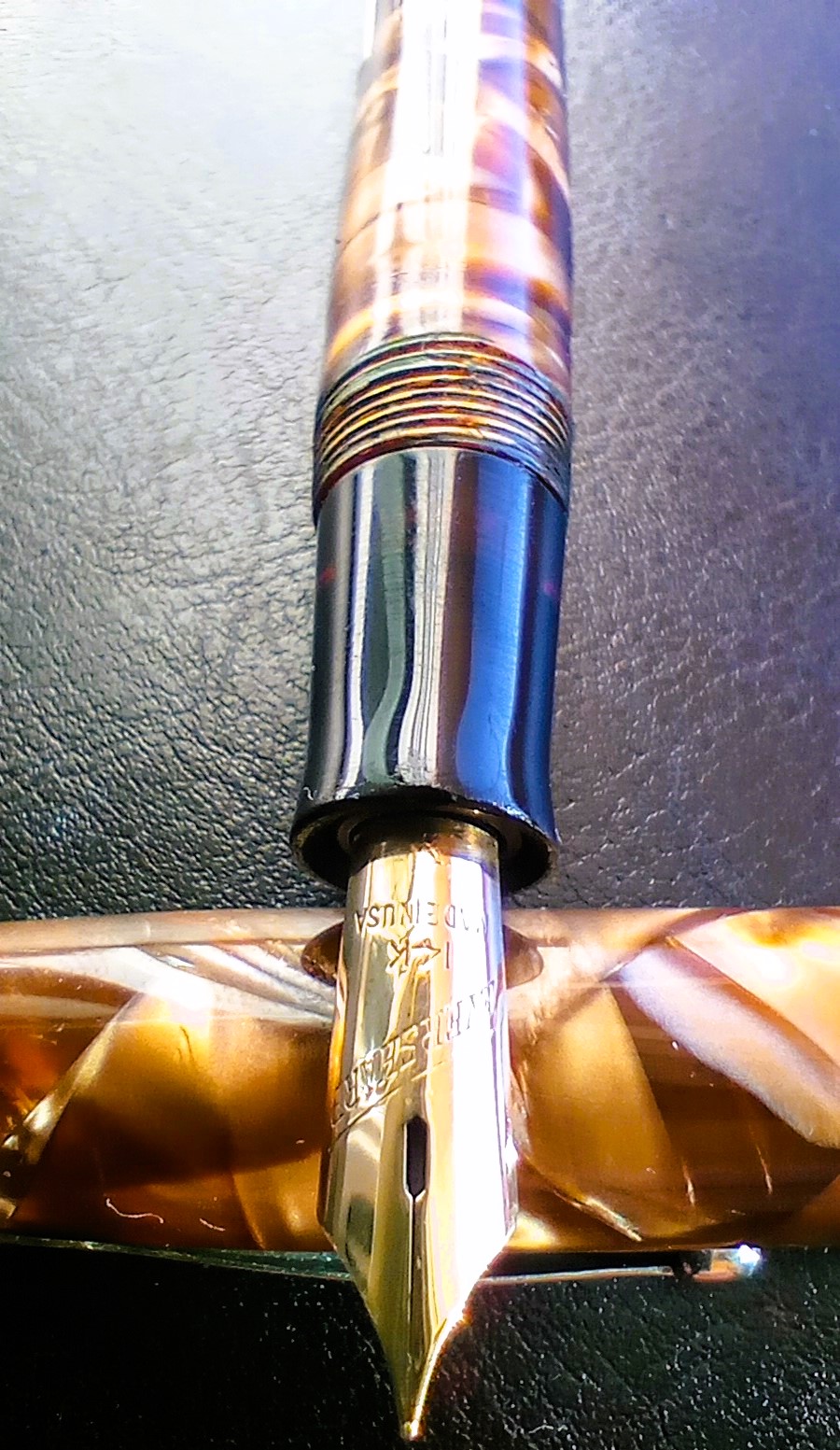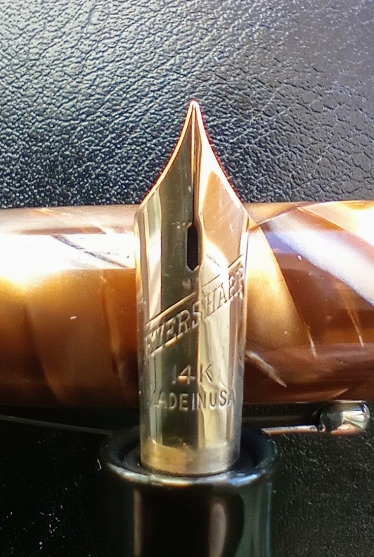 Nondimeno, ho qualche dubbio sulla congruità: se le Oxford Regular e Special erano munite di un pennino in oro 14K, le successive Select-O-Point, a cui sembra appartenere la presente, erano equipaggiate di un pennino intercambiabile in acciaio dorato, il quale, a dirvi la verità, non doveva essere un gran che viste le considerazioni poco entusiastiche collazionate su FPN (alla lucidatura, peraltro, tende a perdere immancabilmente la doratura!). Non posso tuttavia escludere una versione a levetta provvista del pennino qui documentato, perché esso è sicuramente attestato nelle Oxford twist filler: come ben sappiamo, infatti, nel mondo delle stilografiche vintage nulla è graniticamente certo e l’ipotesi di una configurazione mista è tutt’altro che peregrina. A tal proposito, ho anche sentito il fidatissimo collezionista che mi ha ceduto questo esemplare: egli asserisce che se l’era procurato così com’è negli Stati Uniti (ma in 80 anni di vita potete ben immaginare che questo indizio non costituisce per nulla una prova...).