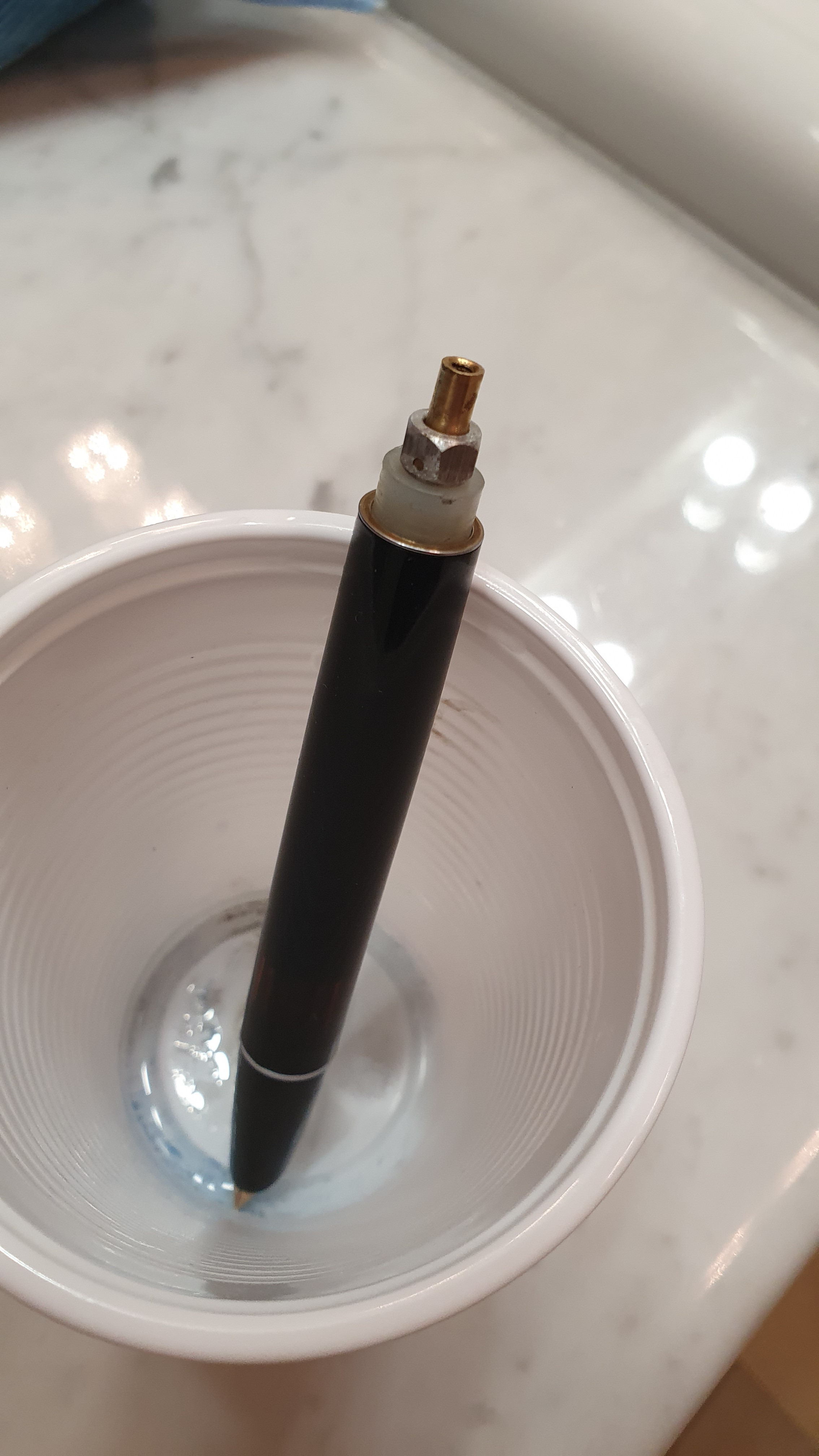 Dopo il 5 giorno consecutivo in ammollo, utilizzando dei guanti sono riuscito a svitare la sezione dal fusto. Era tenuta attaccata da molto inchiostro secco rimasto tra la filettatura della penna e ho continuato a pulire l'interno e tenerla in ammollo.