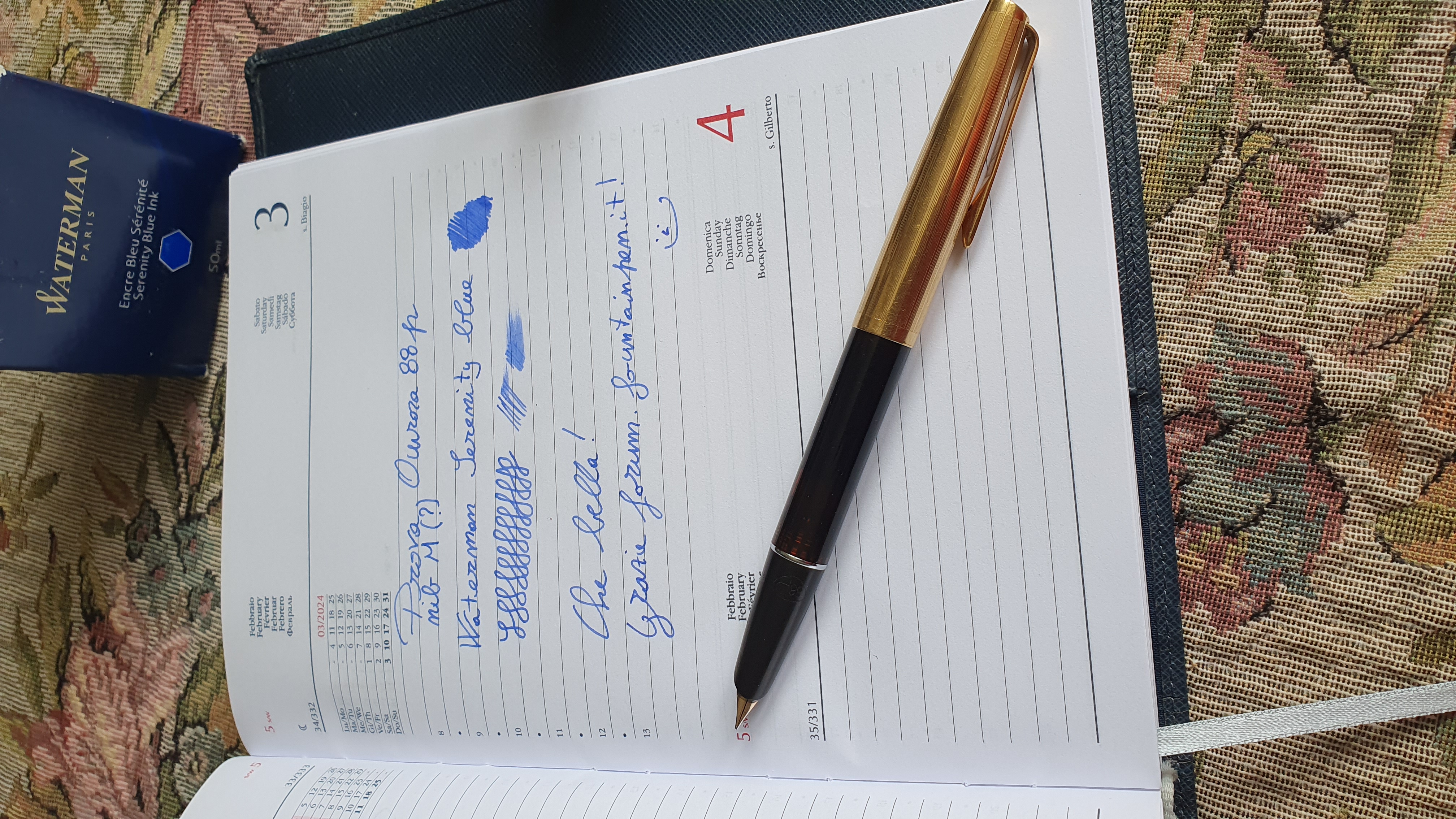 Venendo alle news positive: ho provato a richiuderla, inchiostrarla velocemente per provare almeno il pennino e per scrivere devo dire che scrive, con un flusso anche piuttosto abbondante e regolare, non ha problemi evidenti, non gratta, non è stitica (colpa/merito dell'alimentatore spezzato?). Quindi almeno il pennino sembra buono.