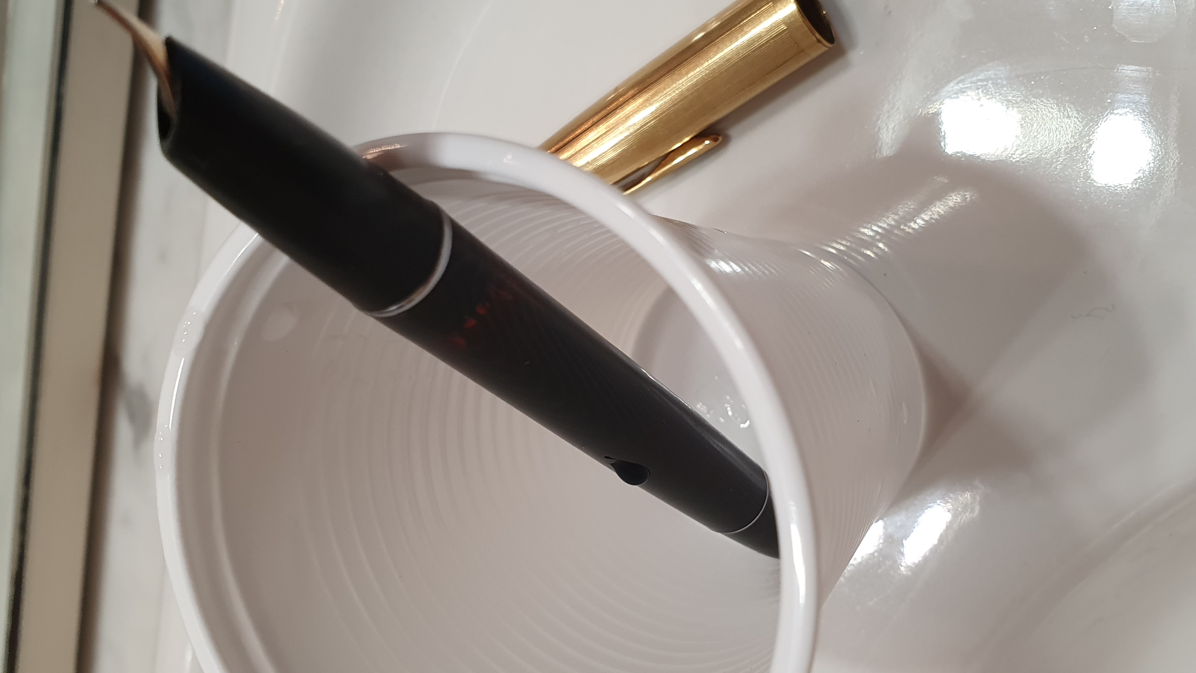 Rimontata da capo, caricata con acqua e lasciata a riposare per provare la tenuta delle guarnizioni: perde copiosamente da un lato. Addirittura se soffio con forza nel buco sul fusto esce acqua dal pennino.