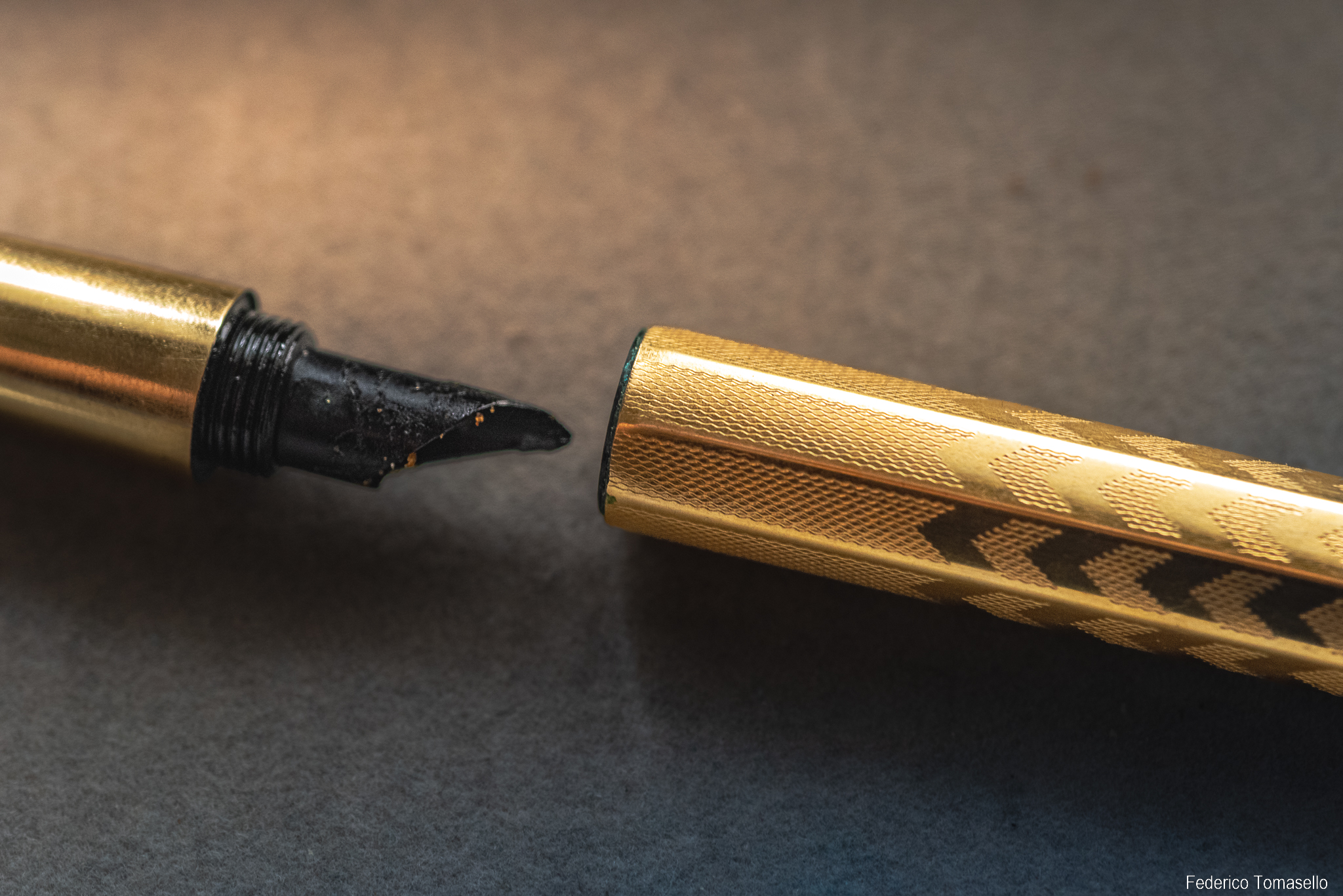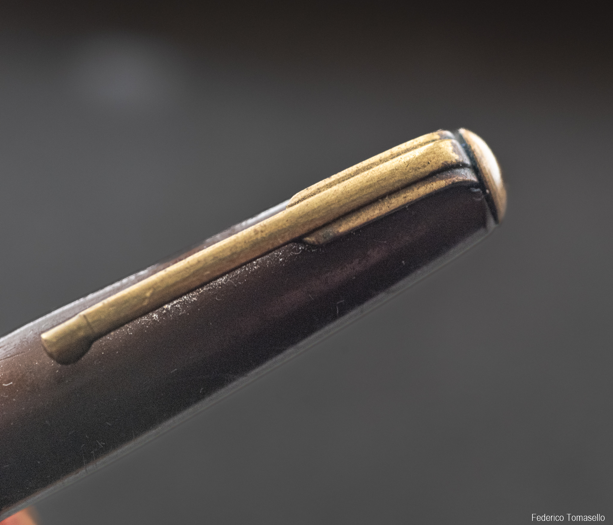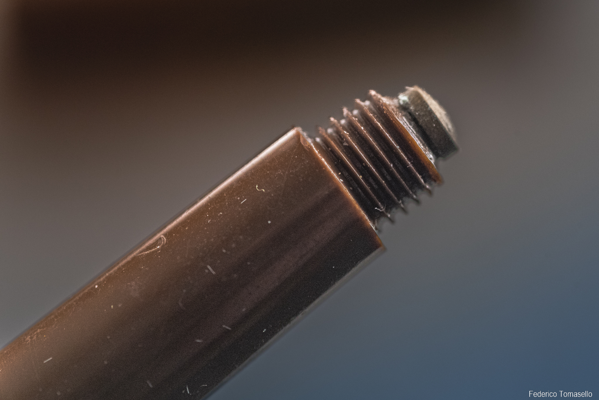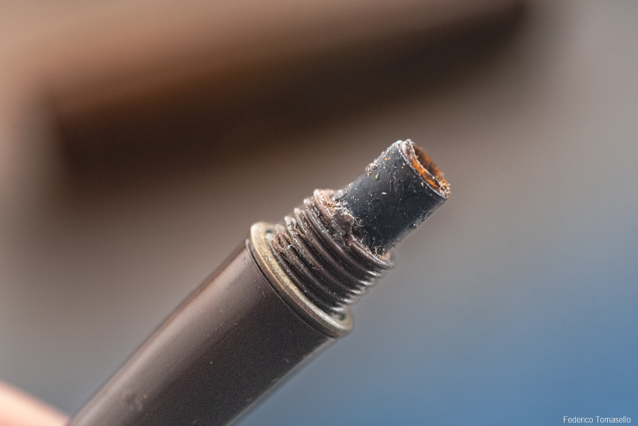 Sebbene il fusto esternamente non sia particolarmente rovinato (almeno ai miei occhi), all'interno c'è un elicoide ancora unto di un qualche grasso secco che è spezzato un più parti. Immagino che servisse a far rientrare il pennino estraibile che infatti, a sua volta, è messo male essendo pesantemente piegato, per essere stato chiuso nel cappuccio senza essere stato fatto prima rientrare nell'apposito spazio della sezione.