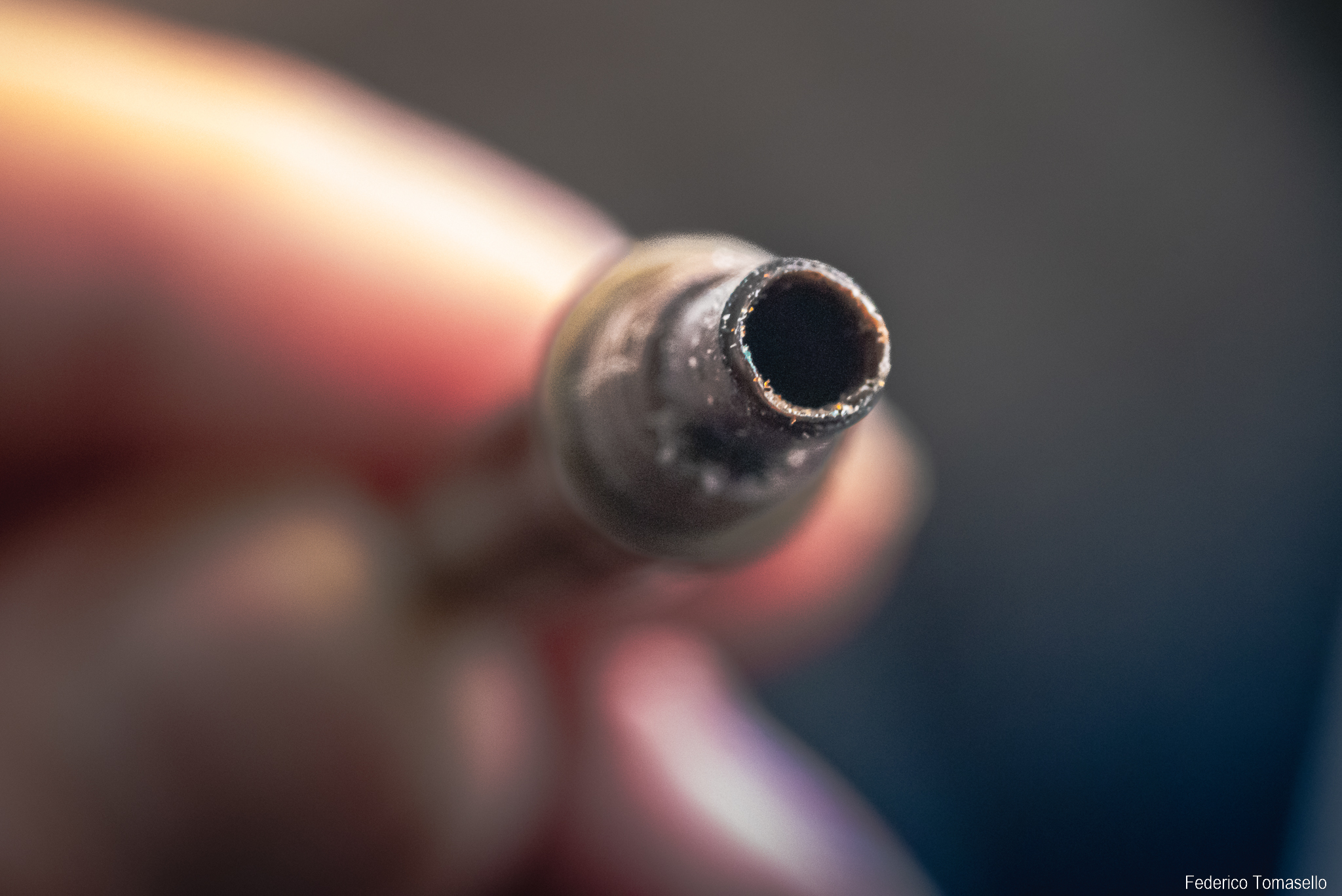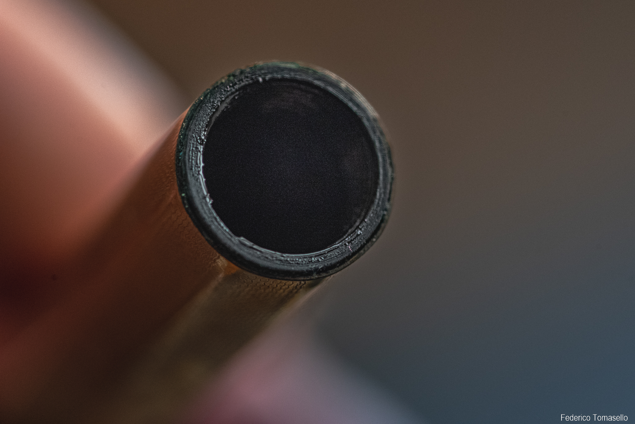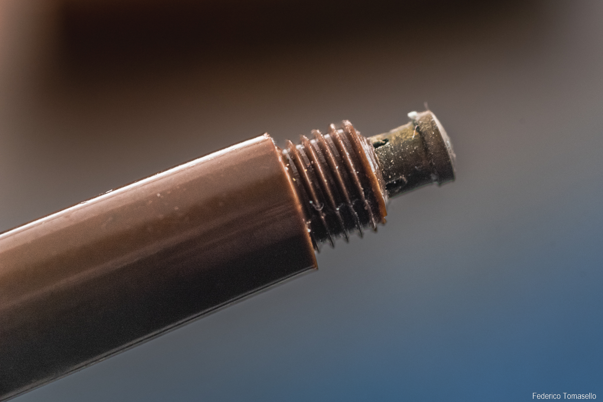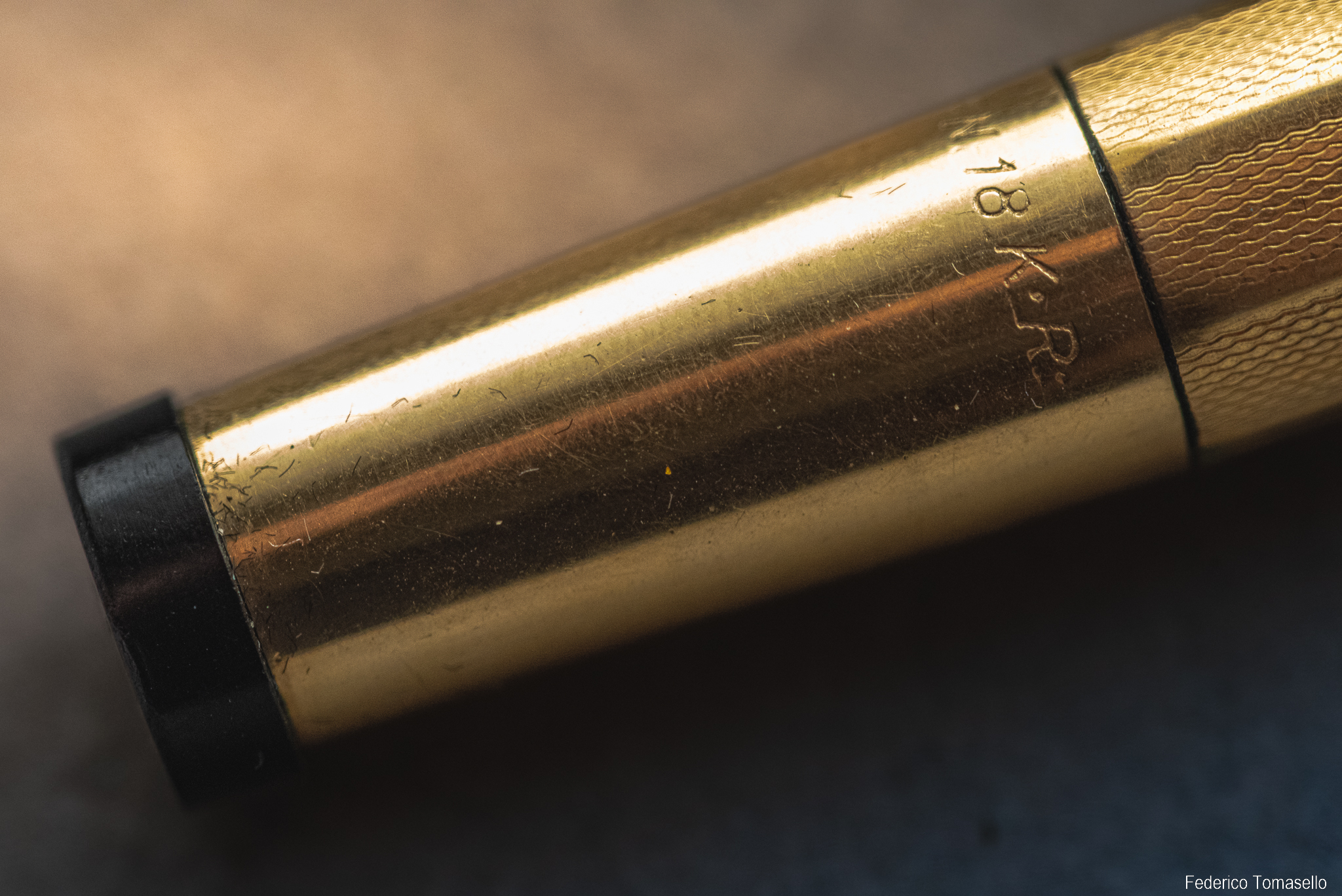 Sebbene il fusto esternamente non sia particolarmente rovinato (almeno ai miei occhi), all'interno c'è un elicoide ancora unto di un qualche grasso secco che è spezzato un più parti. Immagino che servisse a far rientrare il pennino estraibile che infatti, a sua volta, è messo male essendo pesantemente piegato, per essere stato chiuso nel cappuccio senza essere stato fatto prima rientrare nell'apposito spazio della sezione.