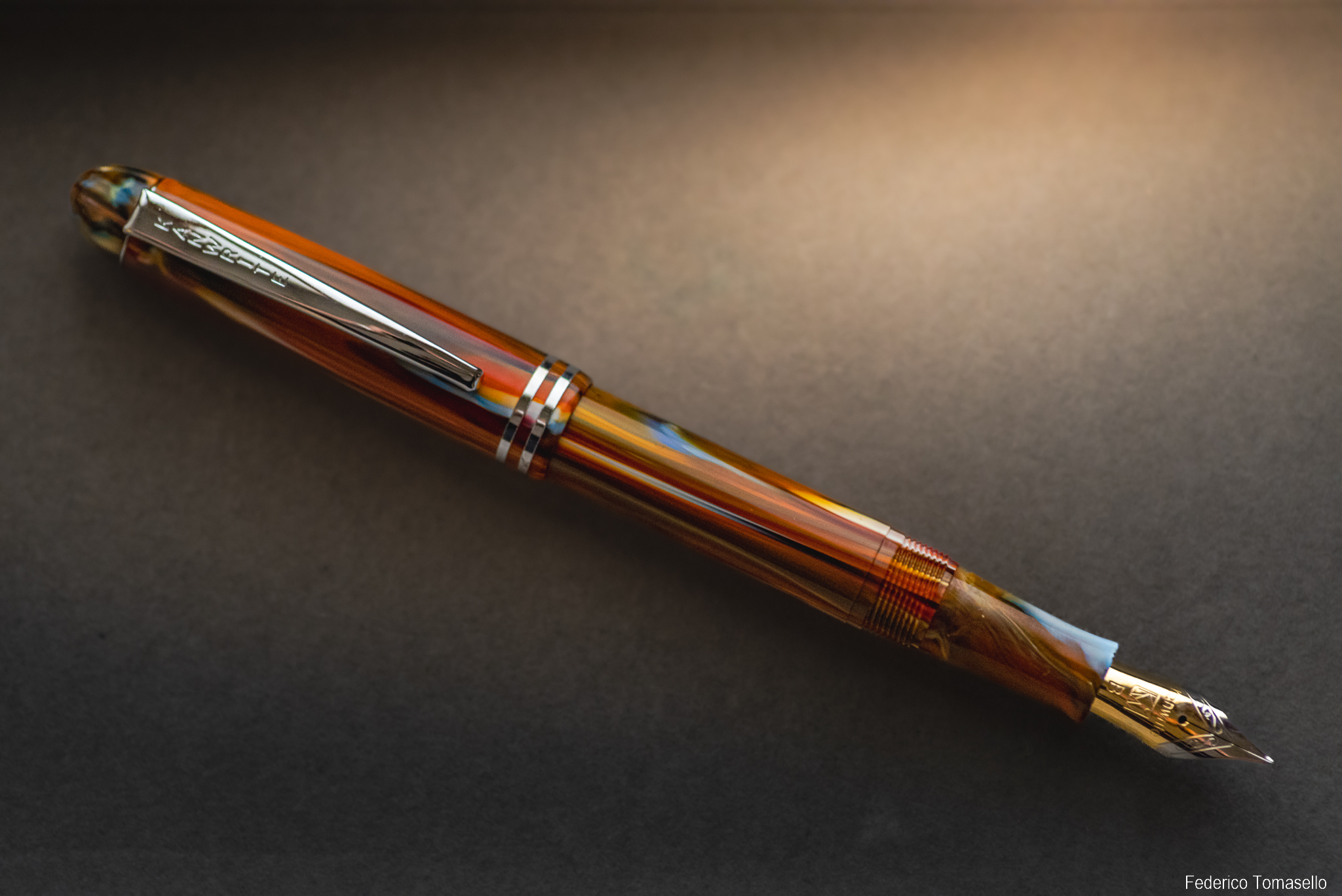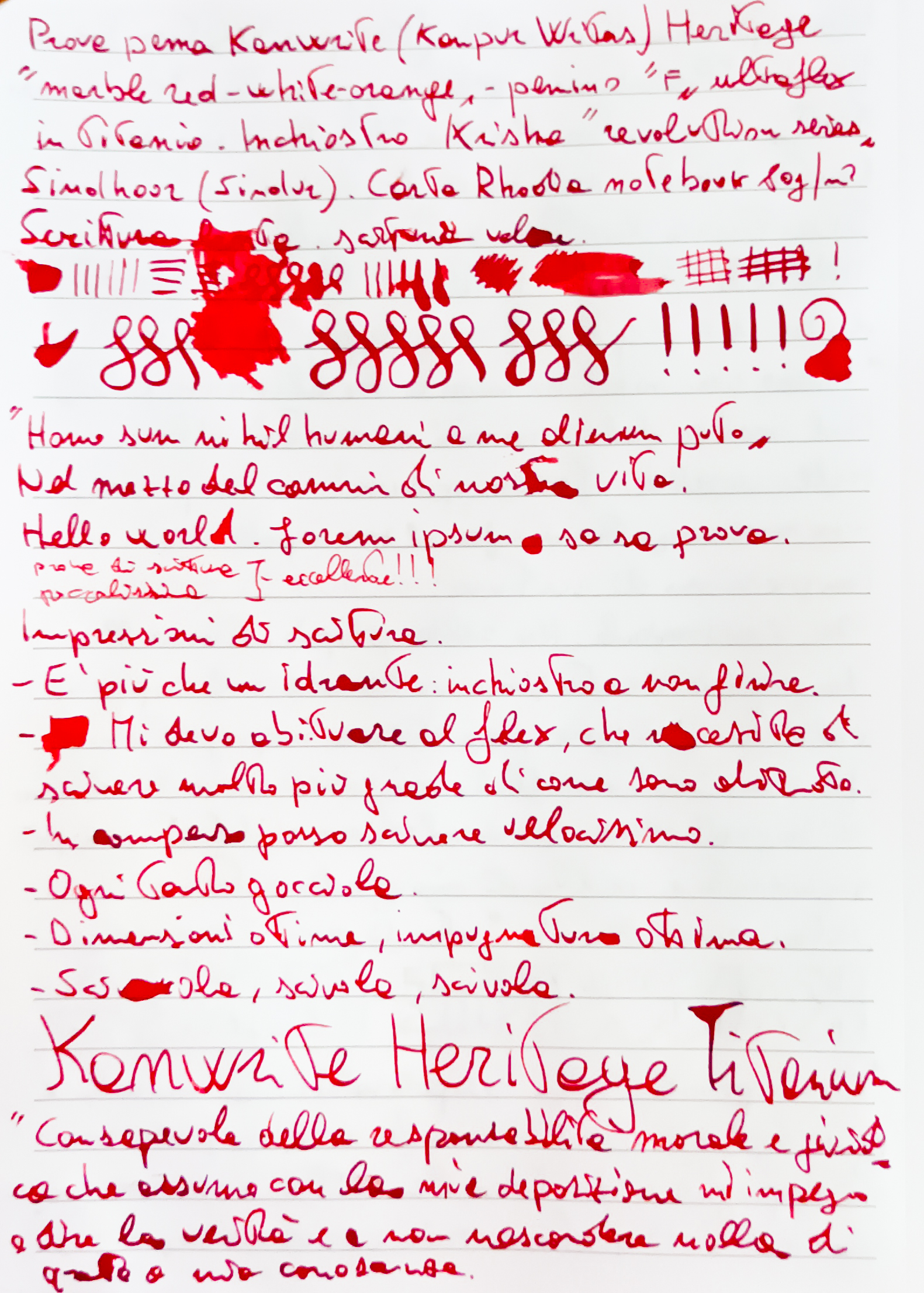 Più in alto dei modelli "Desire" c'è la linea Heritage, con caricamento a pistone (o a qualcosa di molto simile...) e alimentatore in ebanite, di cui ho scelto il modello "Marble Orange-Red-White", corredato di pennino d'acciaio F "Ultraflex"; ma, sempre per curiosità, ho ordinato anche il pennino Ultraflex di titanio, che ho subito montato e che ho utilizzato per le prove.