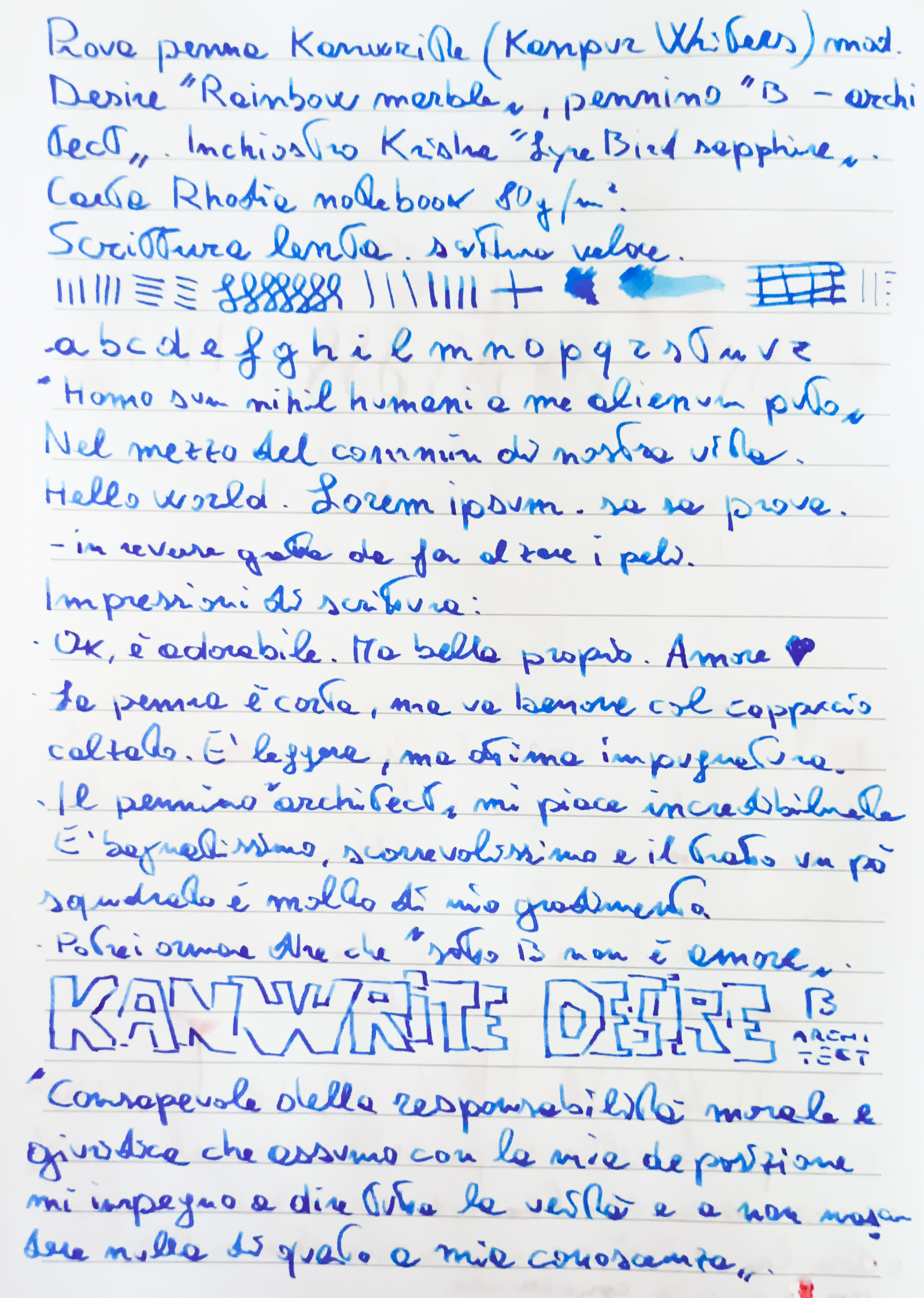 Dal catalogo di Kanwrite ho deciso di provare tre tipologie diverse di penne: la più economica è questa Desire "Marble Rainbow" con caricamento a converter/cartuccia (entrambi inclusi nella confezione); il catalogo offre una gran quantità di pennini compatibili, ho scelto la versione con un "Fine Flex" di serie e in aggiunta ho preso tre diversi "B": un architect, uno stub e un normale broad; per ora ho provato solo il B Architect, quindi tutte le mie impressioni sono riferite a questo pennino.