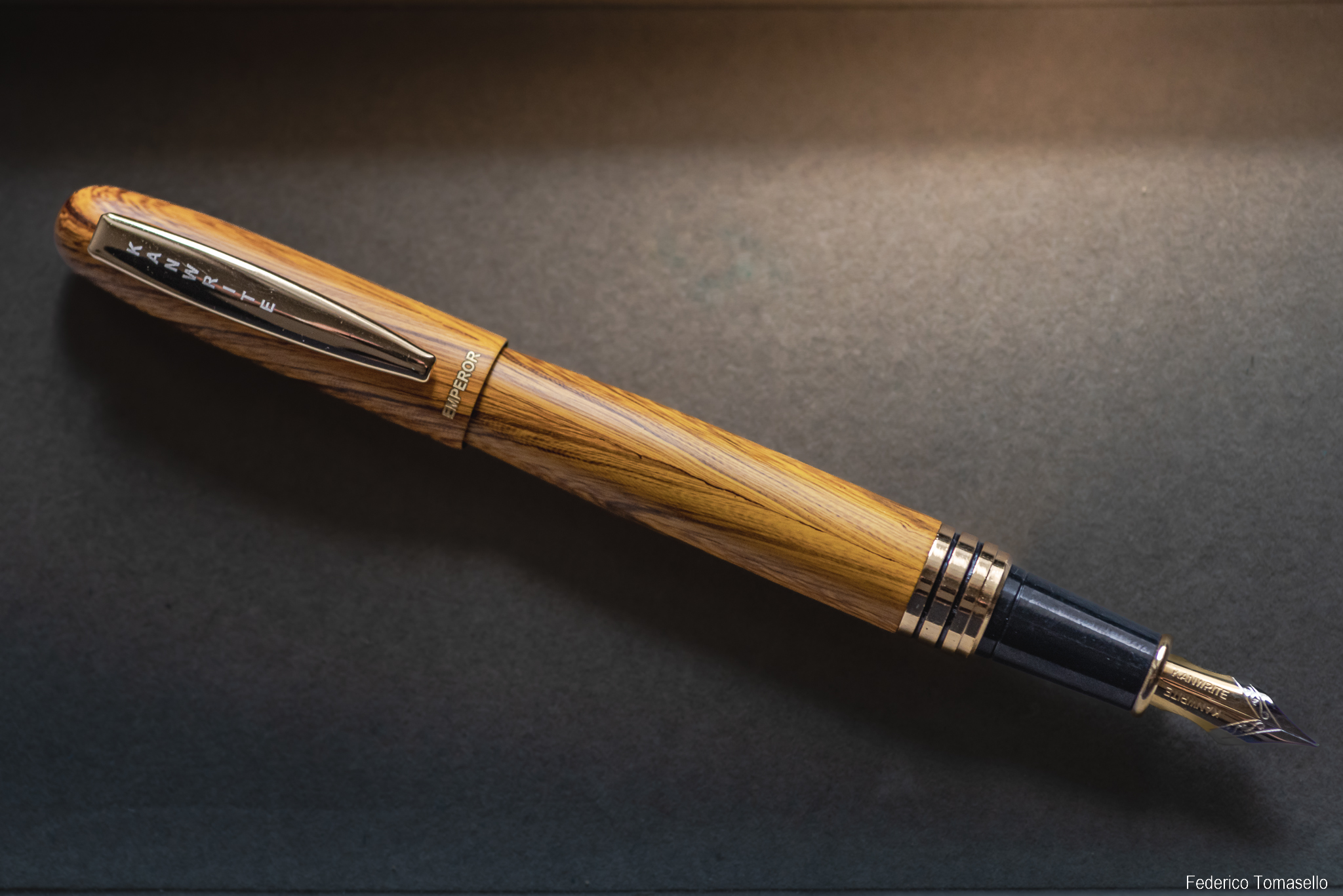 Il catalogo Kanpur Writers offre molte opzioni, anche più economiche della linea Desire e più costose della linea Heritage, ma per la terza scelta ho preferito pescare nel mezzo: sono stato infatti "rapito" dall'aspetto di questa serie "Emperor" e ho deciso di prenderne una, precisamente la versione "Teakwood" in legno di Teck. Anche in questo caso ho preso un pennino fine ultraflex (senza prenderne altri di ricambio perché sul sito non erano presenti, ma ho scoperto poi che contattandoli hanno anche altre opzioni non listate online...).