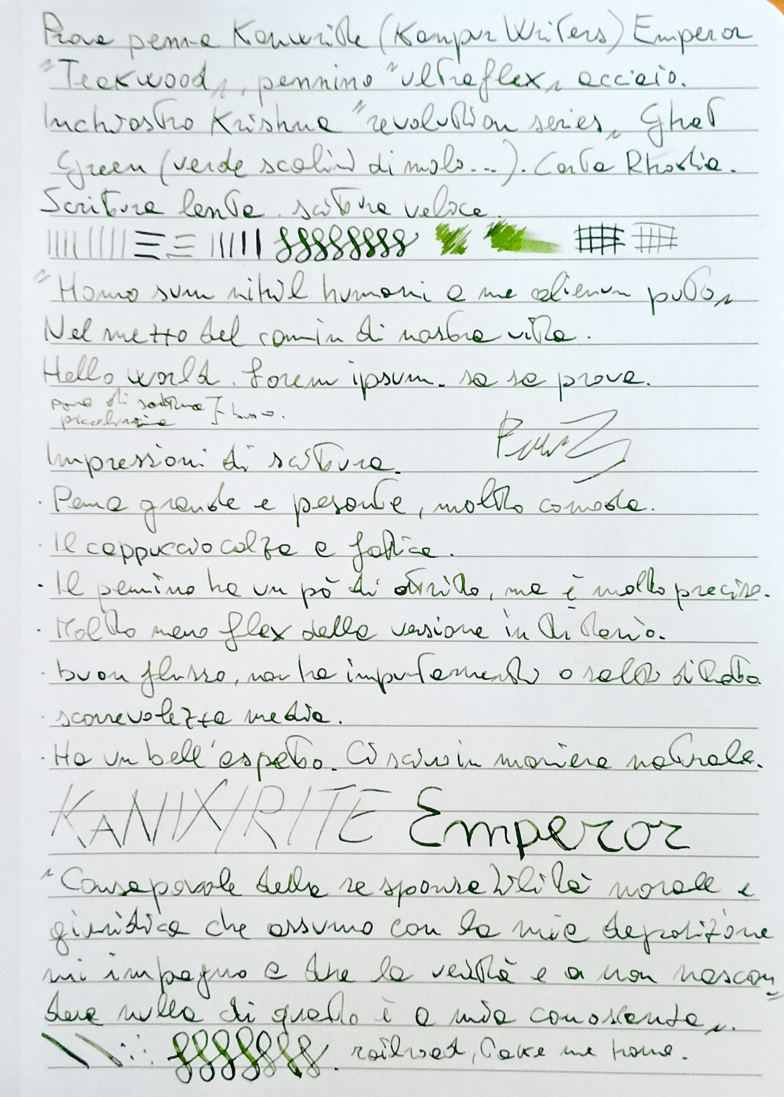 Come per le altre Kanwrite, anche questa l'ho abbinata ad un inchiostro Krishna: in questo caso il "Revolution Series" Ghat Green, un verde ispirato ai gradini dei moli che consentono di immergersi nei fiumi (che è una cosa che mi fa un po' di ribrezzo igienista pensando alle stereotipate condizioni dell'India e sinceramente questo bell'inchiostro non se lo merita
