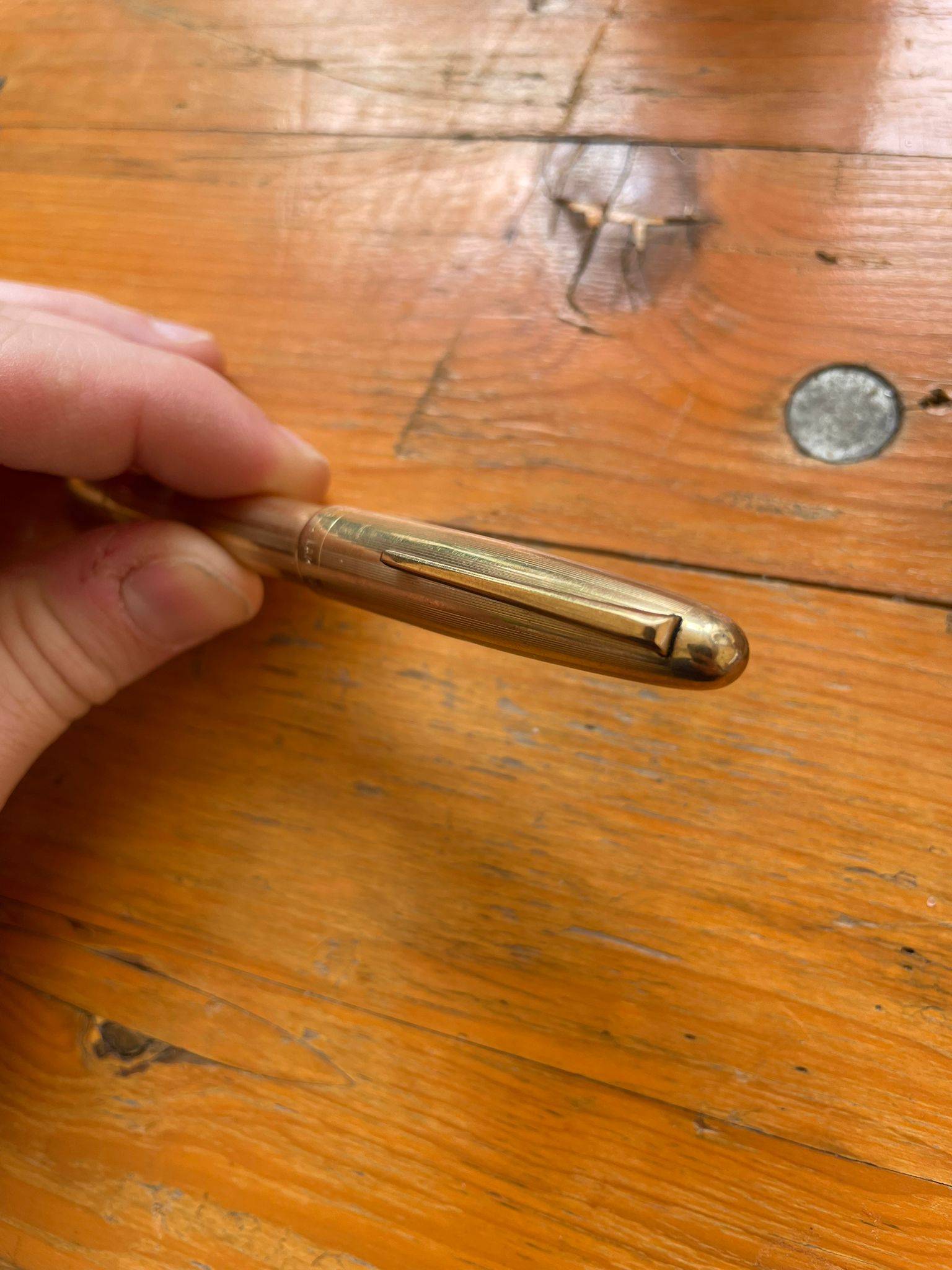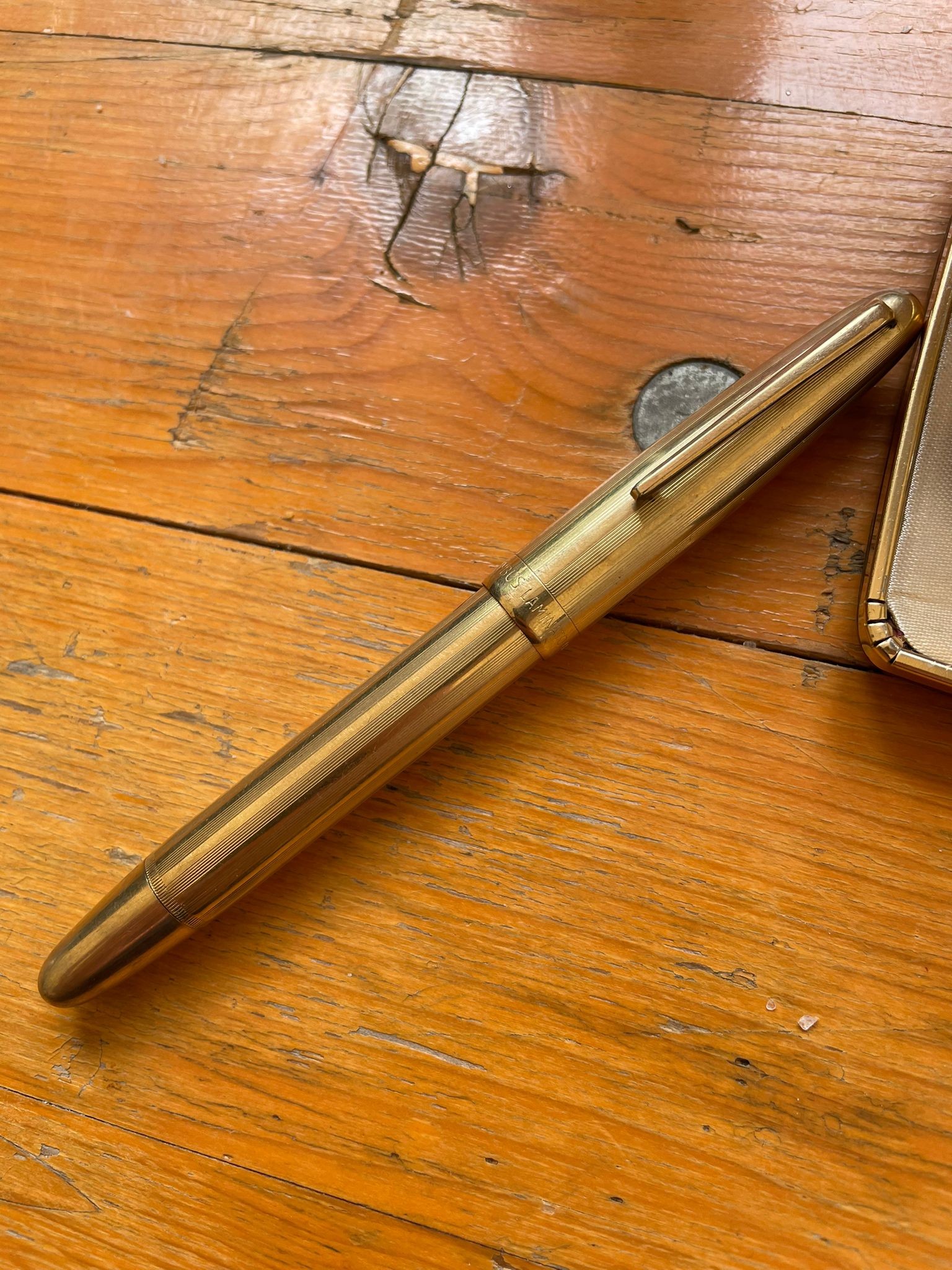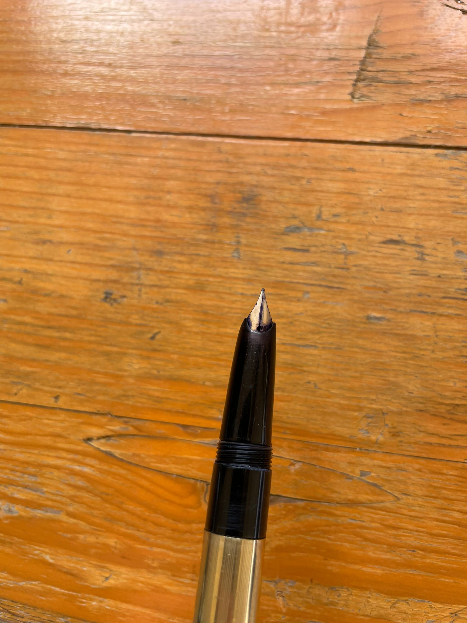 Ho spulciato il wiki, da quello che capisco deve essere una produzione pre anni '50 in quando in questo periodo la Columbus è passata alla produzione in plastica. Mai visto in nessuna foto quel cappuccio (la cosa ce si avvicina di più sembrerebbe essere una 70 ma ha la "gemma" tipo parker 51 e anche il motivo della penna è diverso).