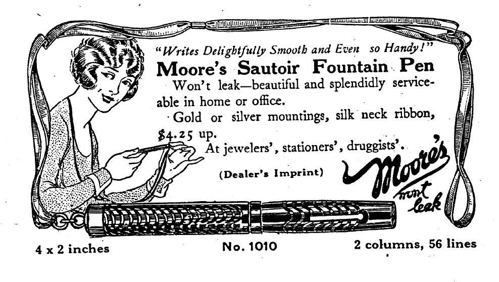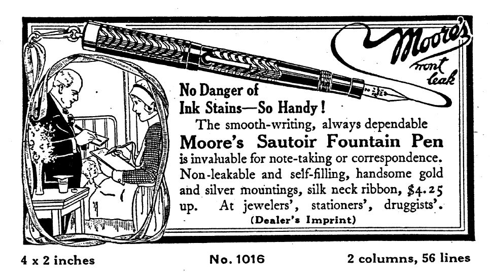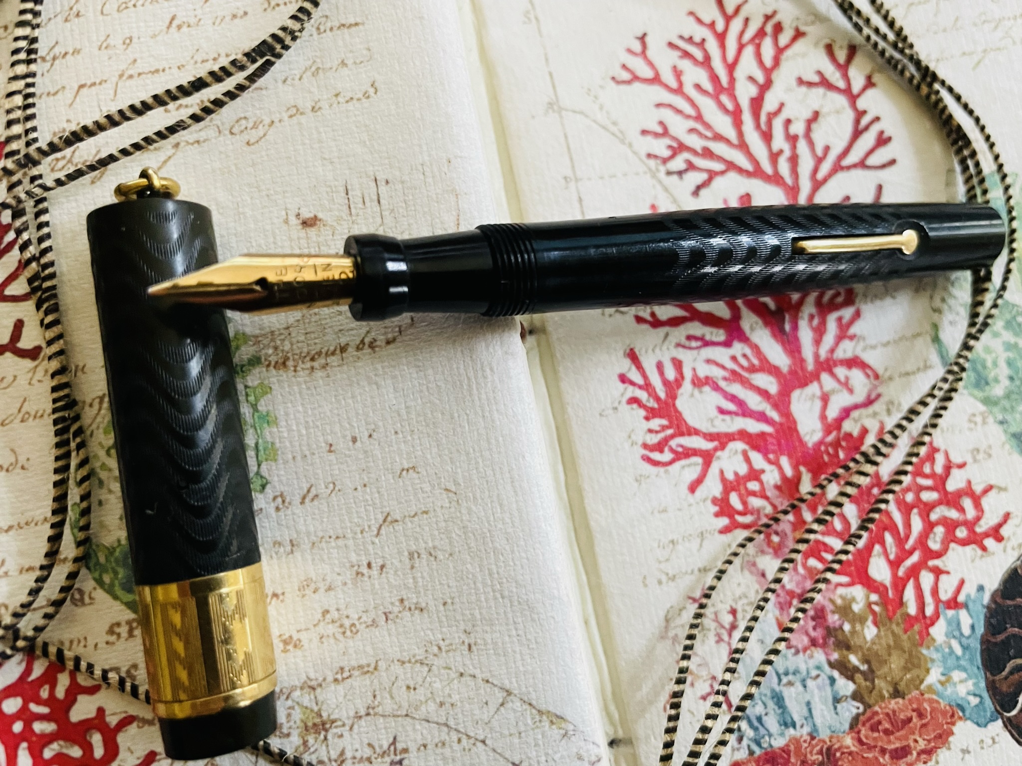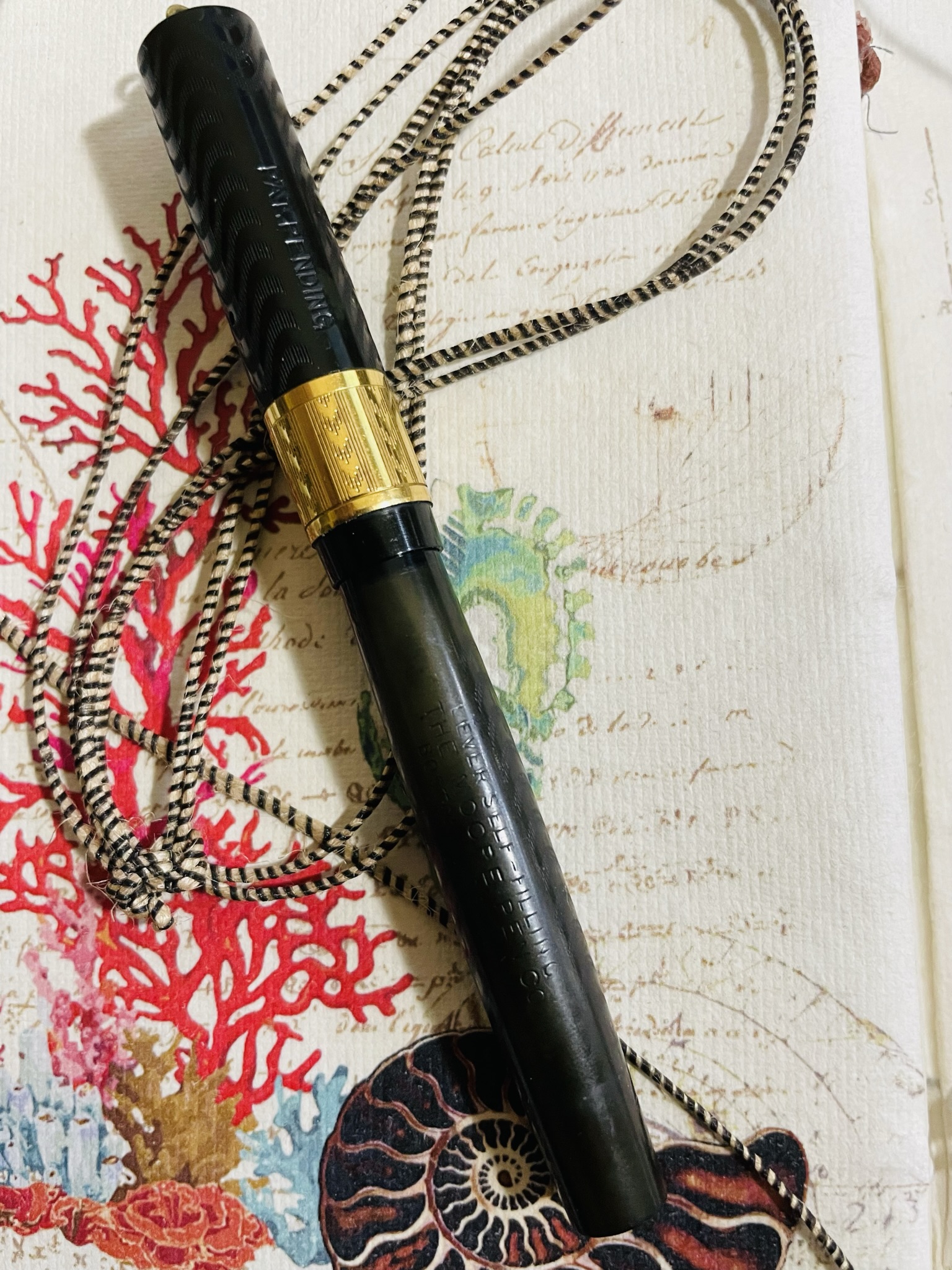 Questa piccola penna da signora, molto elegante nella sua livrea di ebanite cesellata con finiture dorate, potrebbe costituire una buona introduzione alla “scrittura d’época”, anche non calligrafica. Le dimensioni la rendono piacevole anche oggi, sia per sedute epistolarie lunghe che per “journaling”. Leggera, affidabile, a tenuta, corrisponde proprio alla descrizione che ne facevano le pubblicità dell’época (qui due annunci del 1926)