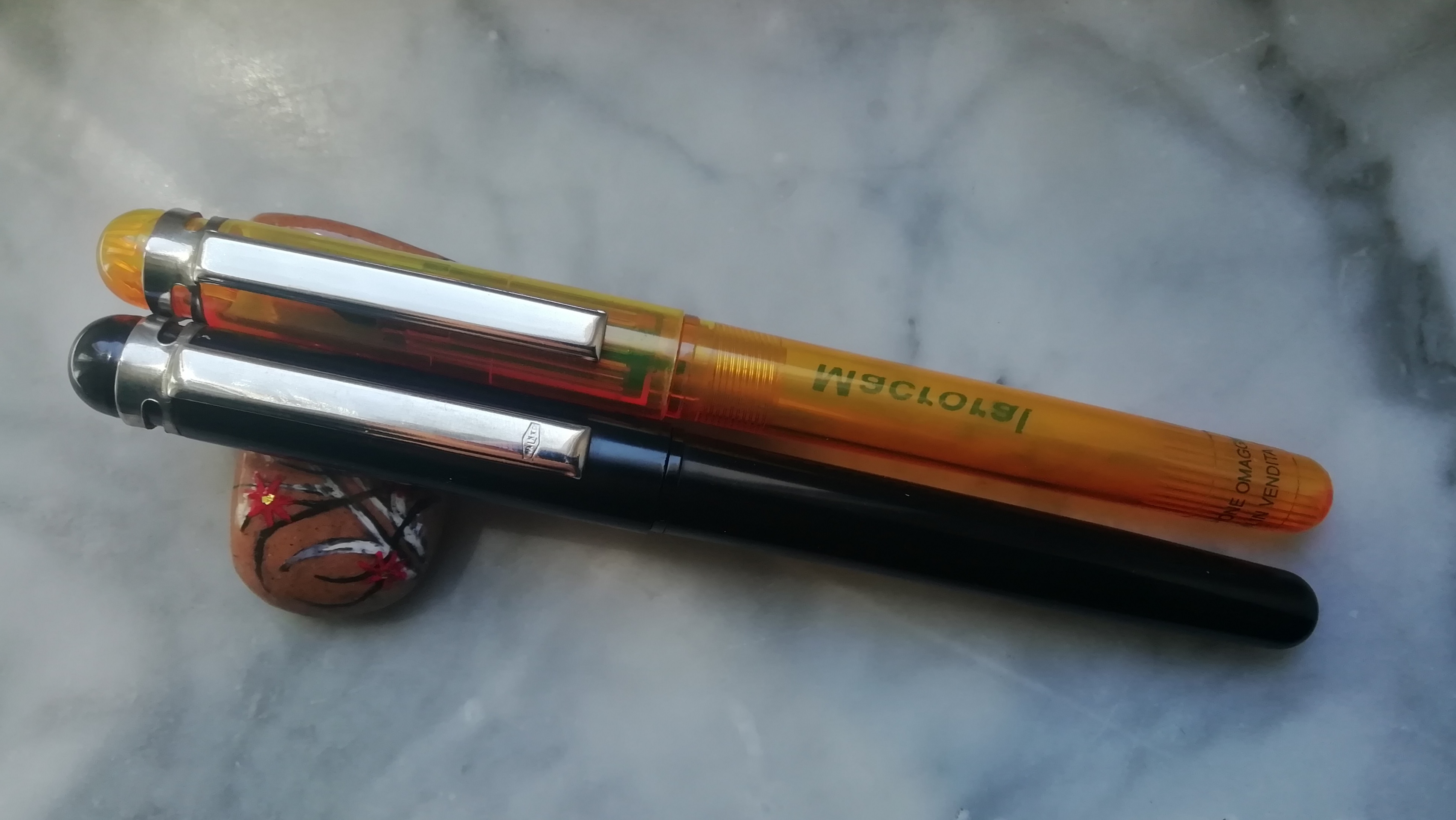 Tornando all'articolo di giornale, mi ha strappato un sorriso la frase "una fantasiosa produzione con stilografiche trasparenti che scrivono con cartucce ricambiabili di tutti i colori".