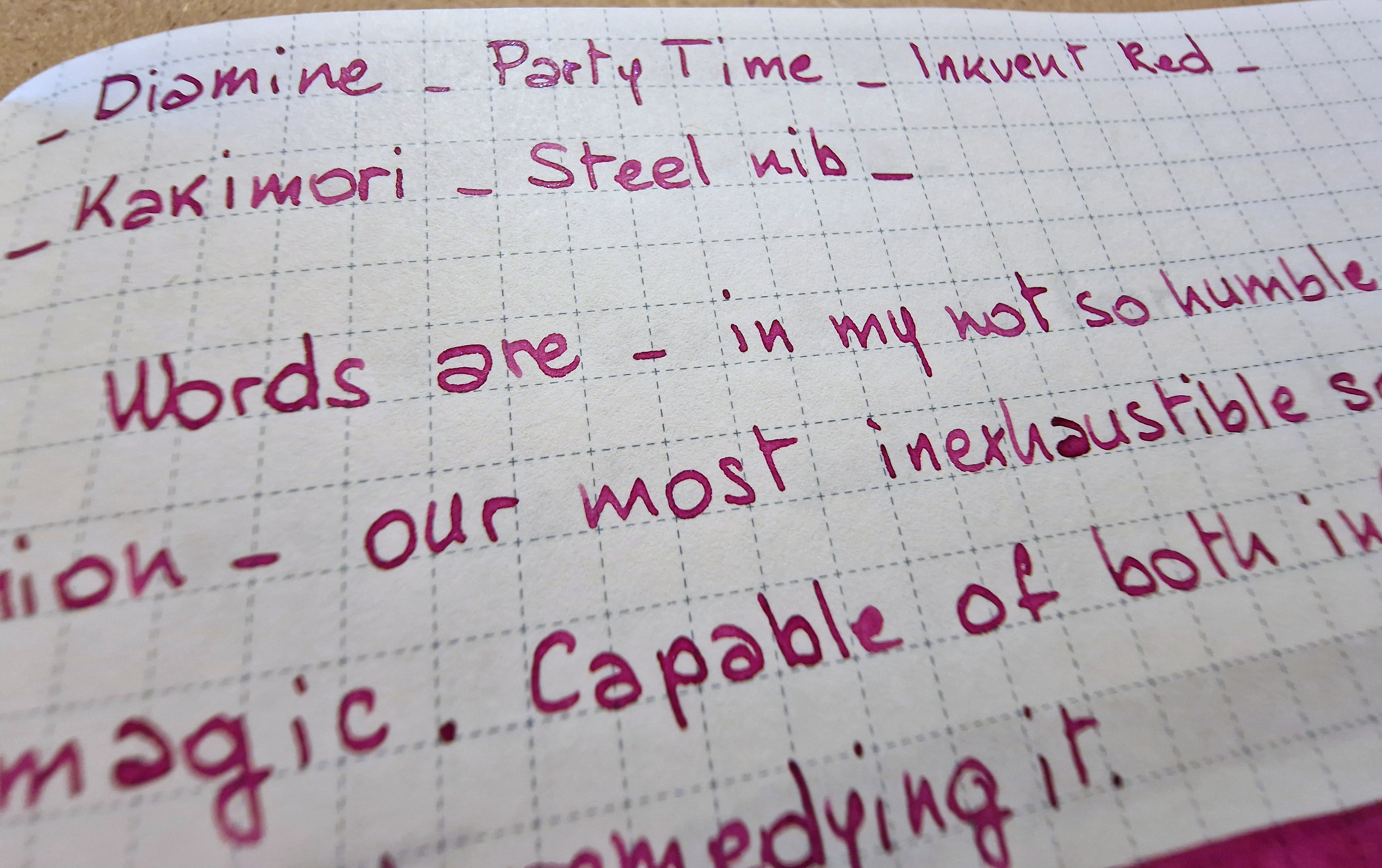 Alla scrittura con la Kakimori, risulta scorrevole - caratteristica relativamente frequente negli inchiostri a base magenta.