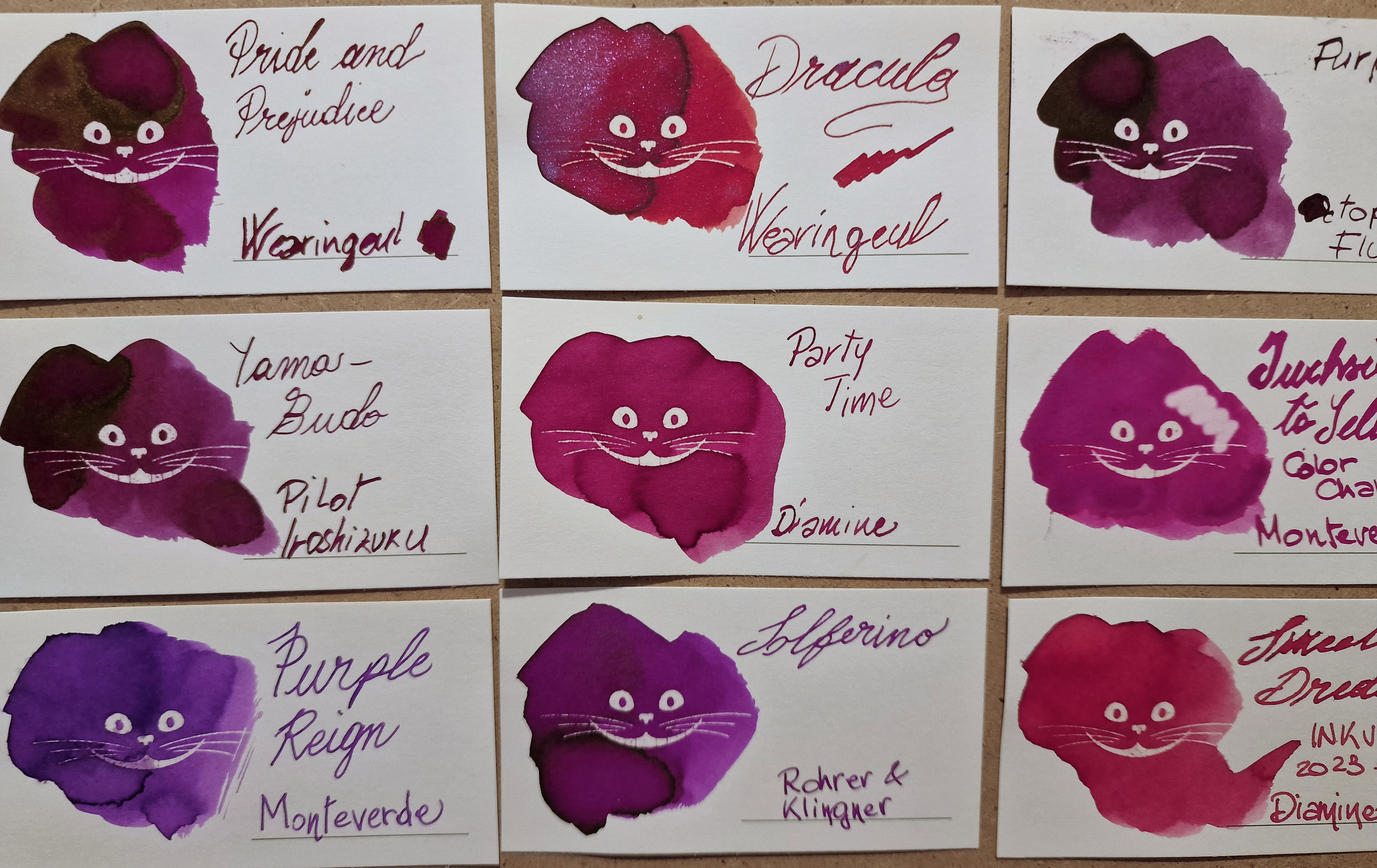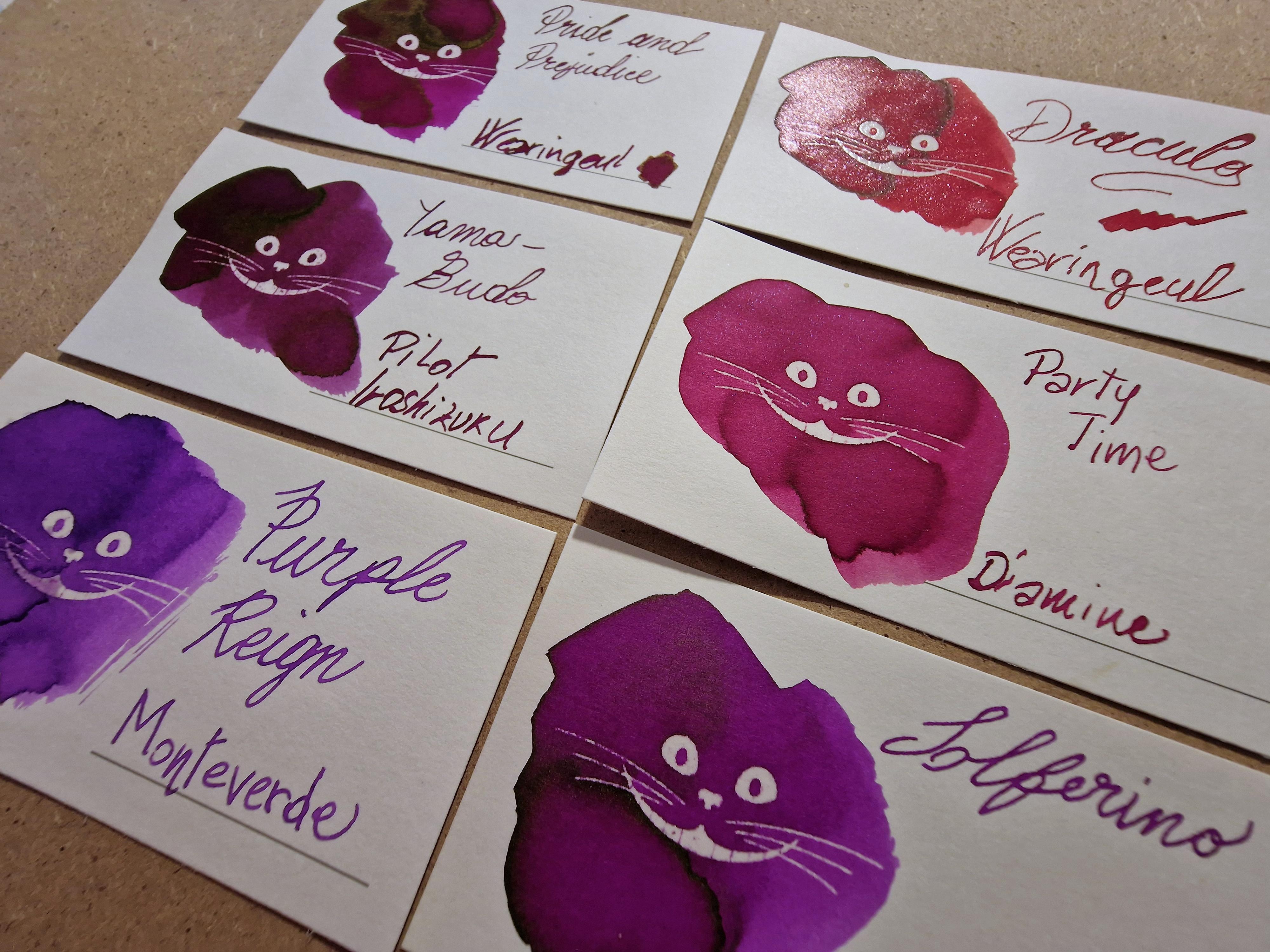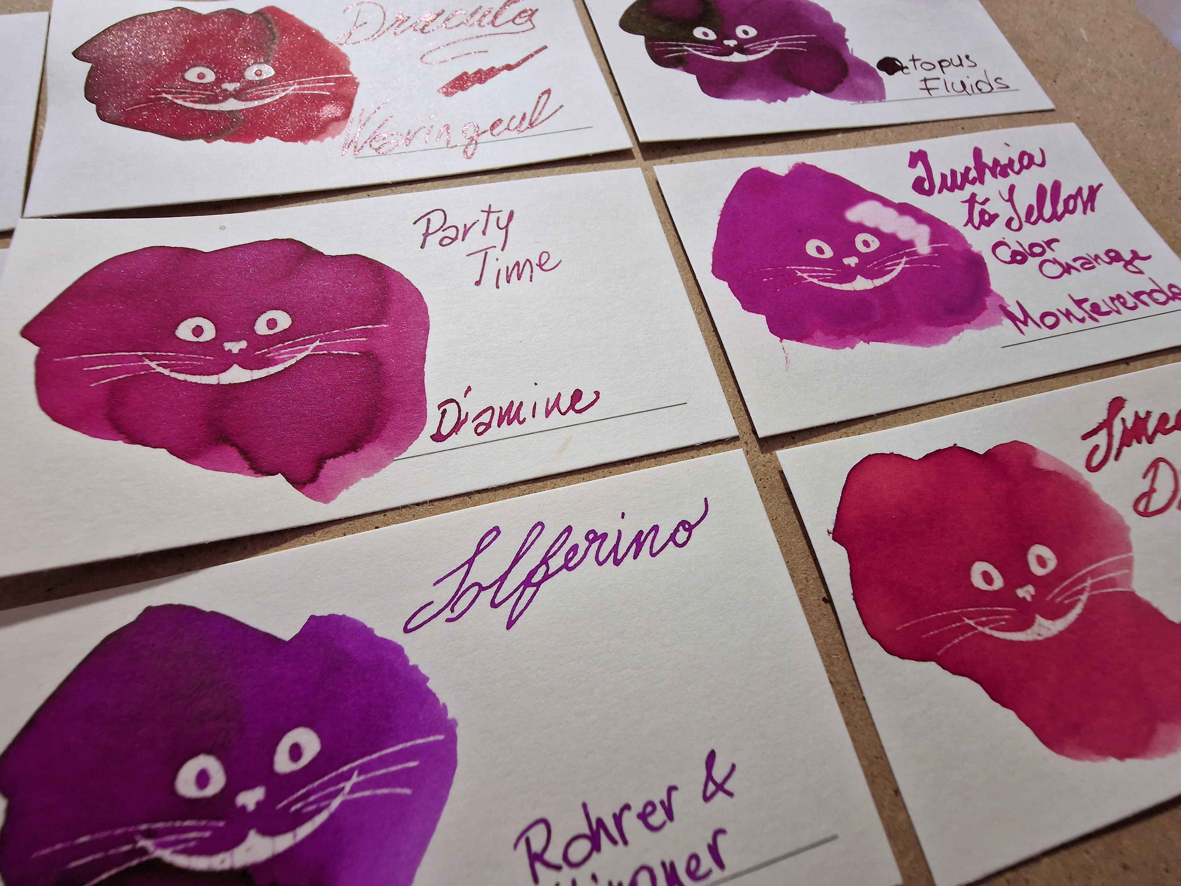 Che belli questi Gatti del Cheshire, li ho presi anche io. L'inchiostro lo trovo bello vivace, bel colore, ma non amo gli shimmer. Ti consiglio di caricarlo su penne facilmente smontabili per una pulizia più approfondita, e dal tratto largo per meglio apprezzarne gli effetti speciali. Poi ti tocca shakerare la penna ogni volta prima di scriverci :D