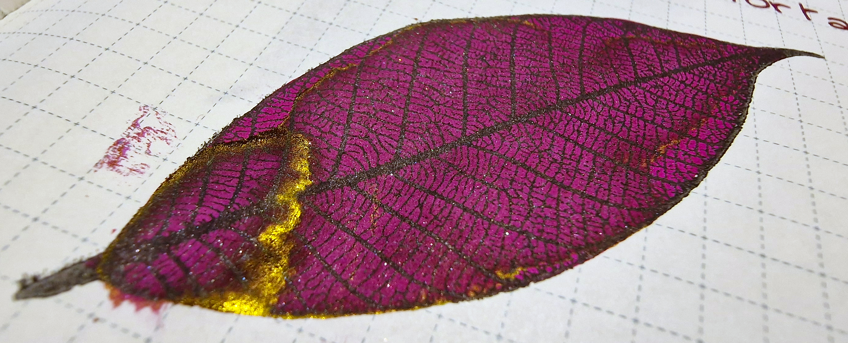 Solitamente, gli inchiostri in base rossa o magenta hanno sheen più bronzeo o più verde. In questo inchiostro, l'oro è definitivo, non tende al rosso o marrone, non tende al verde. E' un oro giallo deciso, molto metallico. In aree di accumulo abbondanti, l'inchiostro sembra coperto da foglia d'oro più che avere semplicemente uno sheen.