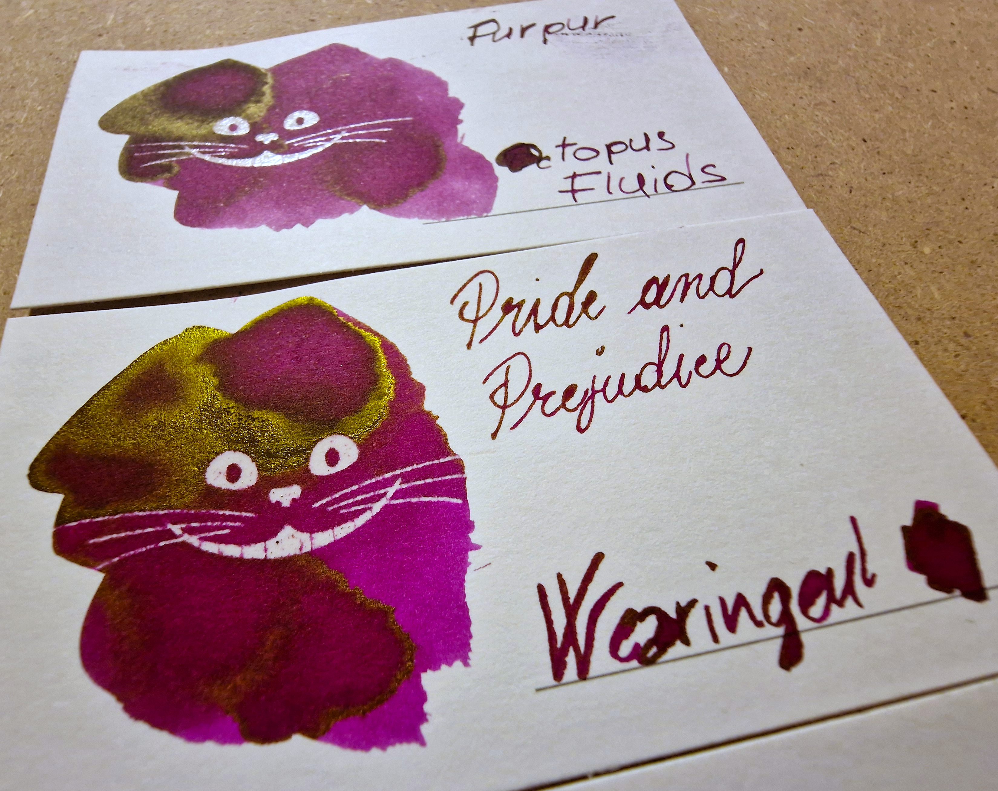 Il colore di base di questo inchiostro è molto comparabile al Pilot Iroshizuku Yama-Budo. Yama-Budo è un poco più violaceo e desaturo rispetto a Pride and Prejudice, meno vellutato e avvolgente. C'è somiglianza anche con Octopus Fluids Purpur. Questi tre inchiostri differiscono nello sheening. Purpur di Octopus Fluids ha un tipico sheen bronzo, Yama-Budo ha uno sheen che tende di più al verdognolo.
