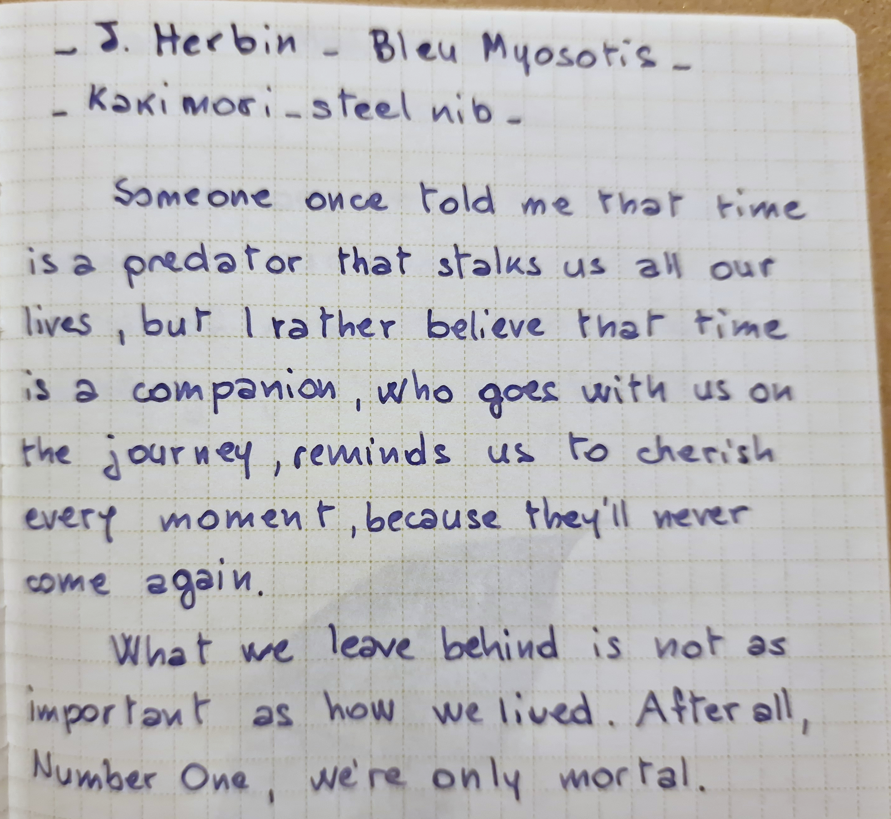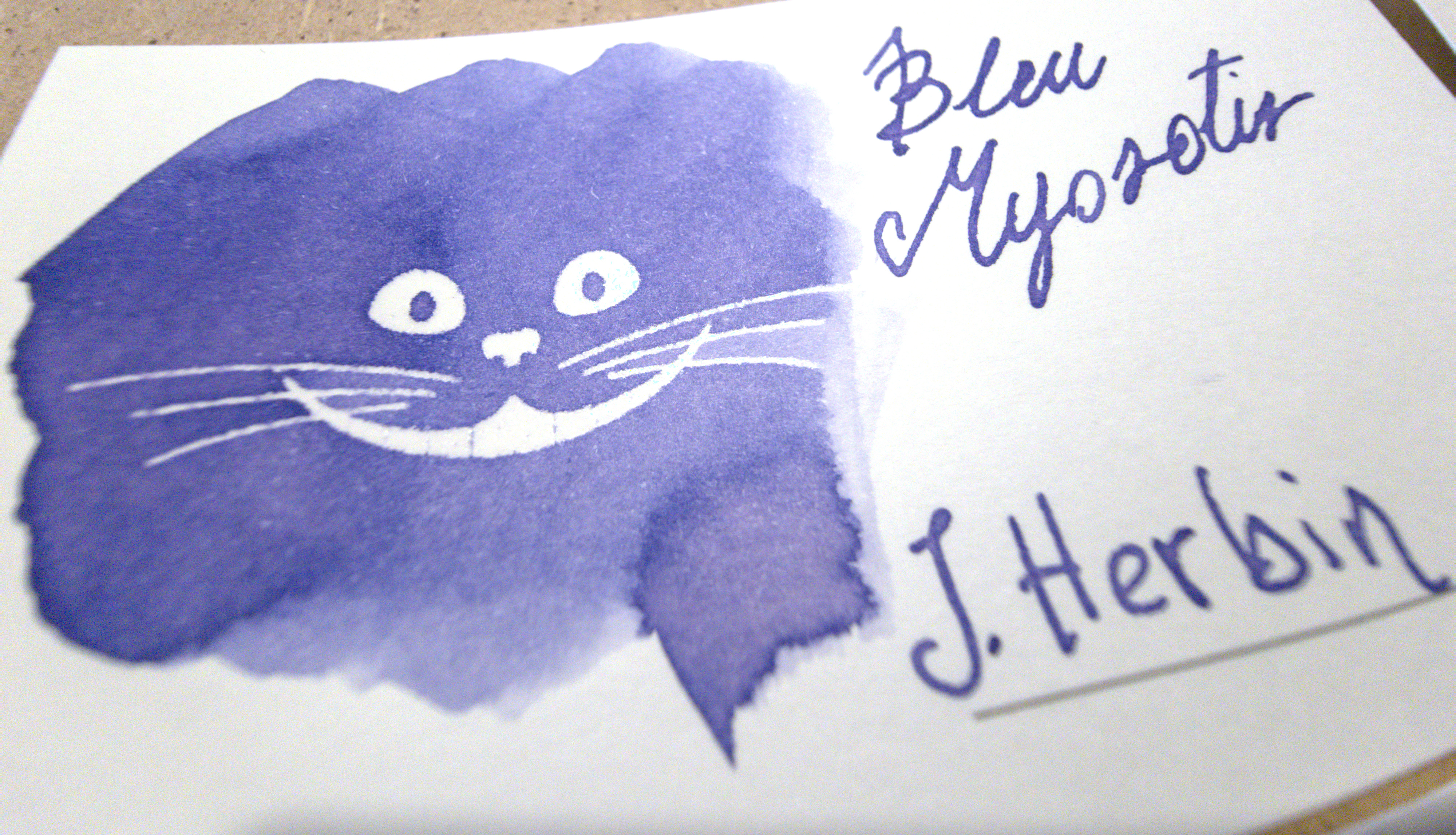 Quanto non mi entusiasma di questo inchiostro è il fatto che - a un tratto standard - appaia molto come un qualunque blu. Intendo: quando lo guardi en passant, senza soffermartici molto. E io non sono una fan del blu standard, l'ho usato per troppi anni, mi ha stufata. Quando l'ho acquistato (fortunatamente, Herbin produce anche flaconcini di prova da soli 10 ml) speravo di più in qualcosa di più "campestre", dato il nome. I myosotis non sono così scuri, in genere, e speravo che questo inchiostro li avrebbe rappresentati un poco meglio.