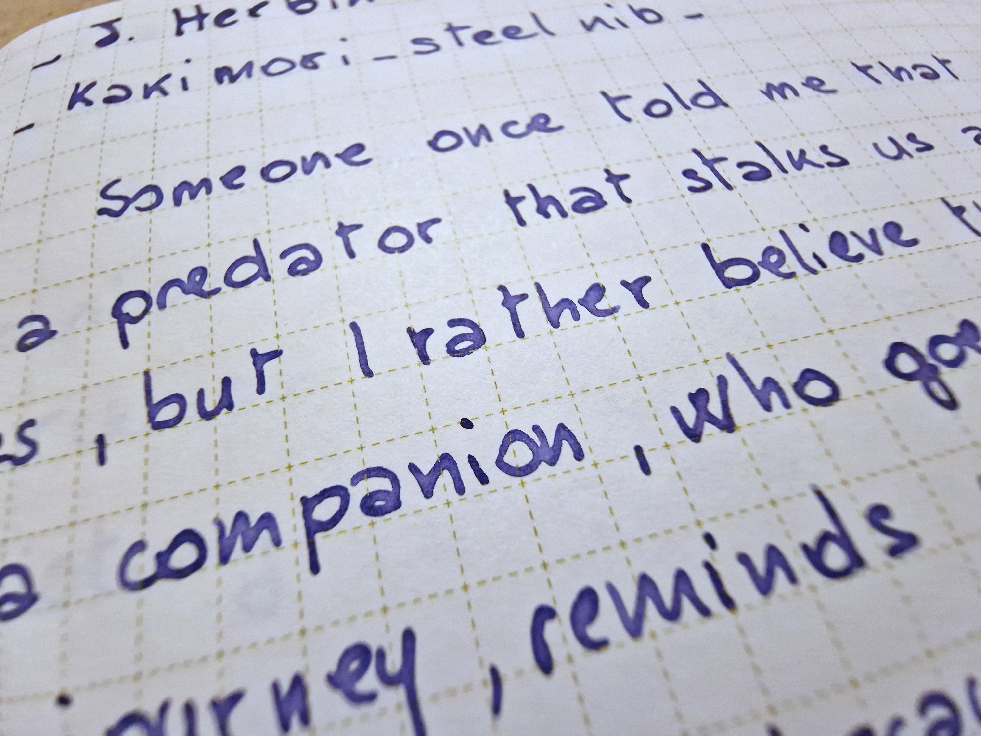 Al contempo, ci sono momenti in cui mi piace parecchio, in particolare quando non lo uso in una penna. Sono i momenti in cui si leva la timidezza e l'inchiostro rivela la sua complessità. A spennellarlo, è interessantissimo, con shading multi-cromatico di viola e rosa: perché non si mostra di più nello scritto?