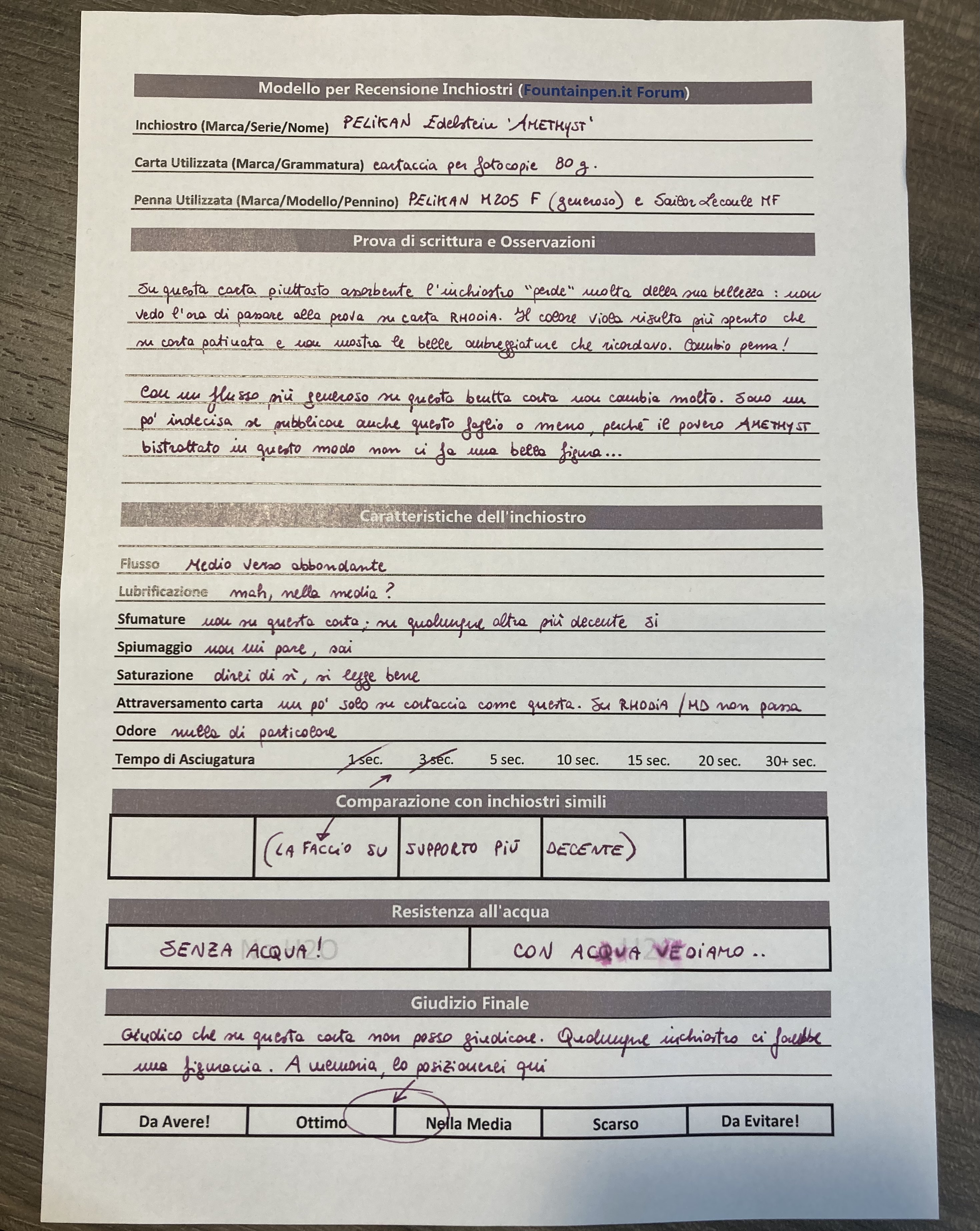 Altre note: Amethyst non trapassa la carta, se appena di qualità decente, non spiuma e si asciuga velocemente. Lo ricomprerei se mi finisse il calamaio domani. Ha flusso nella media, appena tendente al generoso, ma senza esagerazioni. Spero vi sia utile :wave: