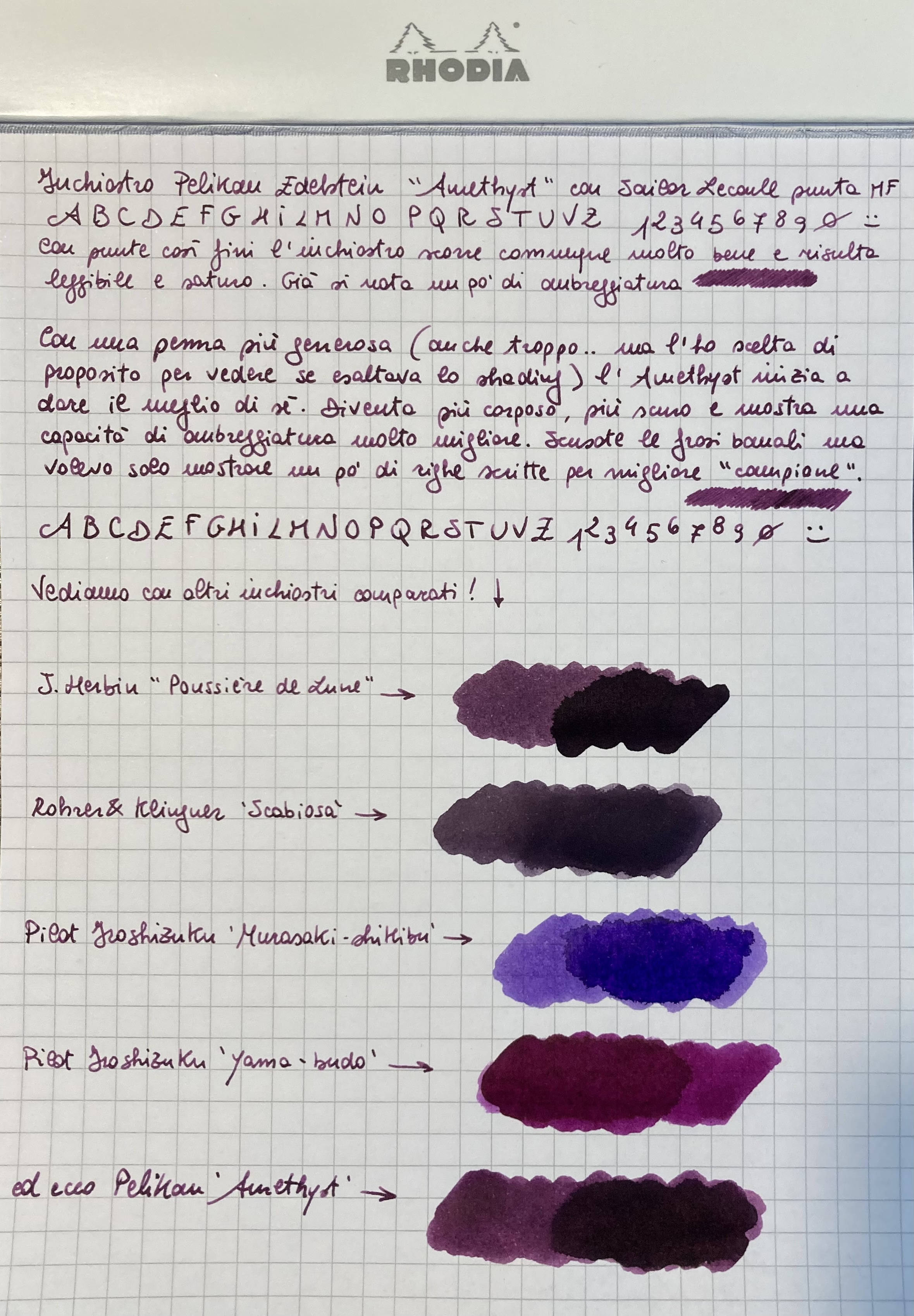 Amethyst risulta un colore profondo e non squillante, capace di una buona ombreggiatura soprattutto con pennini dal flusso abbondante o comunque con punte da M in su; lo avevo provato su un Jowo #6 stub 1.1 e faceva meraviglie! Purtroppo non ho più quella penna per mostrarvi un esempio (fidatevi :D ).