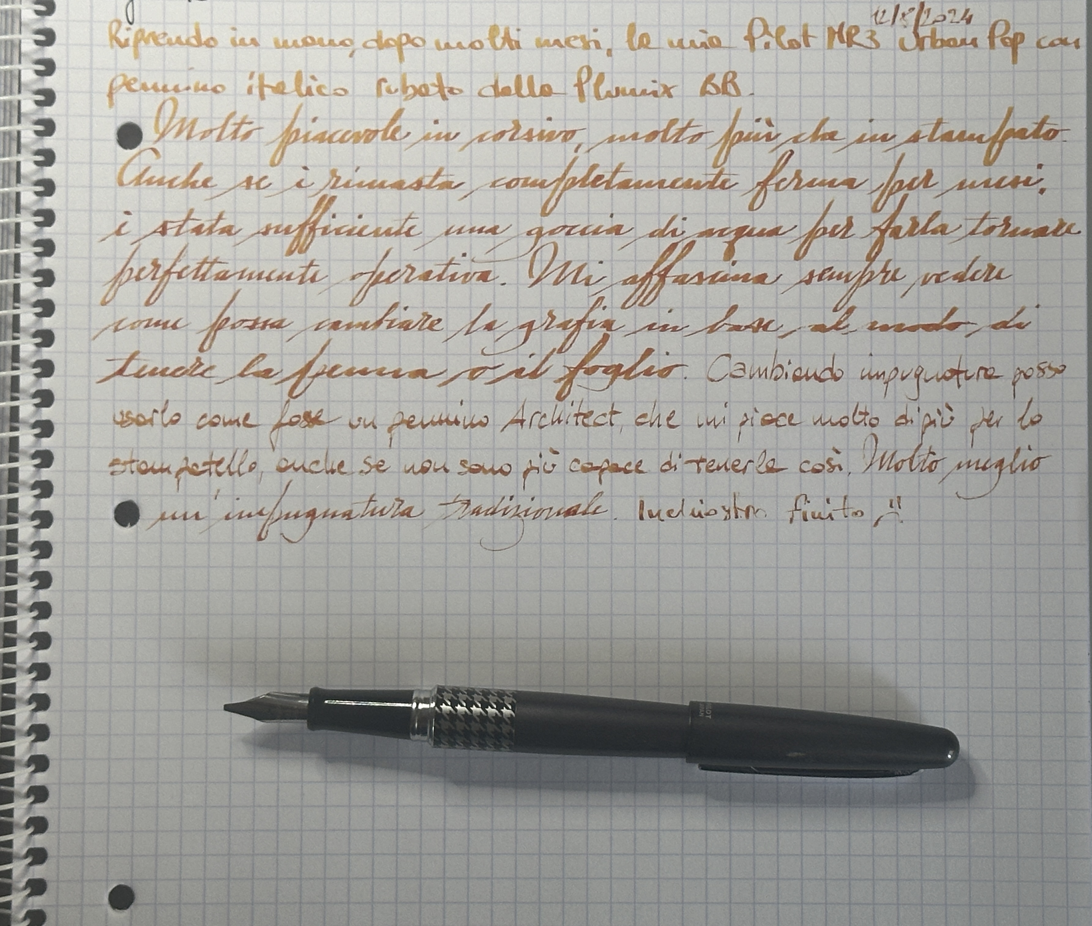 Passiamo al motivo del mio acquisto: il pennino. Per qualche oscuro motivo che a noi volgari acquirenti non è dato conoscere, qualcuno in casa Pilot ha deciso di denominare i pennini delle Plumix come dei semplici EF, F, M, B e BB, benché questi siano tutti pennini italici di gradazioni differenti e la stessa penna venga venduta come una penna calligrafica. Il pennino che ho acquistato è un M, ovvero un italico di 0.58 mm, e devo dire che fa il suo lavoro: buone variazioni di tratto, ma gratta un po' sulla carta quando lo si scorre verso l'alto.