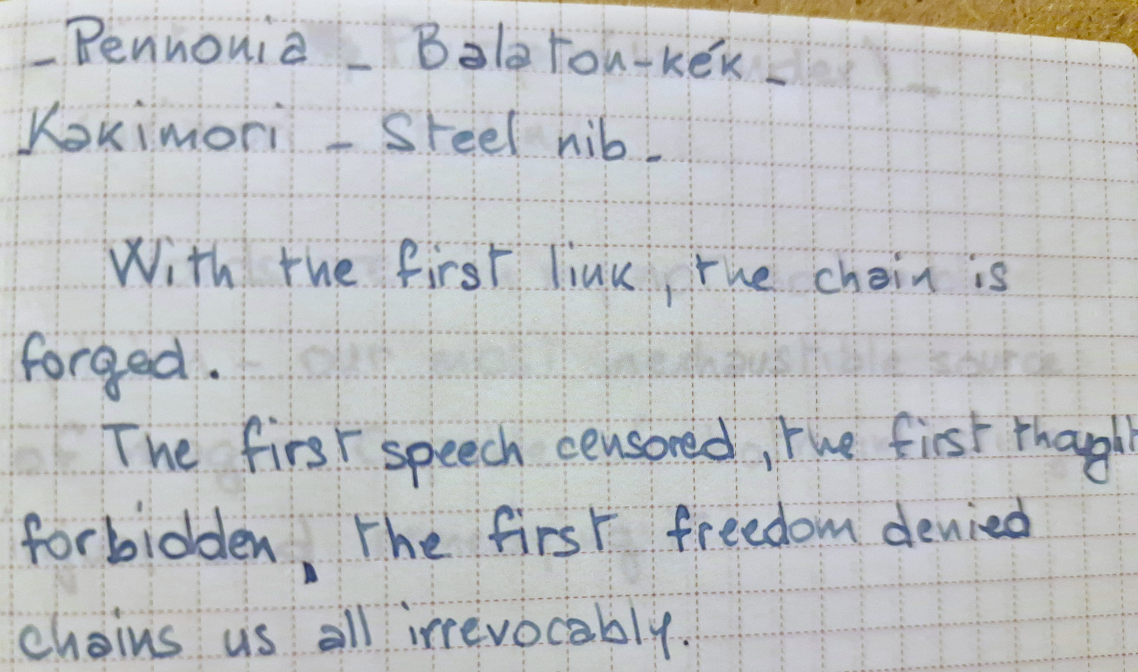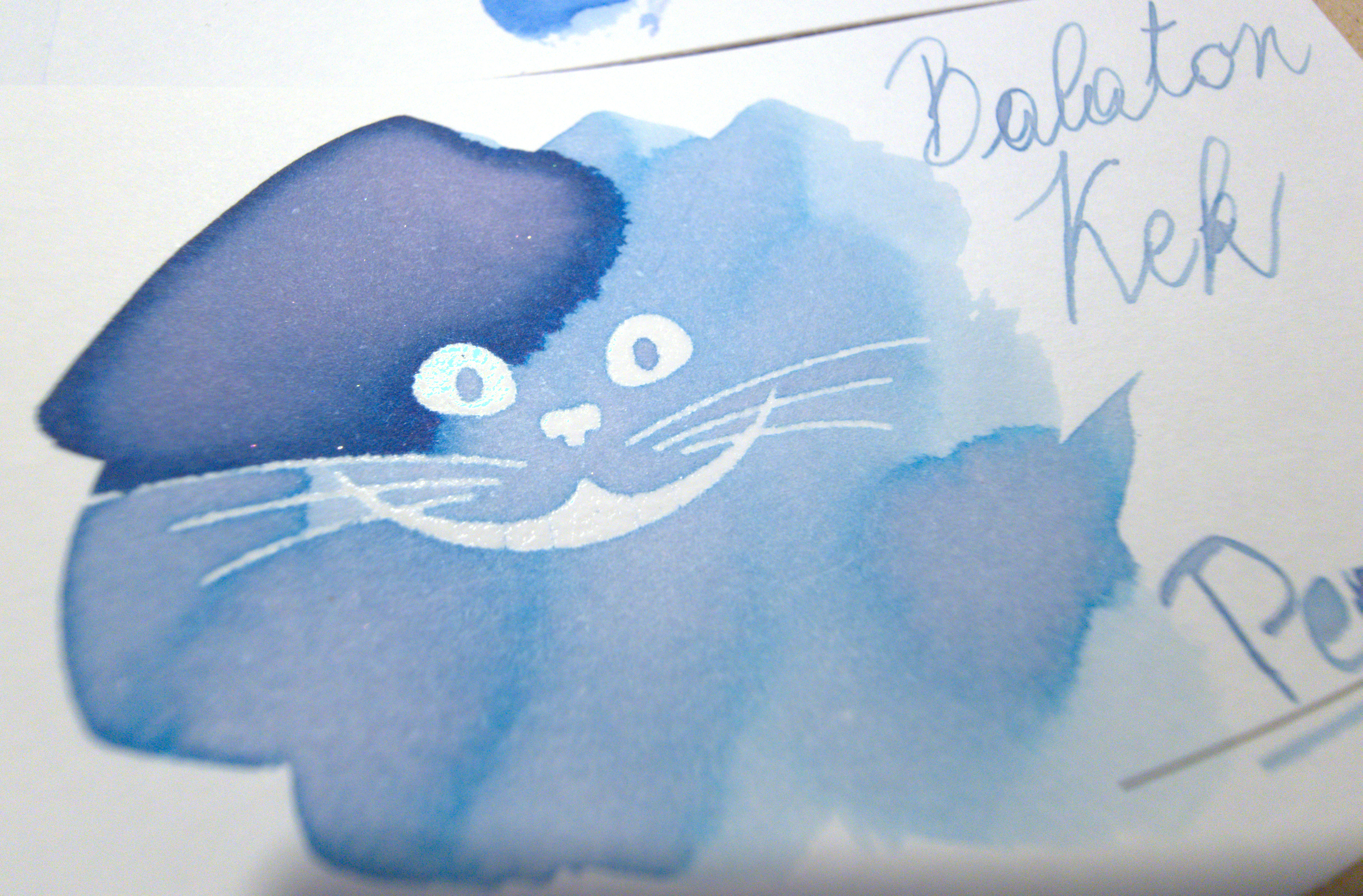 Questo tipo di azzurro mi piace così tanto che ho pasticciato con Abalone di Troublemaker [QUI: viewtopic.php?t=32813] così da scaldarlo un poco (e ci ho anche aggiunto glitter iridescenti) e l'ho infilato fisso in una delle penne che tengo inchiostrate. Non è che non mi bastavano due inchiostri che - senza pasticci - già erano del colore giusto, è che ho voluto studiare un modo di usare Abalone invece di abbandonarlo a sé stesso :lol: Ma siamo off topic, torniamo a parlare di Balaton Kék.