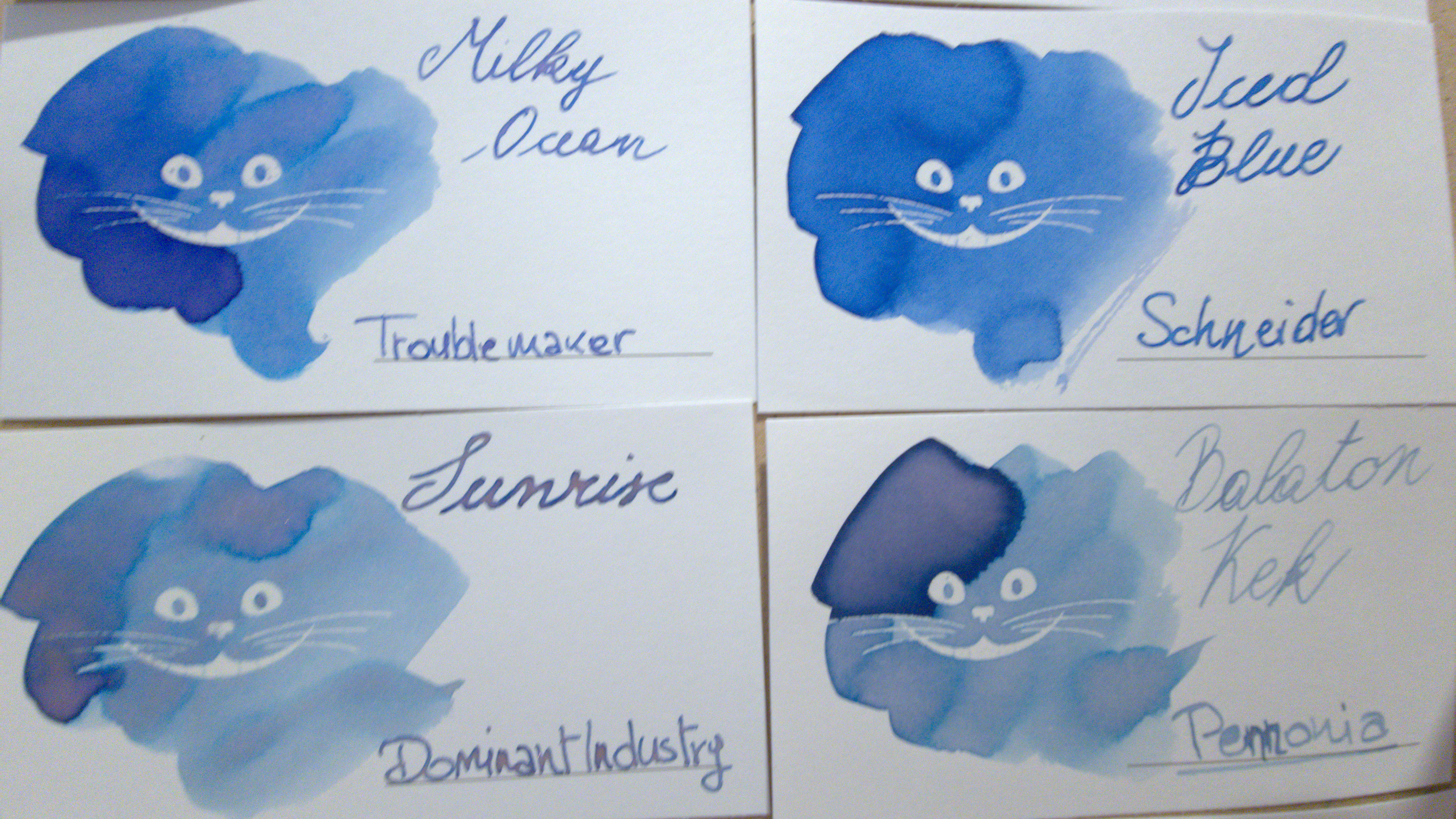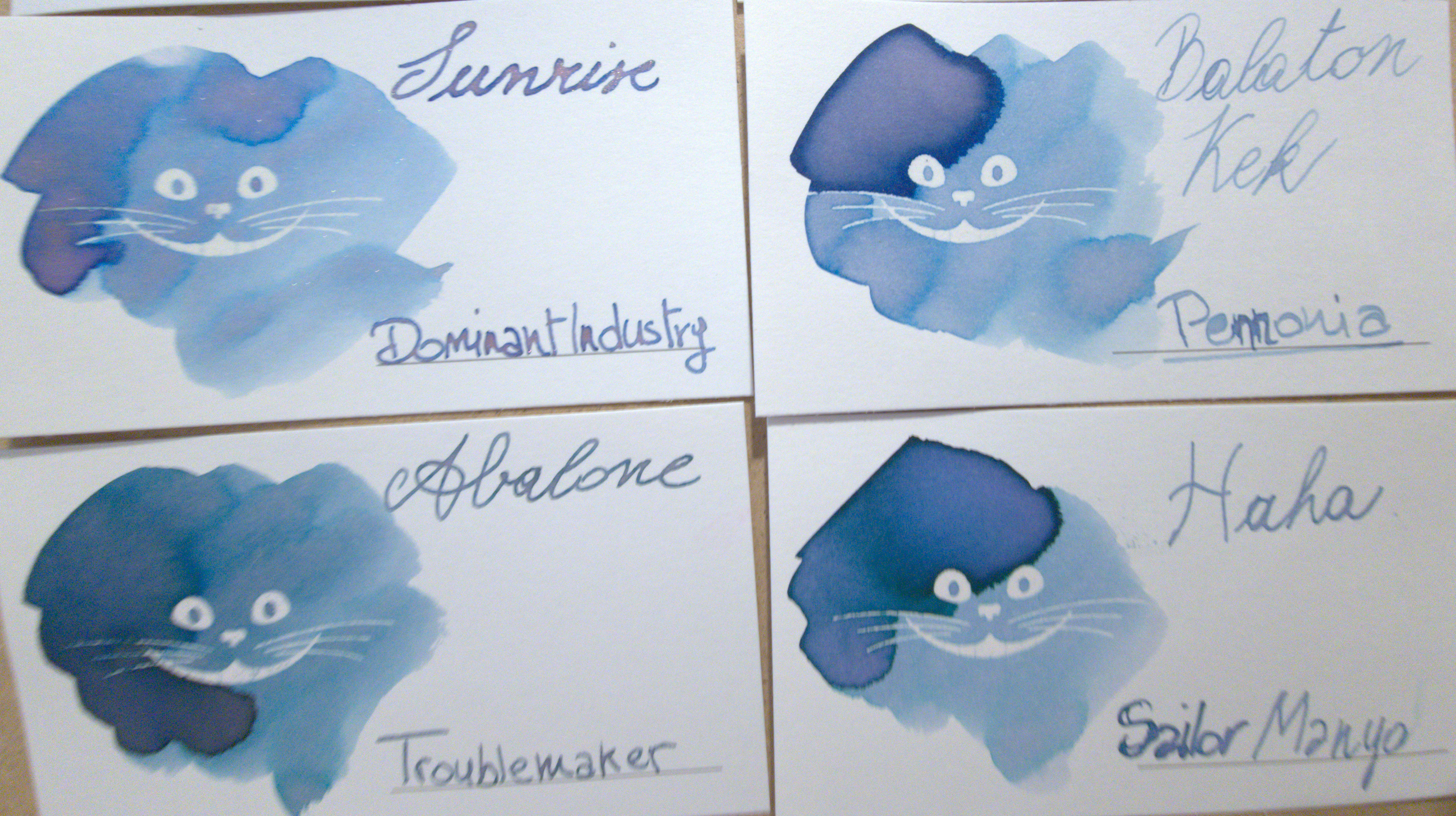 Tra gli inchiostri presenti nella mia collezione, Balaton Kék si confronta al meglio con Sunrise di Dominant Industry. Sembrano quasi gemelli. Sunrise è un tocco più caldo, calore coadiuvato anche dalla presenza di glitter ramati. Balaton Kék è più caldo rispetto a Sailor Manyo Haha