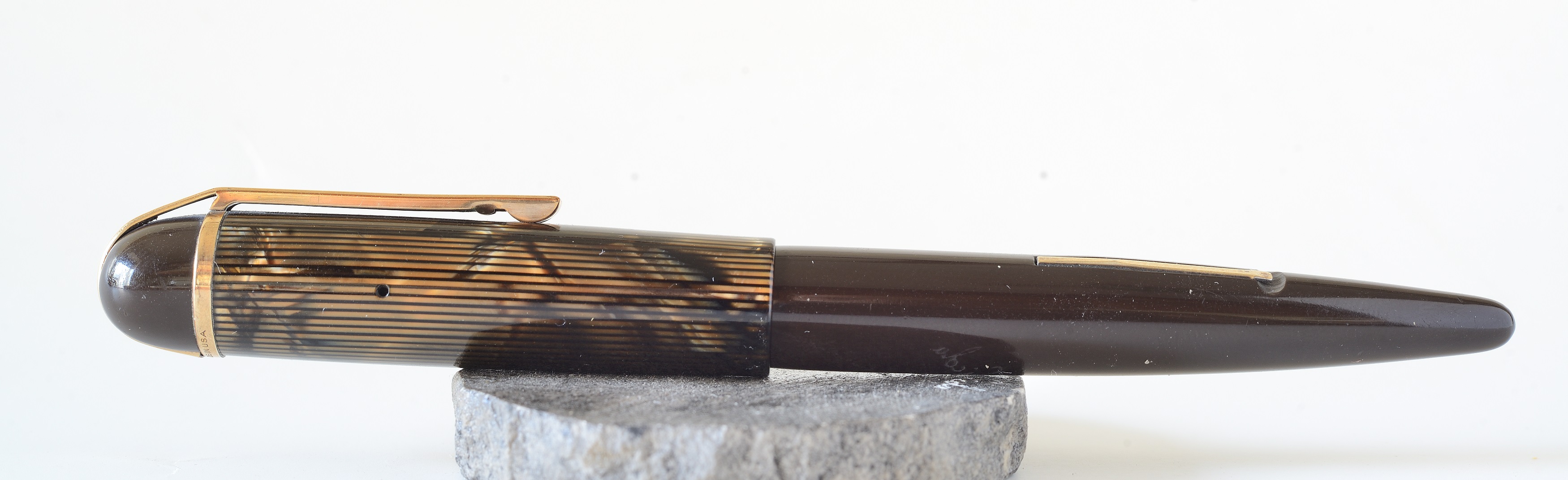 allego alcune foto di due Wahl Eversharp, una Skyline Brown Moirée con pennino insolito, ha il foro di sfiato esagonale circondato da una goccia (o lacrima) incisa, la scritta Eversharp in diagonale sormontata da una linea parallela con il 14 K sottostante. Leggevo qui: