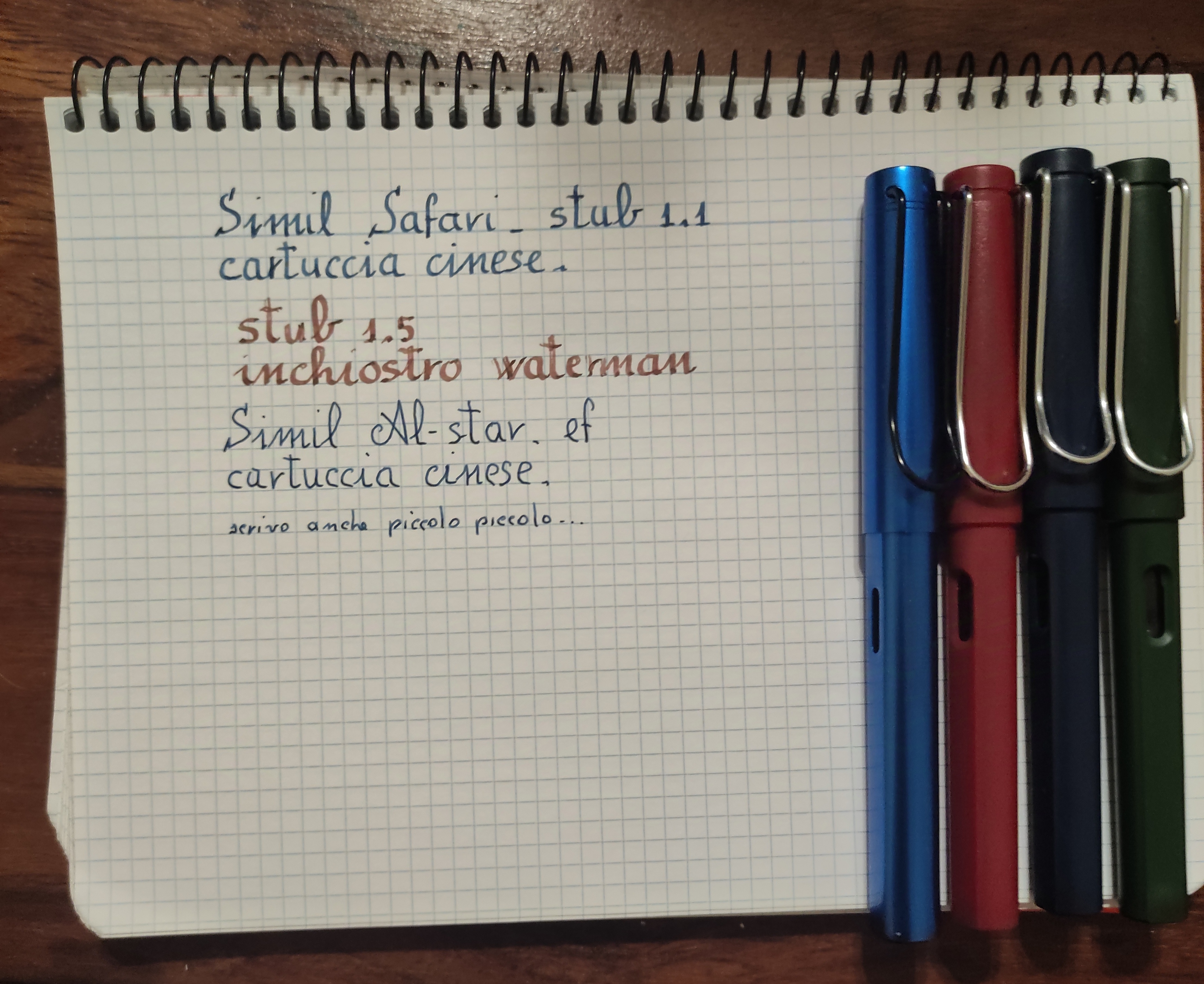 Nella mia raccolta non ho una Lamy. Nel mio ultimo ordine sul market cinese ho preso un po' di imitazioni Safari, per testare i pennini stub cinesi . Sono rimasto stupefatto dalla ottima qualità di scrittura, la simil Al star poi mi piace particolarmente, anche se il cappuccio non si può calzare affatto.