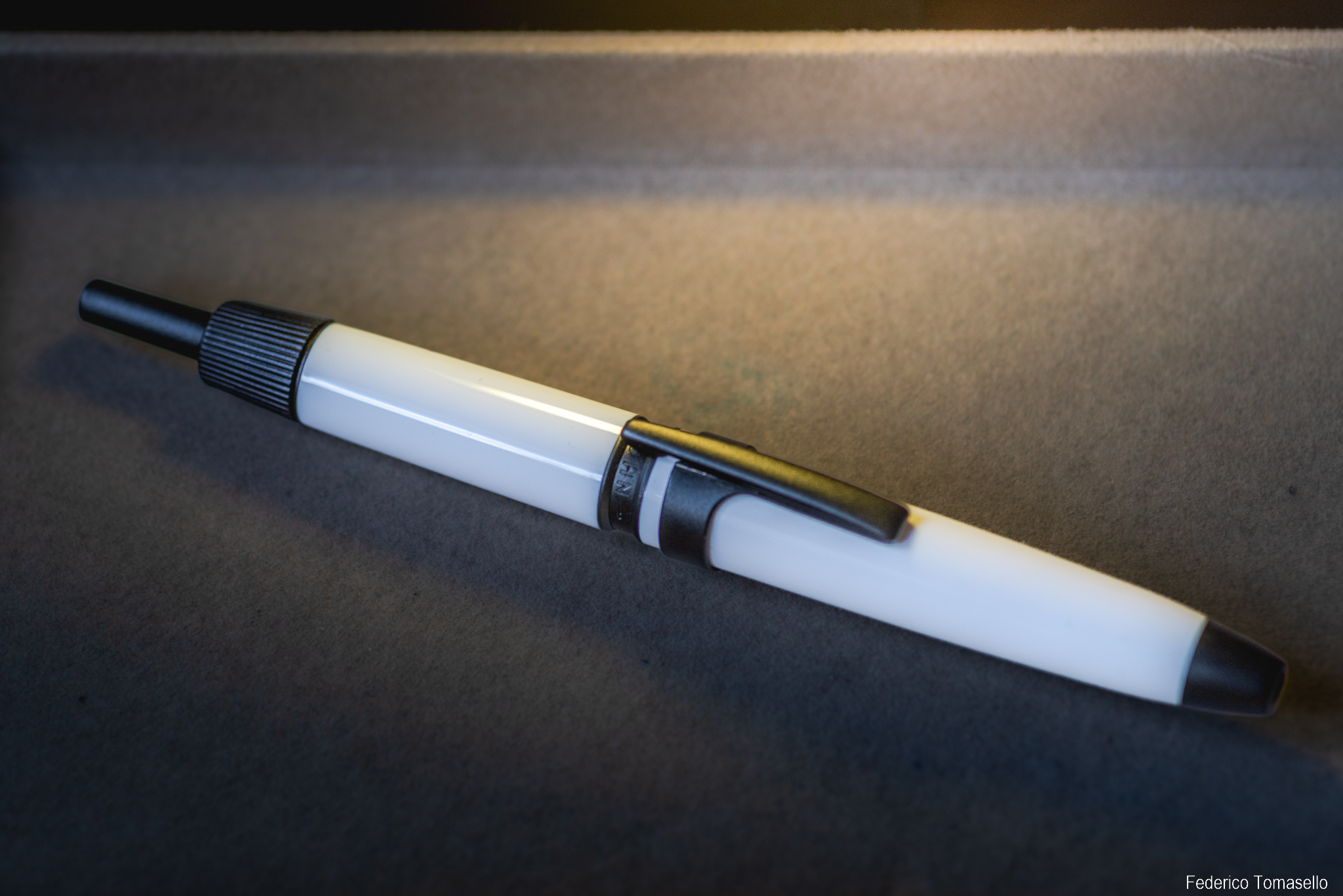 La penna ha una forma abbastanza classica, con cappuccio senza clip, ma una bella livrea marmorizzata bianca con venature verdi; inoltre la costruzione sembra a prova di bomba, con plastiche spesse e ben tornite. Giusto lo "scalino" sull'impugnatura poteva essere meno spigoloso, stona un po' con il tondeggiare delle altre forme. Ma è un peccato veniale, per quanto mi riguarda.