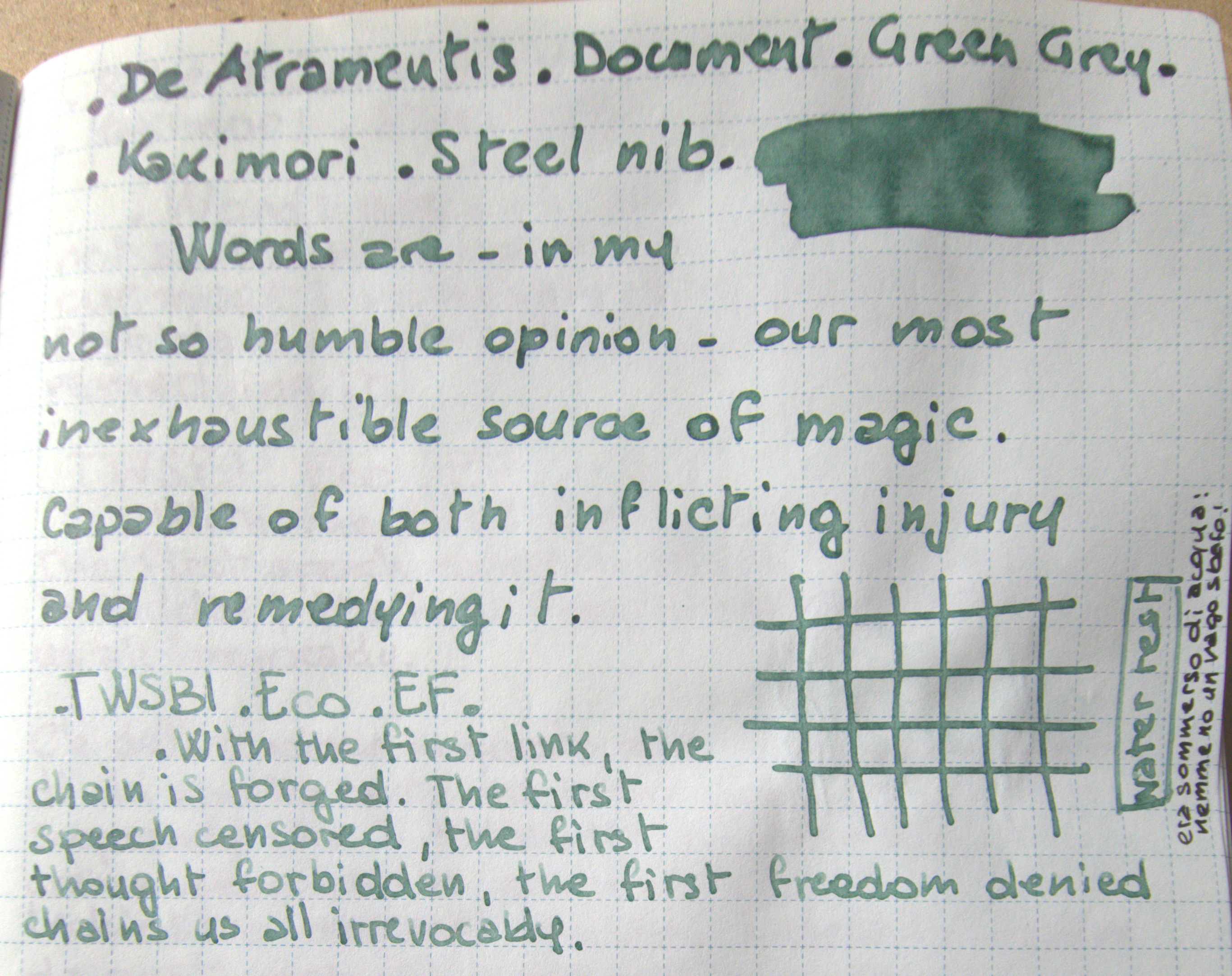 Per la resistenza alla luce, ho trovato questo sito che ha testato l'intera linea Document: https://hudsonvalleysketches.blogspot.c ... -inks.html e Green Grey non si è comportato in modo eccellente. E' sbiadito dopo 6 mesi di esposizione alla luce, tuttavia non è scomparso: è già qualcosa.