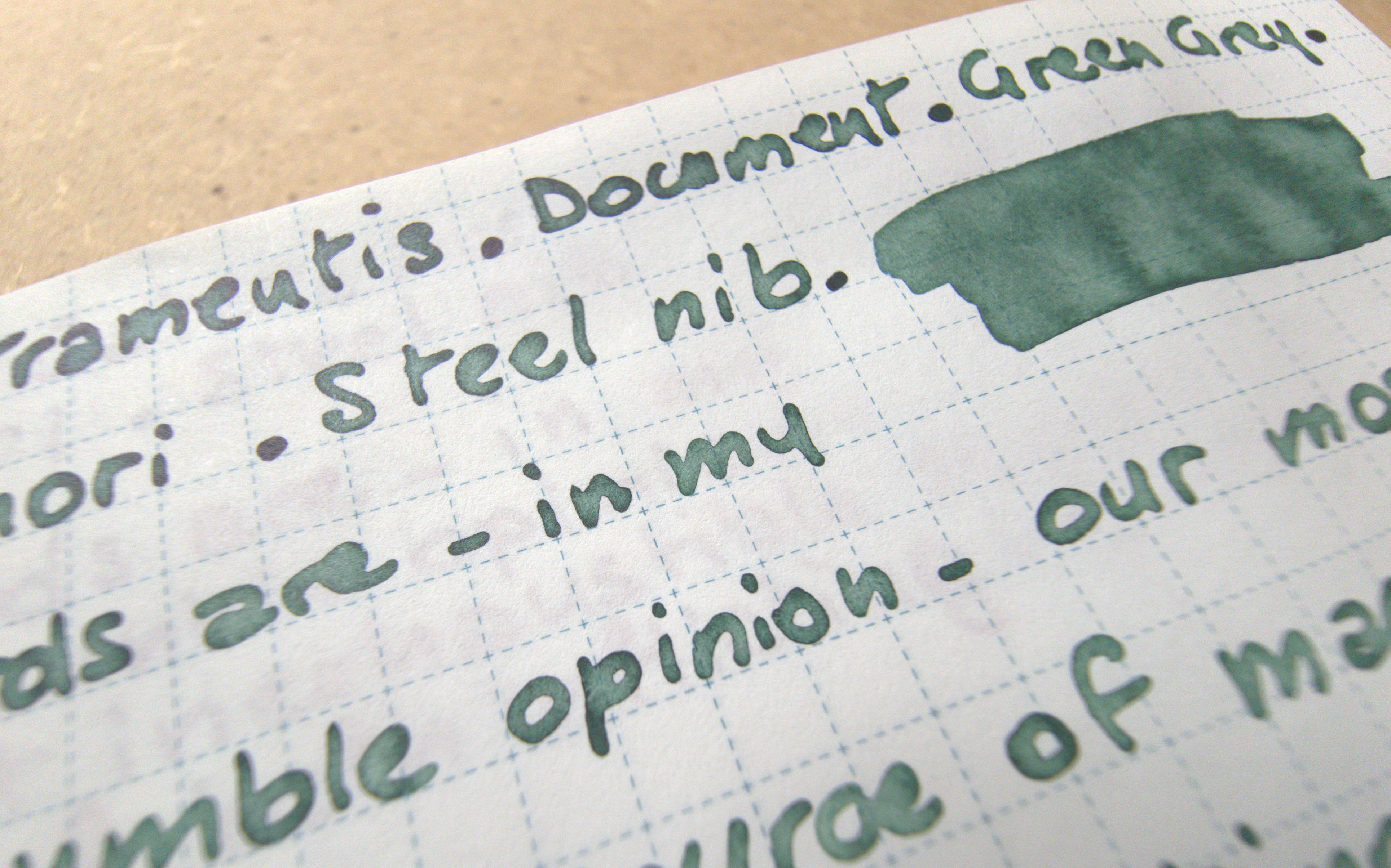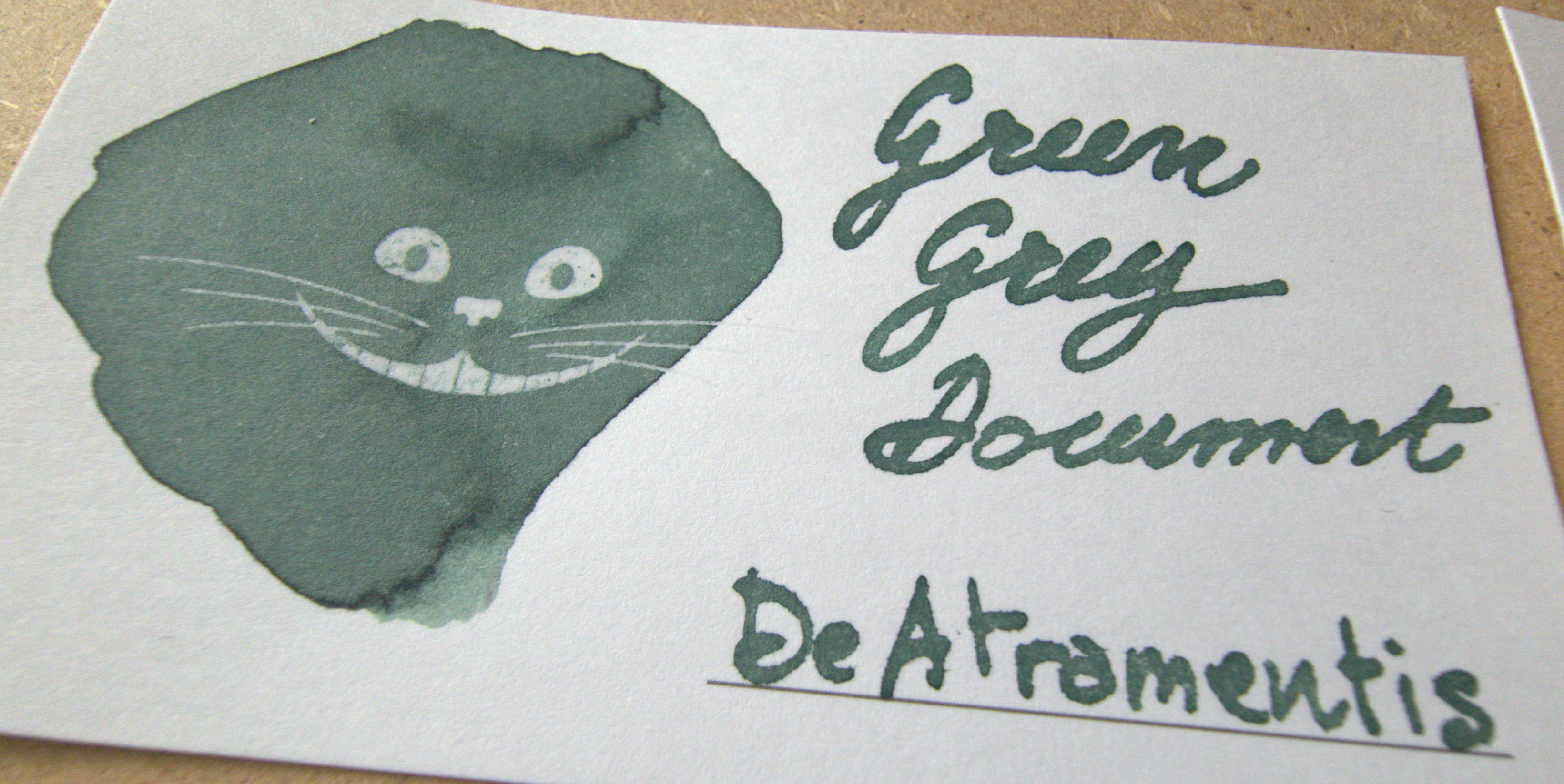 Document Green Grey è un verde neutro con sottotono freddo, desaturato, ha medio-bassa capacità di shading, non ha chromashading, non ha sheen. Non ha glitter. E' un inchiostro dichiarato come resistente all'acqua, alla luce, adatto a documenti.