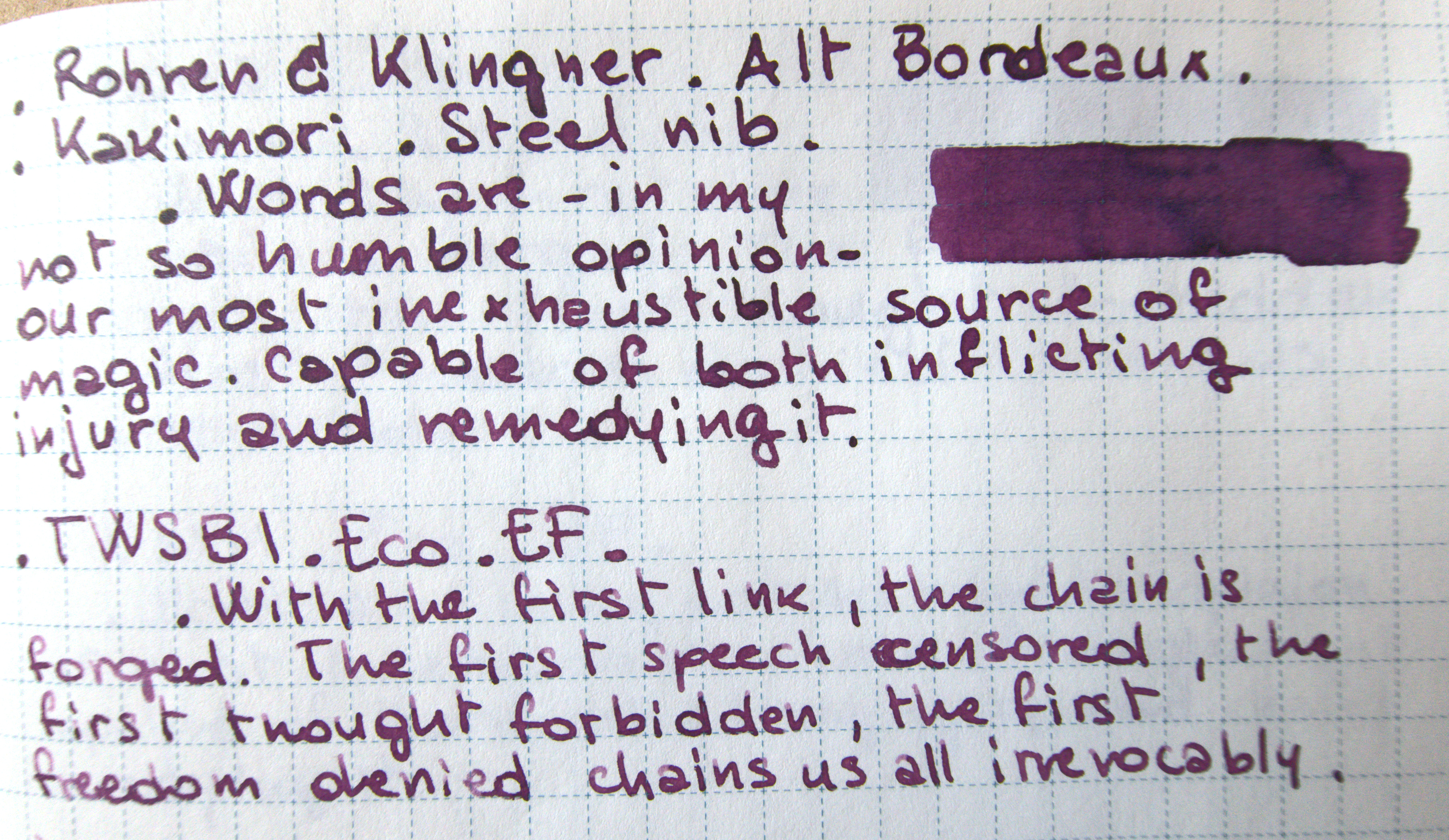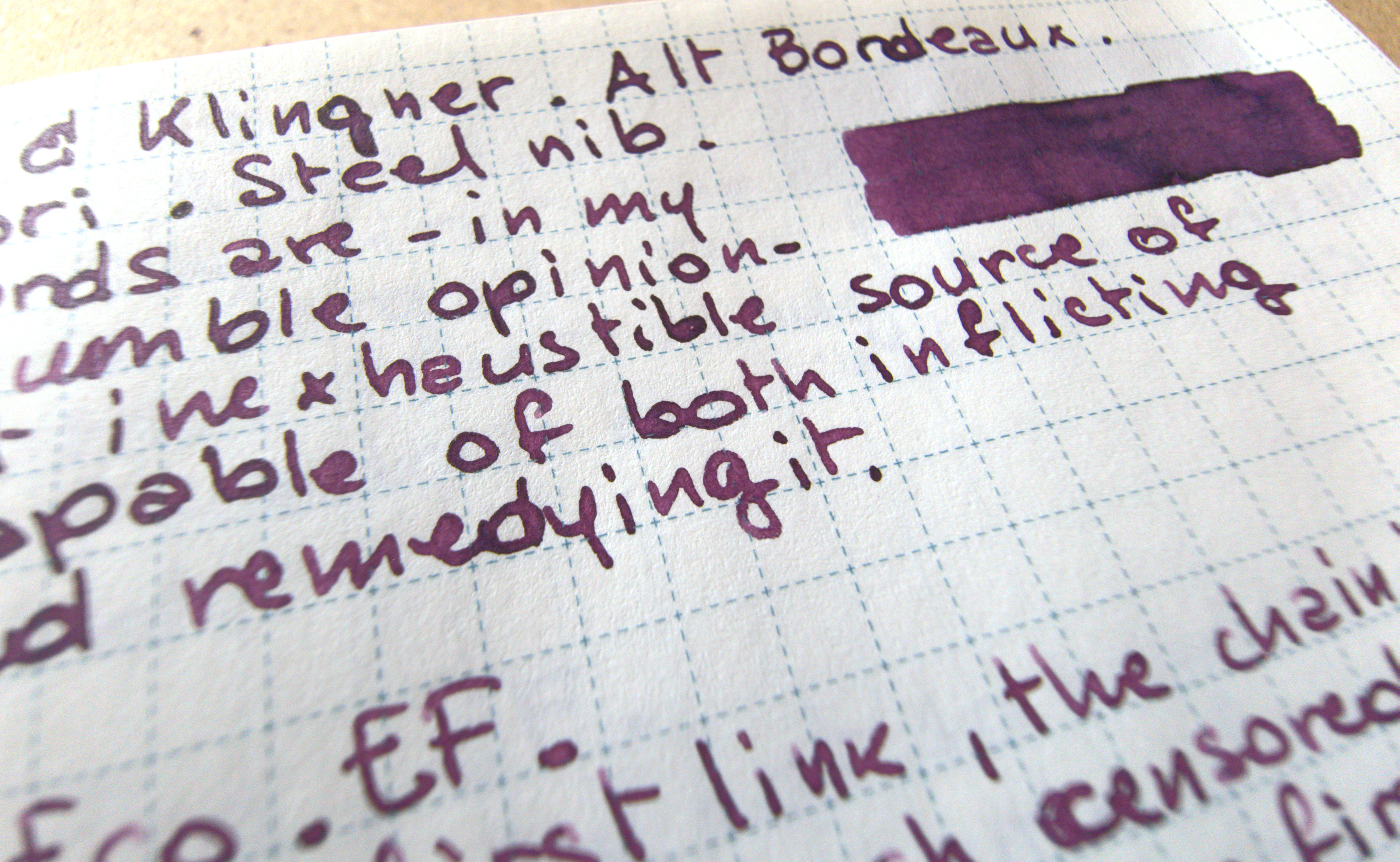 Alt Bordeaux è un inchiostro tendente al bagnato ma non sbrodolone. Ho la tentazione di caricarlo in una architect per stimolare lo shading, perché su un inchiostro così cupo fa ancora più gran figura che su inchiostri chiari.
