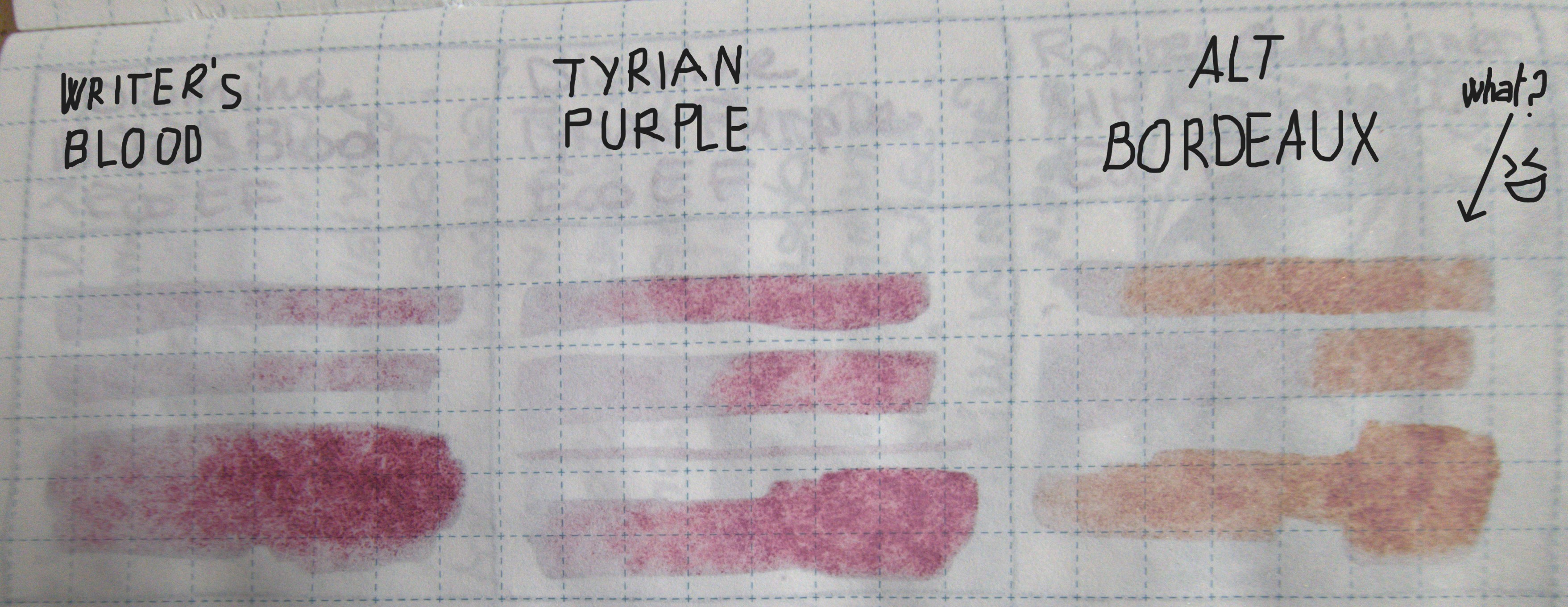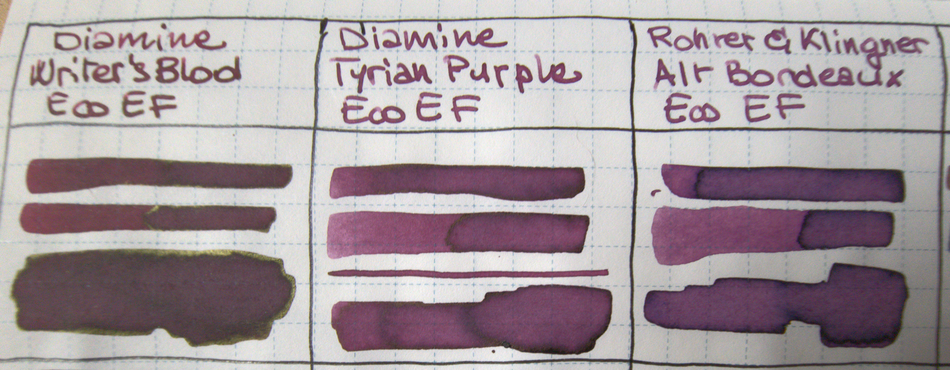 Quando l'ho usato per la prima volta, sono rimasta un poco disorientata. Se avessero chiamato Tyrian Purple di Diamine [QUI: viewtopic.php?t=33282 ] "bordeaux", l'avrei trovato molto sensato. Alt Bordeaux è un viola. Sarà per questo che è "alt": starà per "alternativo"?