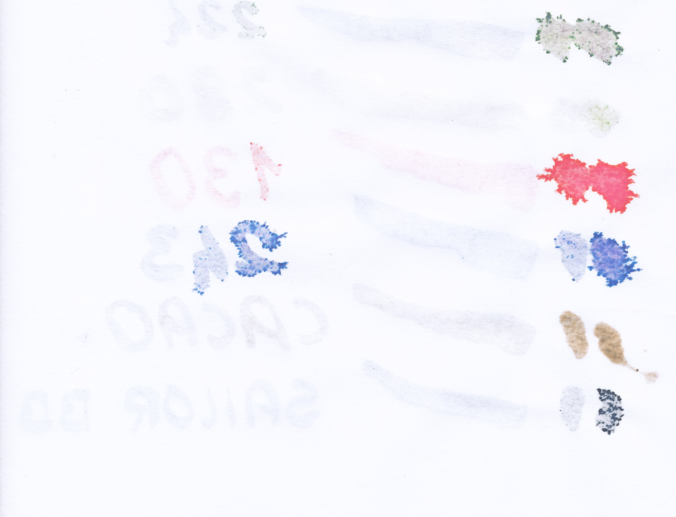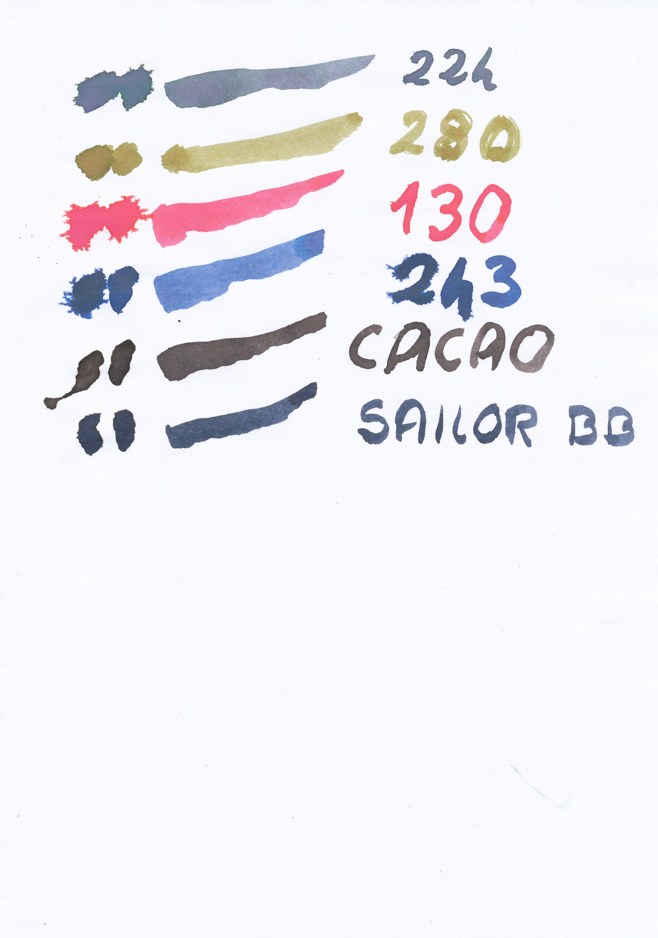 Dal punto di vista del colore, trovo carino il 243, bello il Sailor BB (che già posseggo), interessante anche il Cacao du Bresil, la cui lentezza nell'asciugare però mi ha lasciato un po' perplesso. Nella boccetta c'è ancora qualche goccia, farò una prova a vedere come si comporta in scrittura dal pennino.