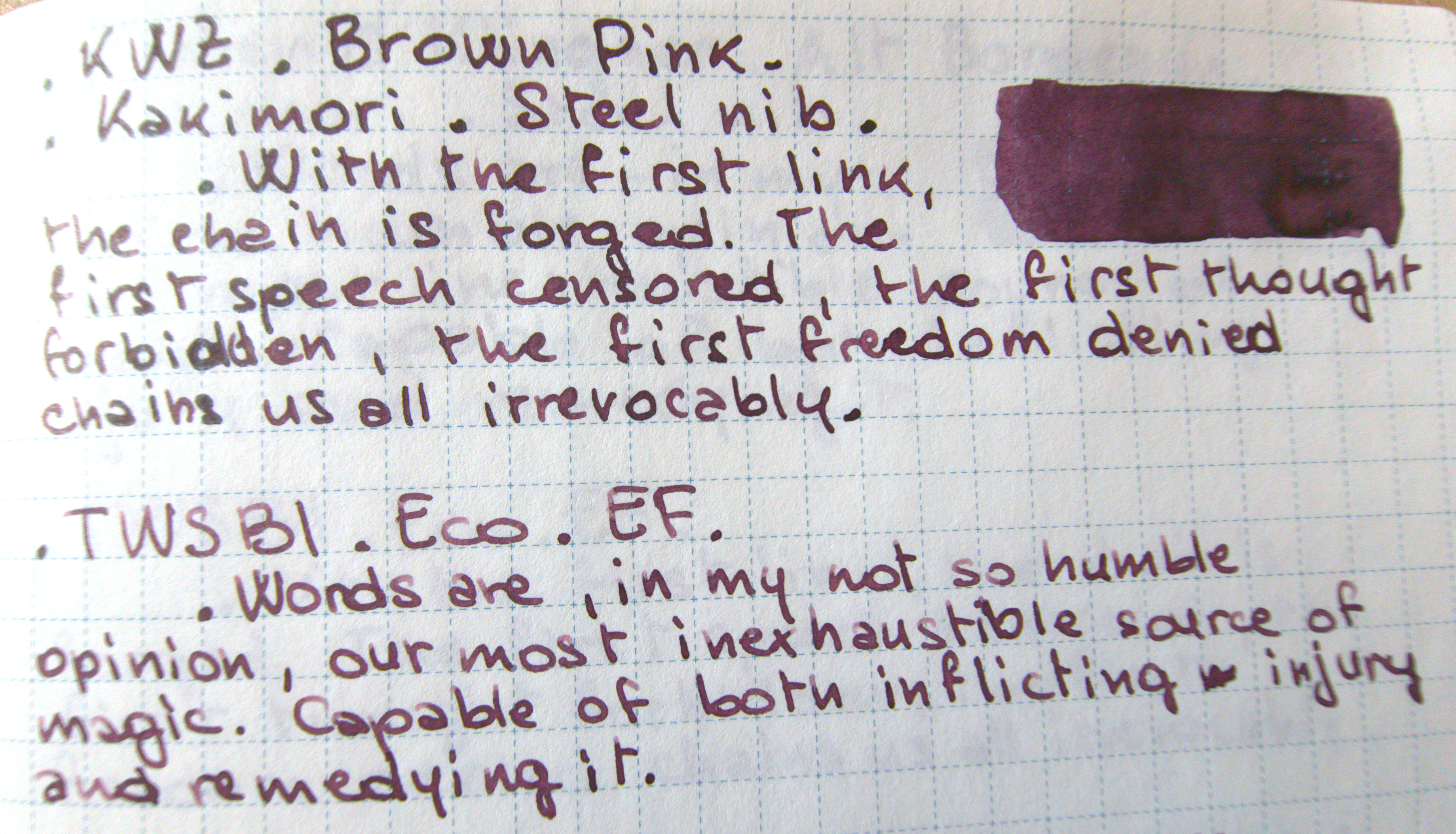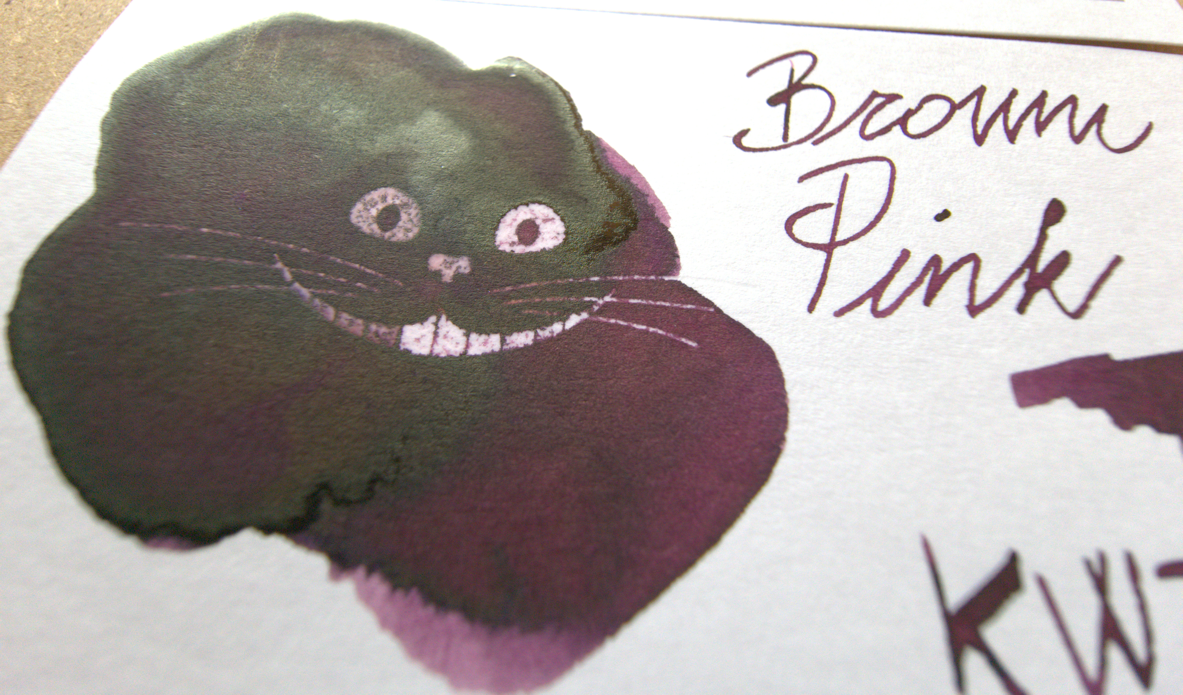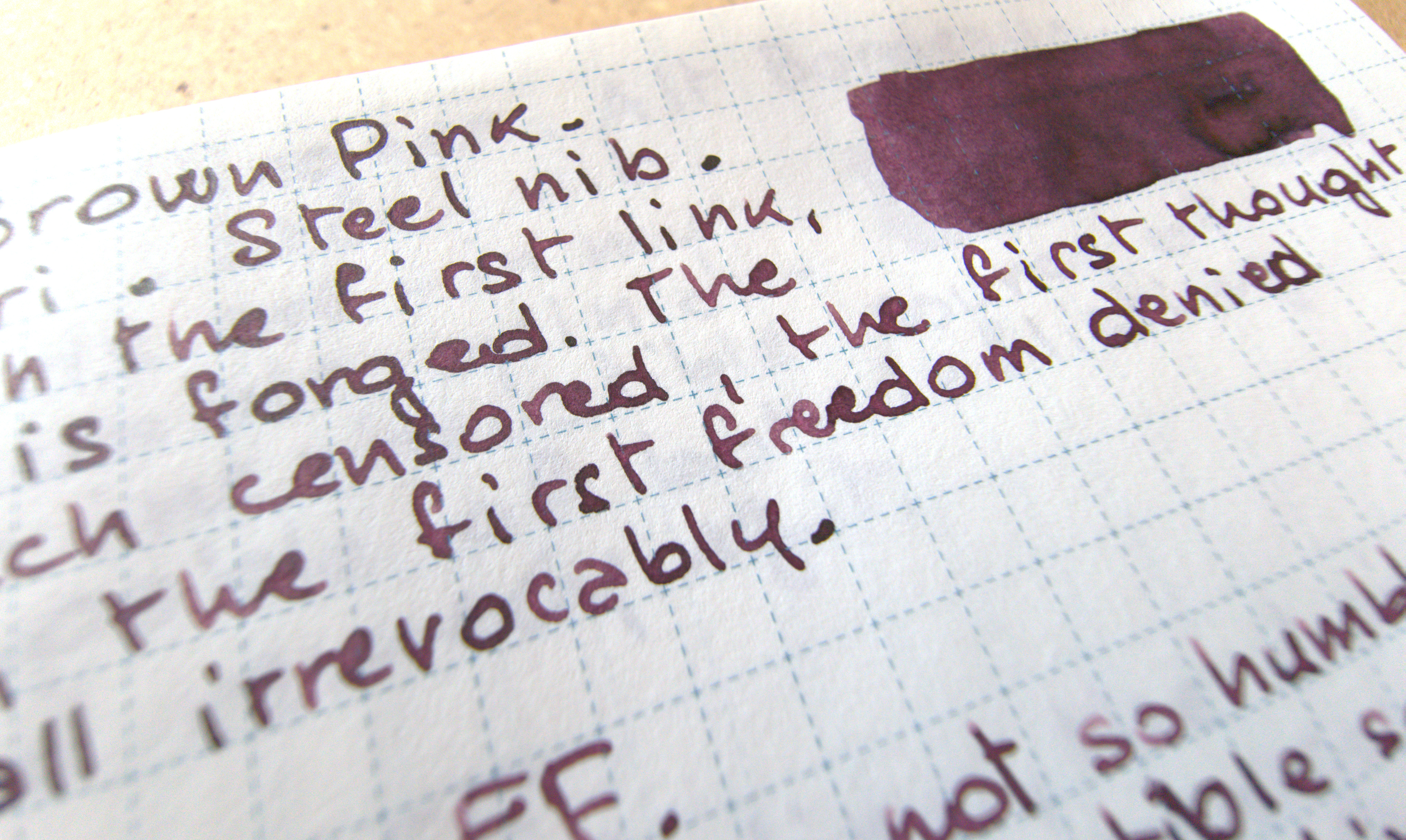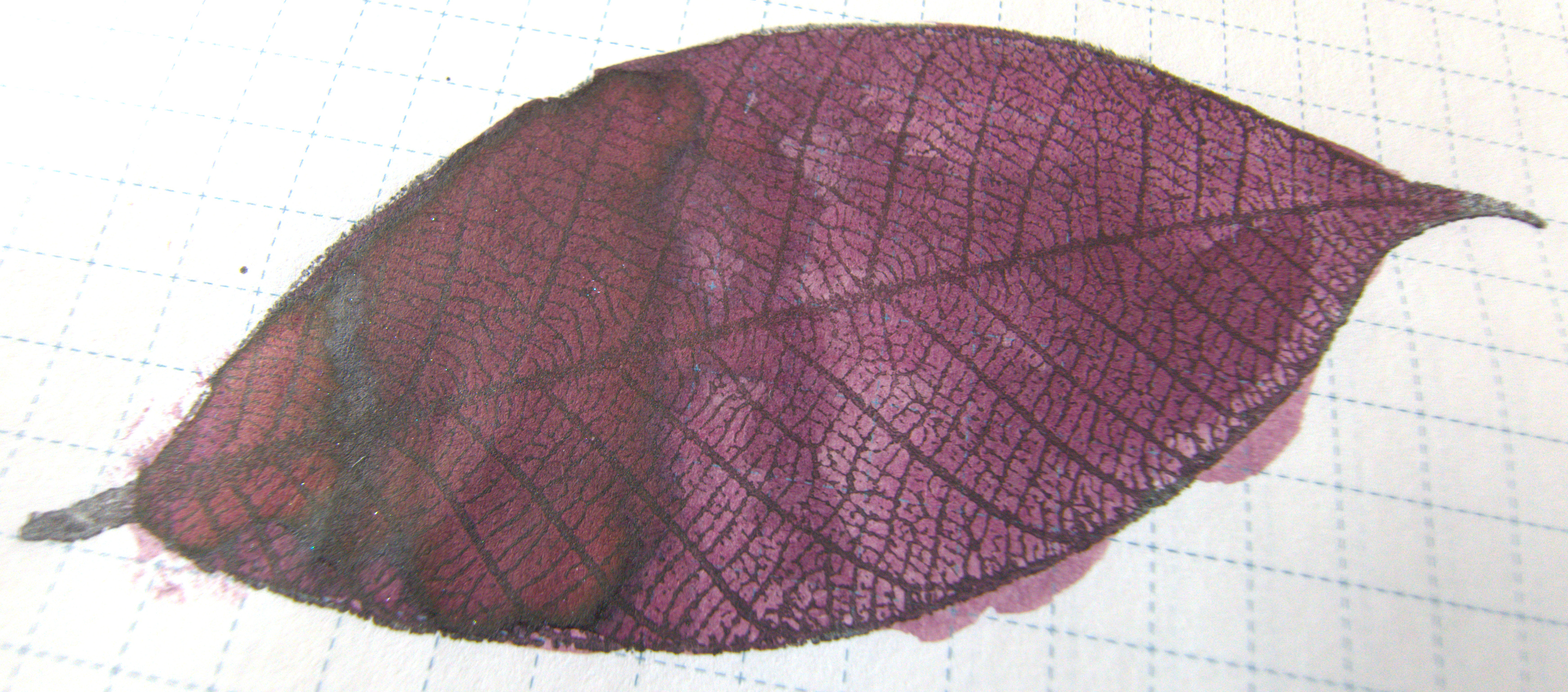 Personalmente, sono rimasta molto favorevolmente colpita da questo inchiostro già dal primo utilizzo. Nonostante il nome, non sono certa che lo definirei come un marrone. E' più un borgogna desaturato con un accenno di marrone, ovvero un maroon, secondo le tabelle colore dei pittori. Vedendo che i produttori sono polacchi, sospetto una traduzione verso l'inglese non del tutto fedele del concetto che volevano esprimere nel descrivere il colore.