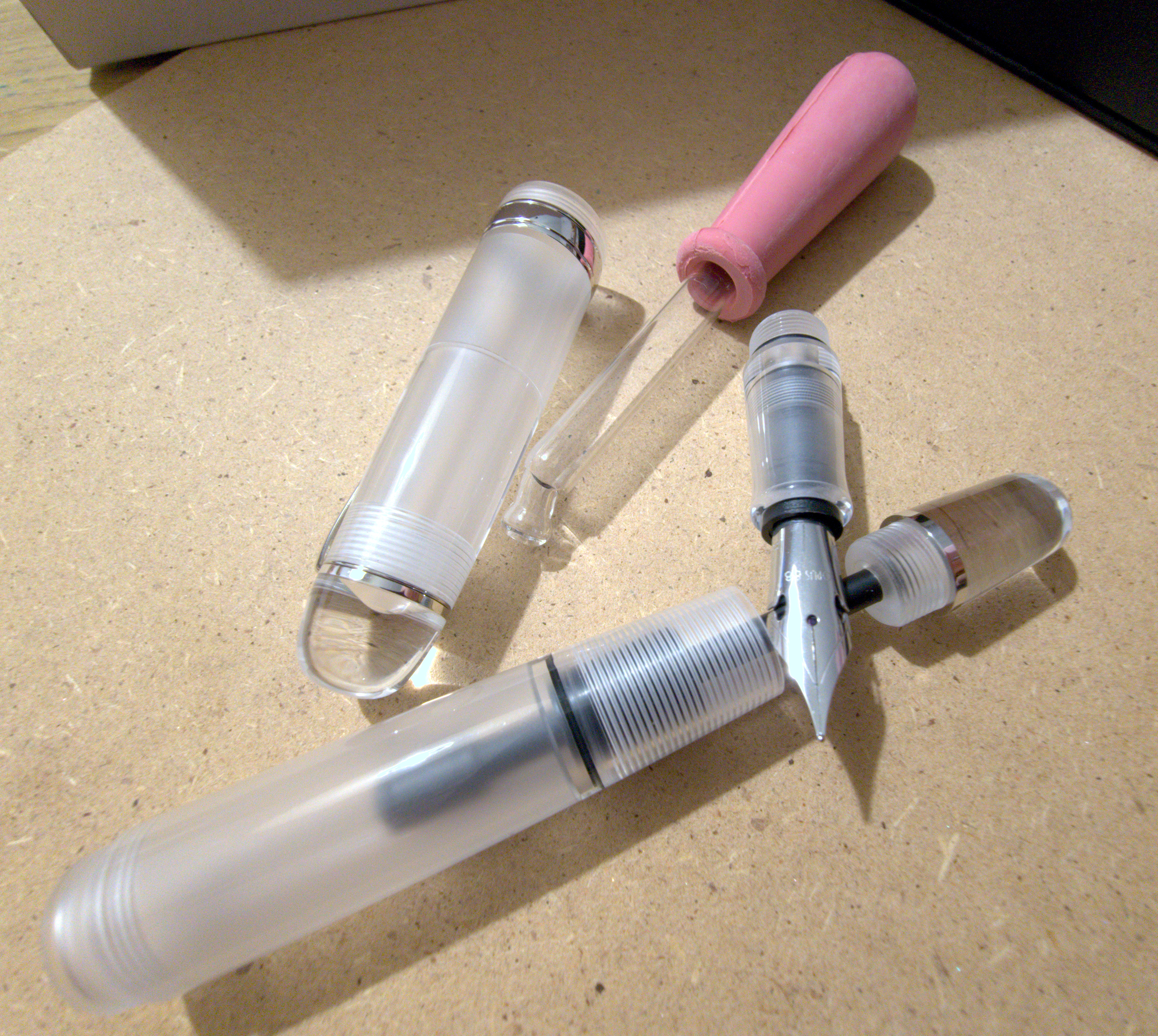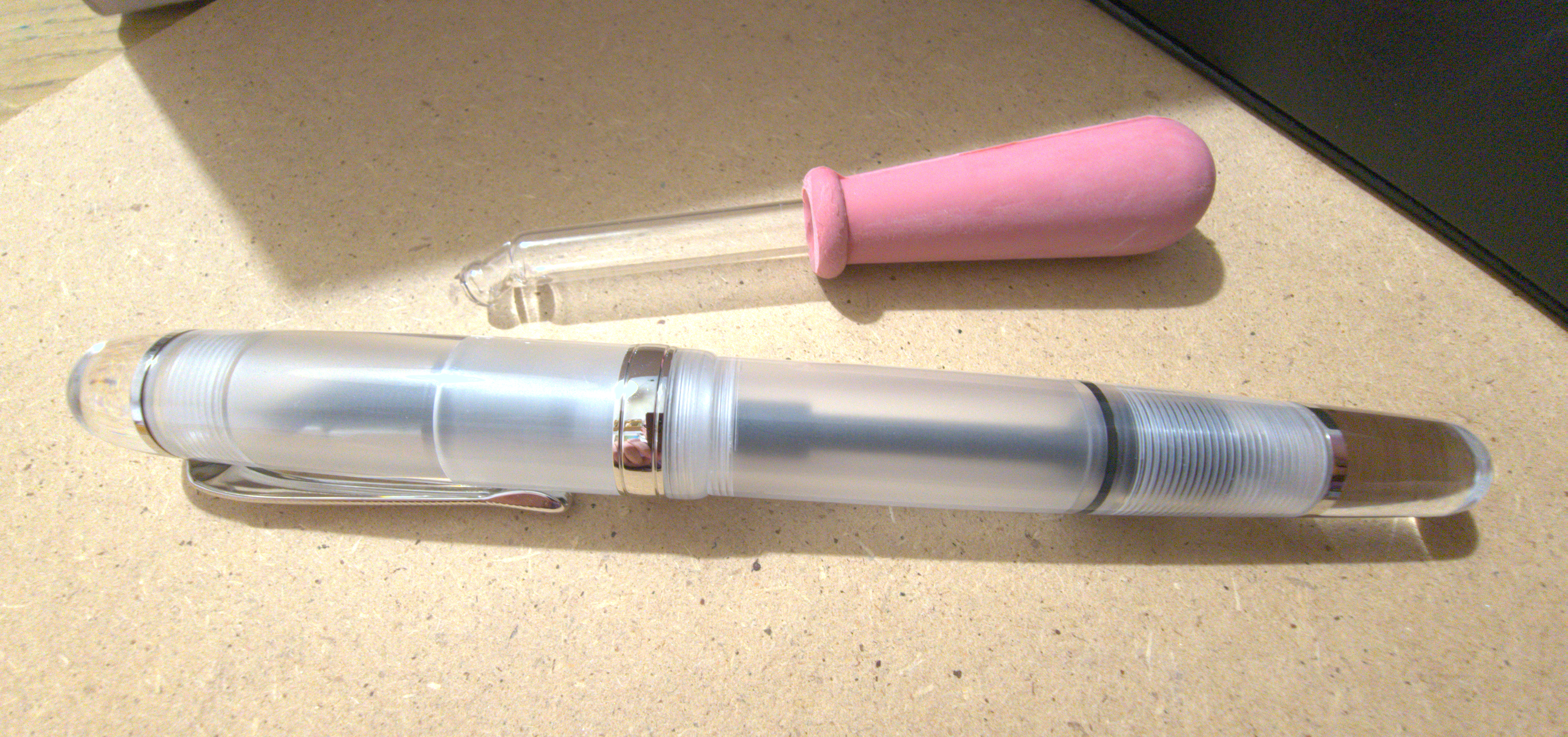 Complessivamente, questa penna mi piace molto, incontra il mio gusto estetico, è comoda e ha il grande pregio di non essere legata al pennino con cui viene venduta. Il sistema eyedropper non è il mio preferito ma vedere l'inchiostro muoversi libero nel corpo della penna fa sempre una bella scena.